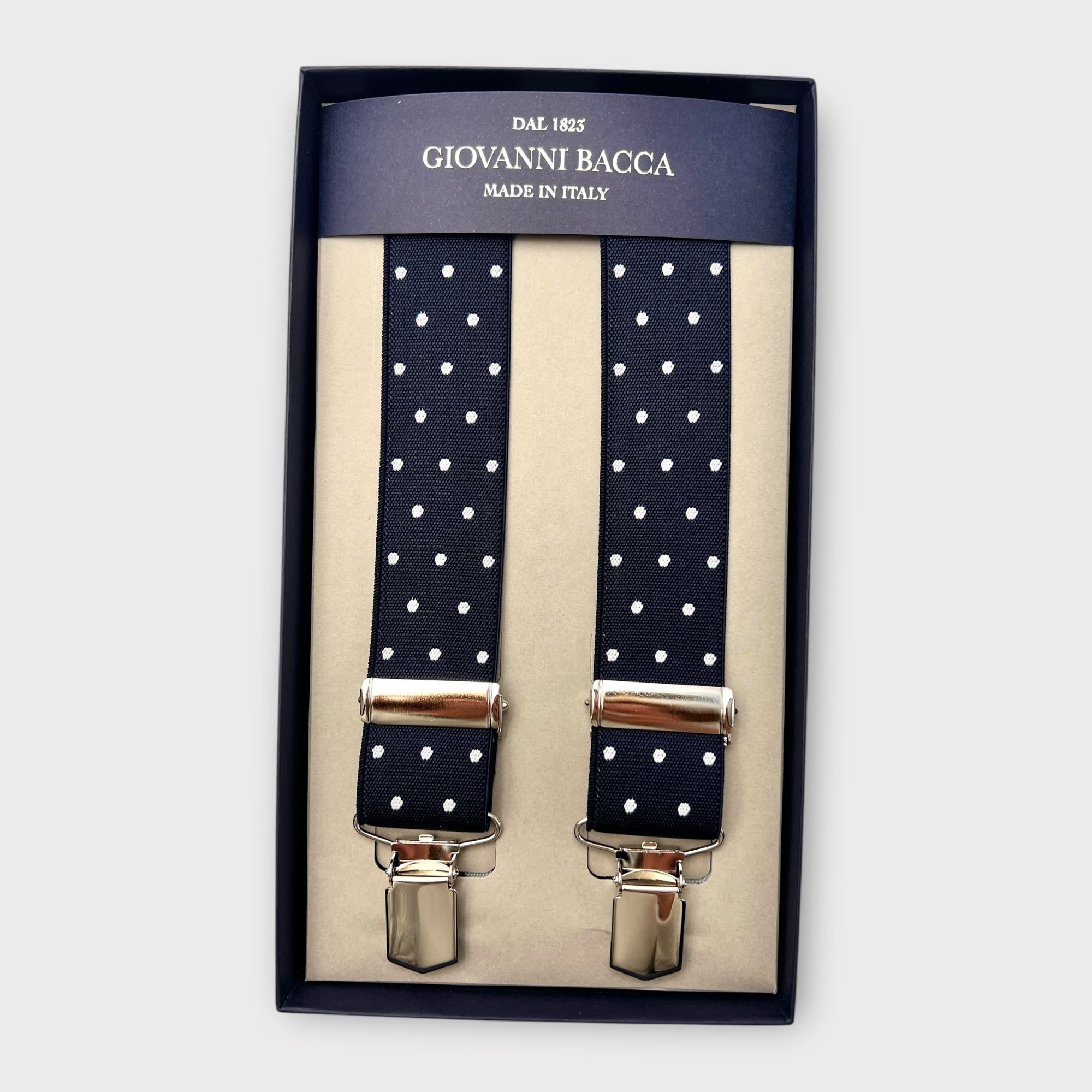 Breite elastische Hosenträger mit blau gepunktetem Clip