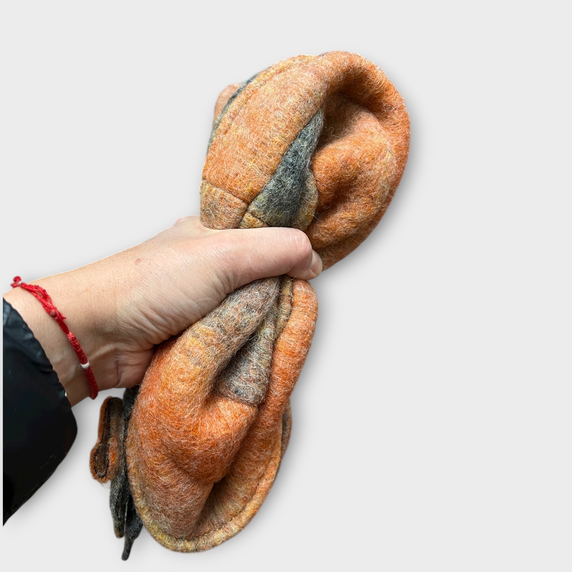 Cloche in lana cotta sfumata con fiore spilla, fodera in pile e ala piccola. Calda, morbida e pieghevole, Made in Italy, perfetta per l’inverno.