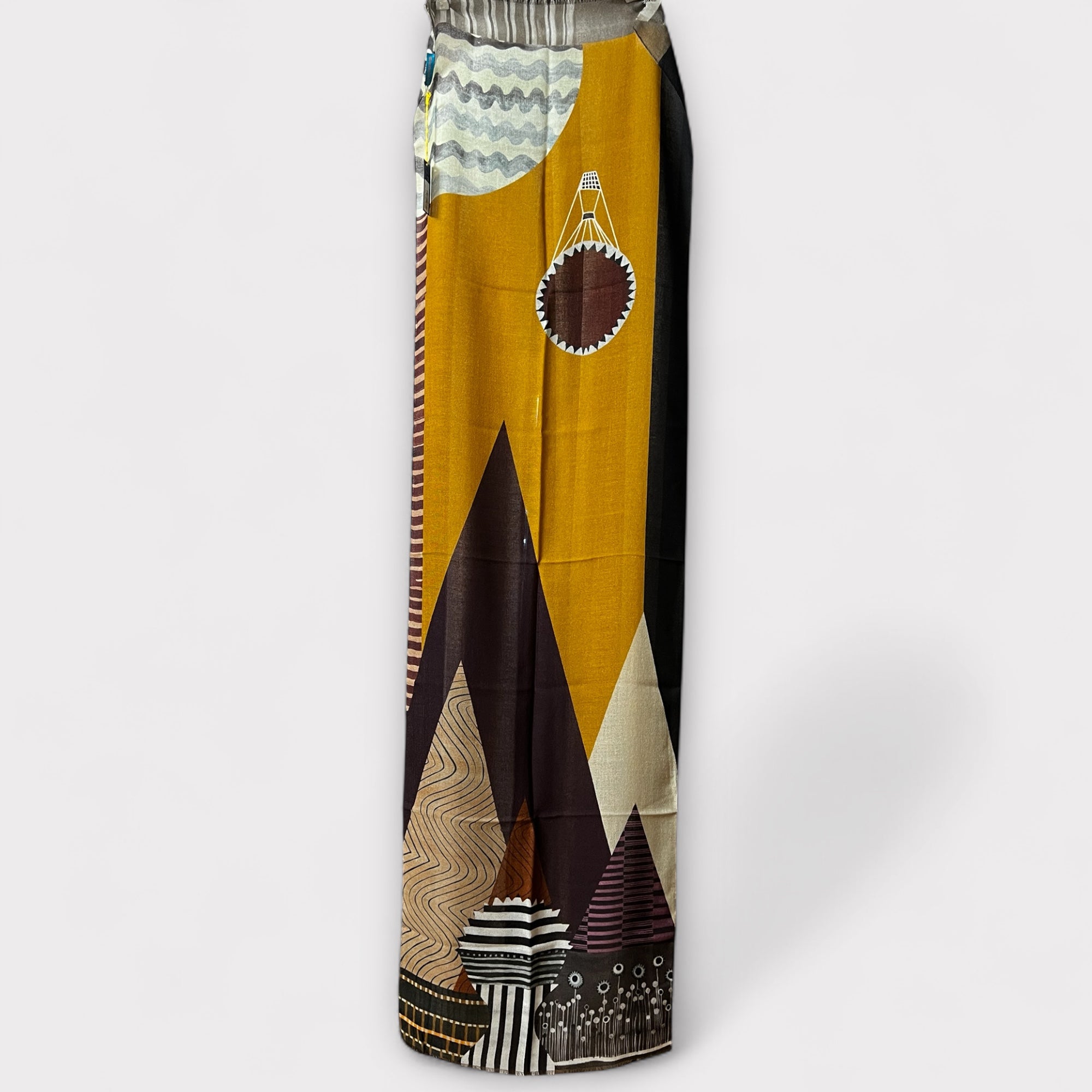 Sciarpa in pura lana leggera e sottile, con grafica geometrica e motivi stilizzati. Morbida e calda, misura 55 x 190 cm. Disponibile nei colori rosa, verde, blu e ocra. Made in Italy – Barbieri.