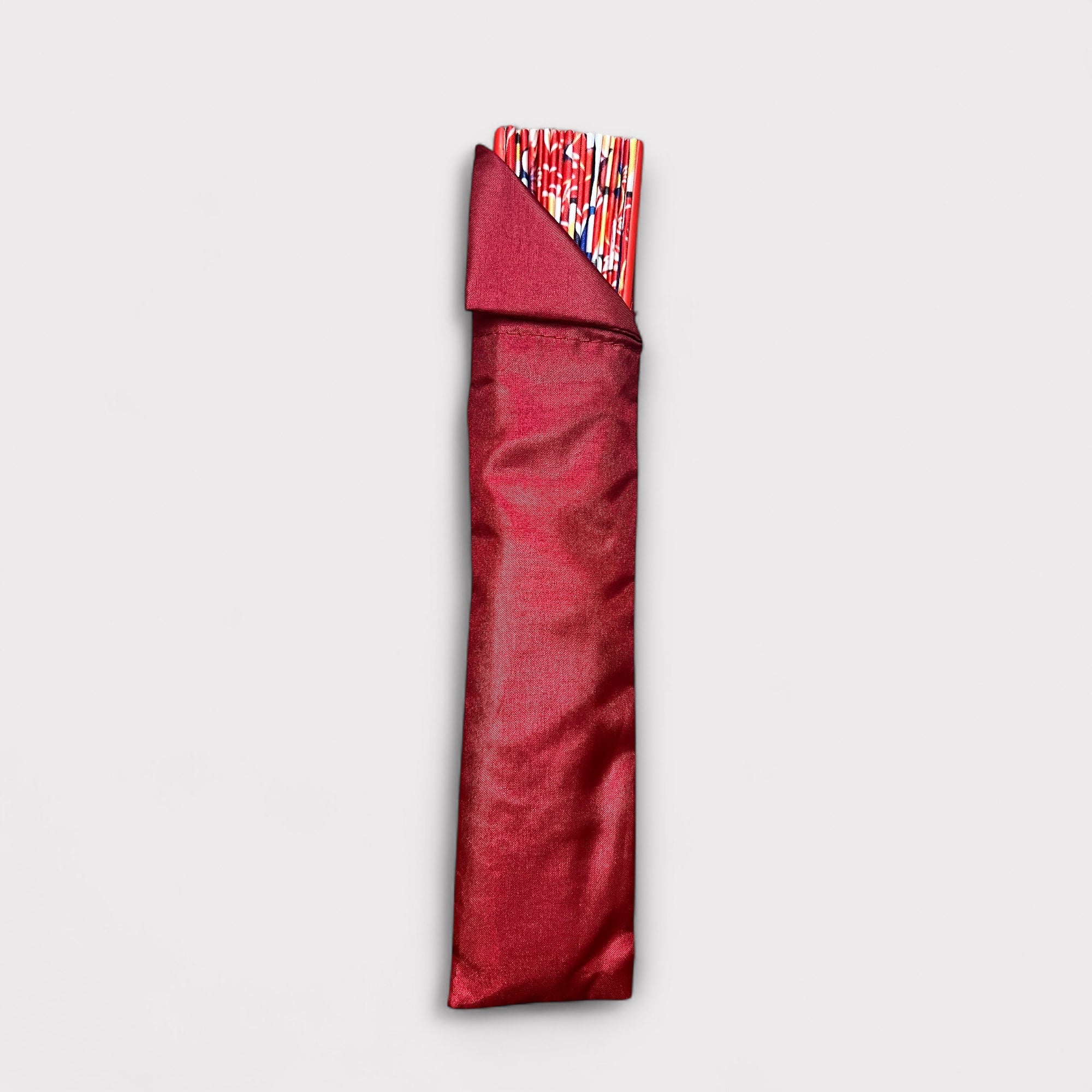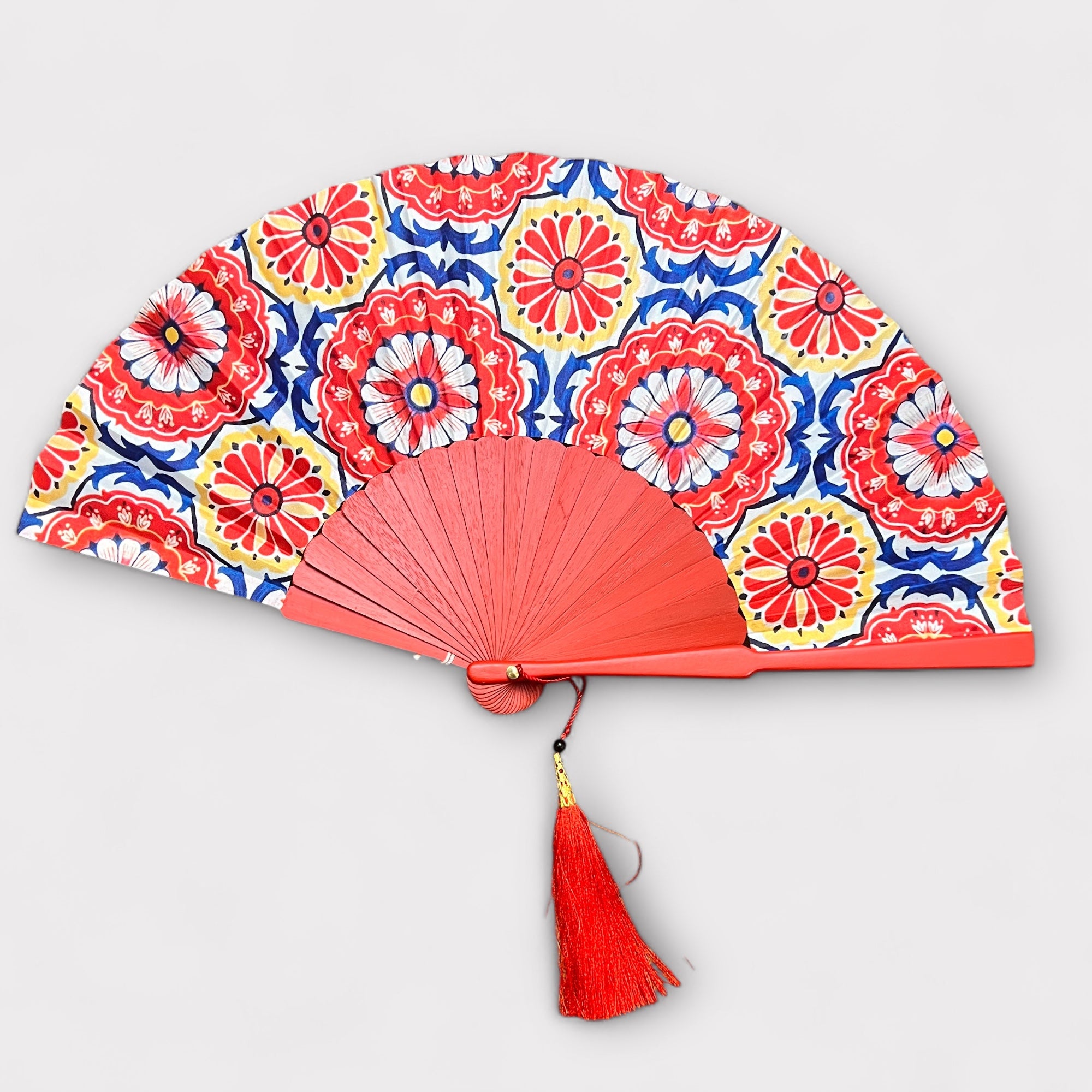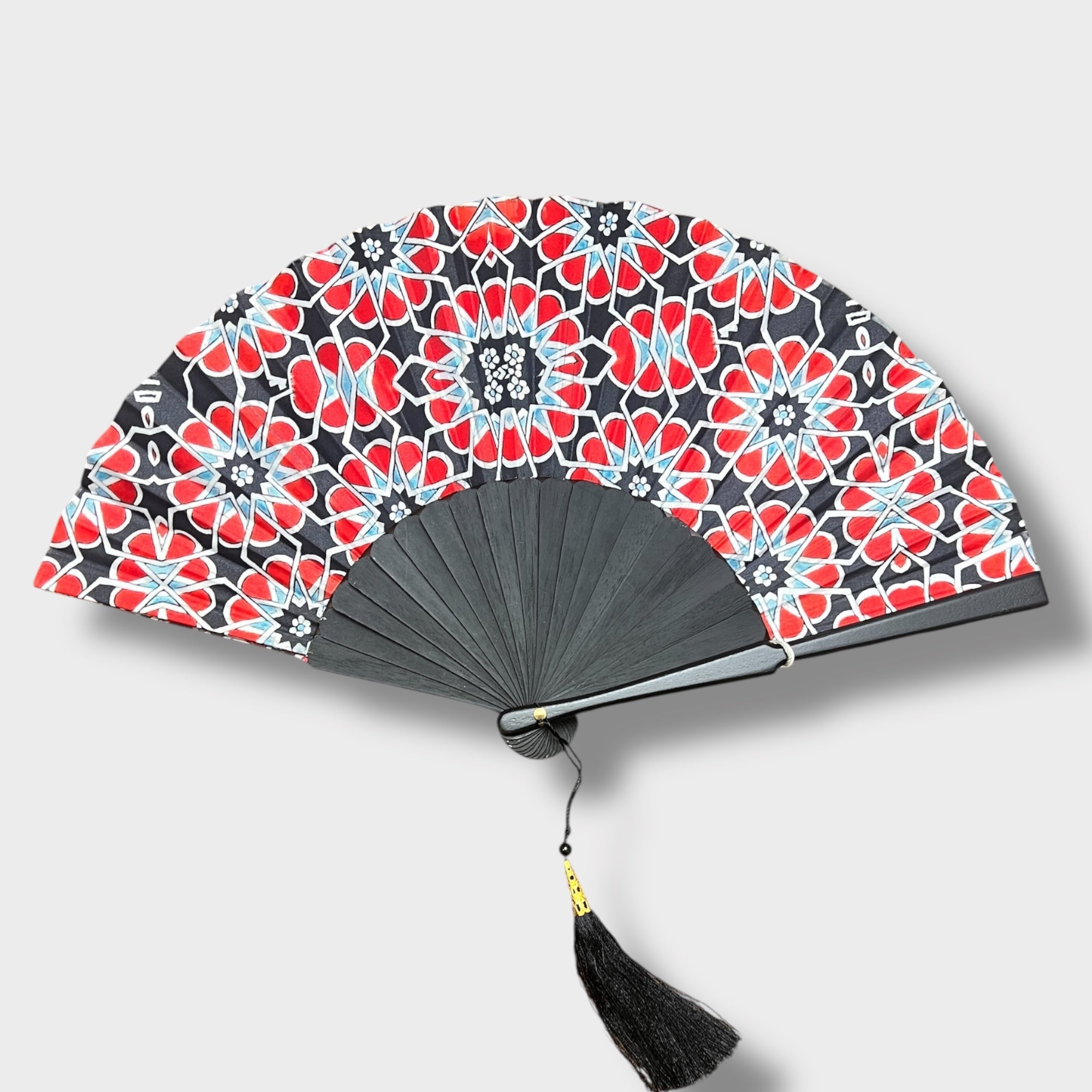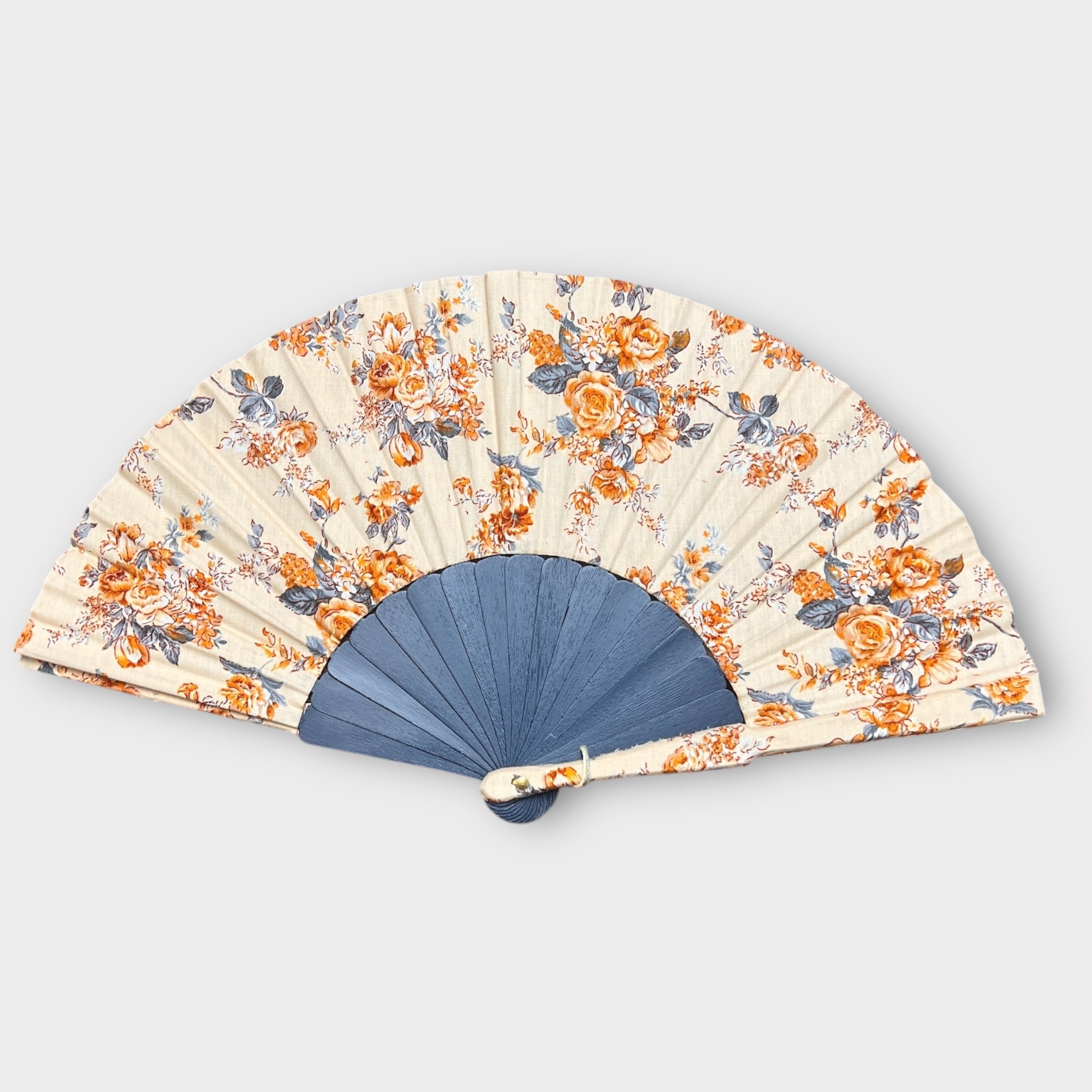 Ventaglio in seta e legno lavorato a mano, diametro 37 cm. Elegante, leggero e resistente, completo di fodero protettivo.