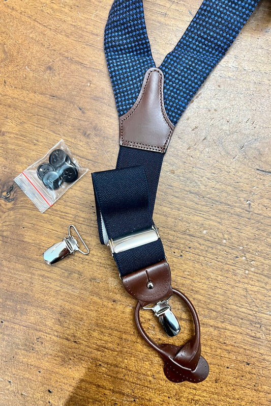 Bretelle artigianali Made in Italy in vera pelle blu e tessuto rigato elastico. Regolabili, eleganti, con clip o asola per un look raffinato e versatile.