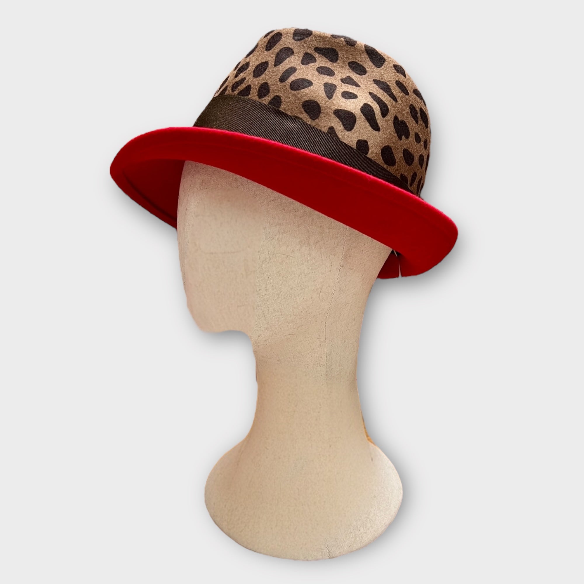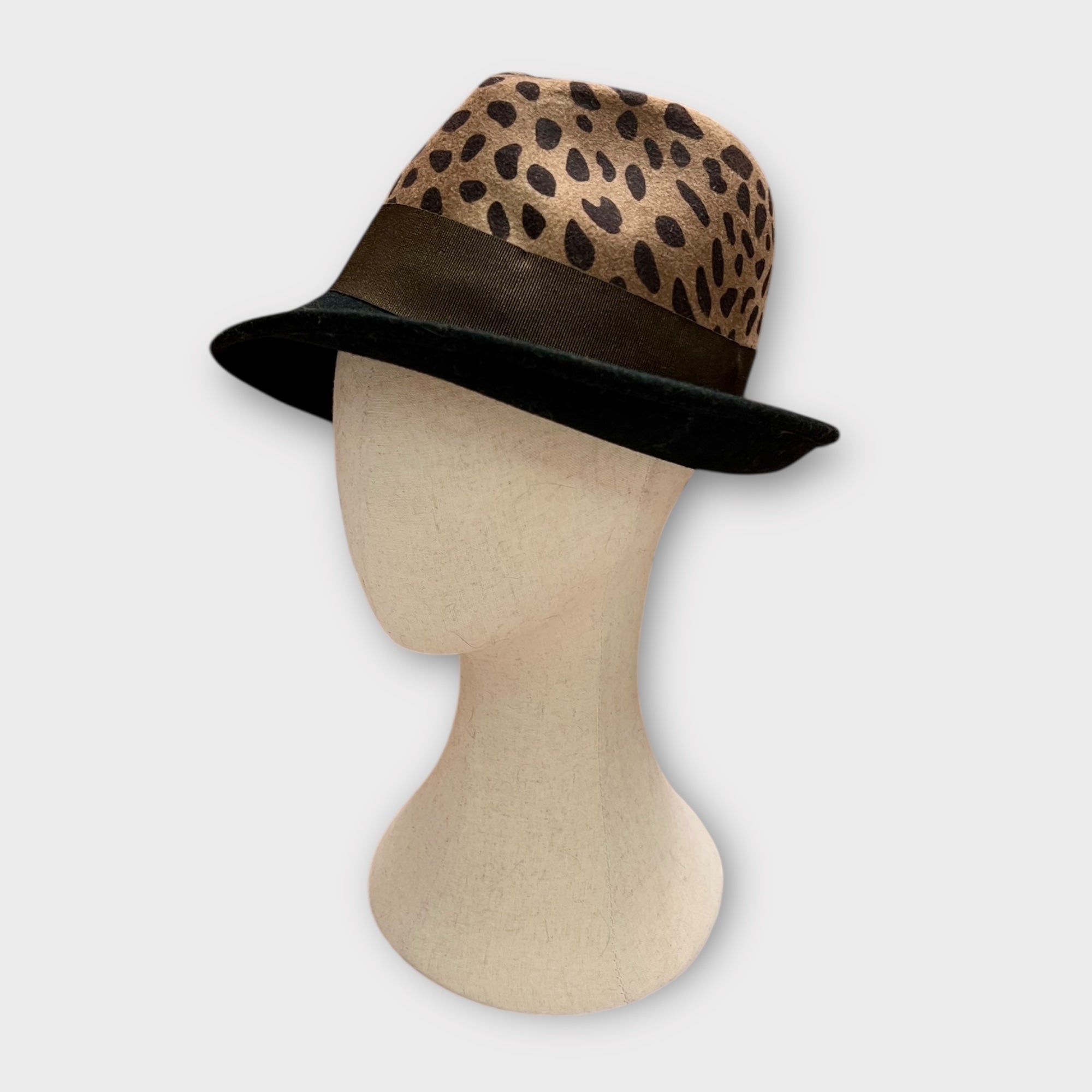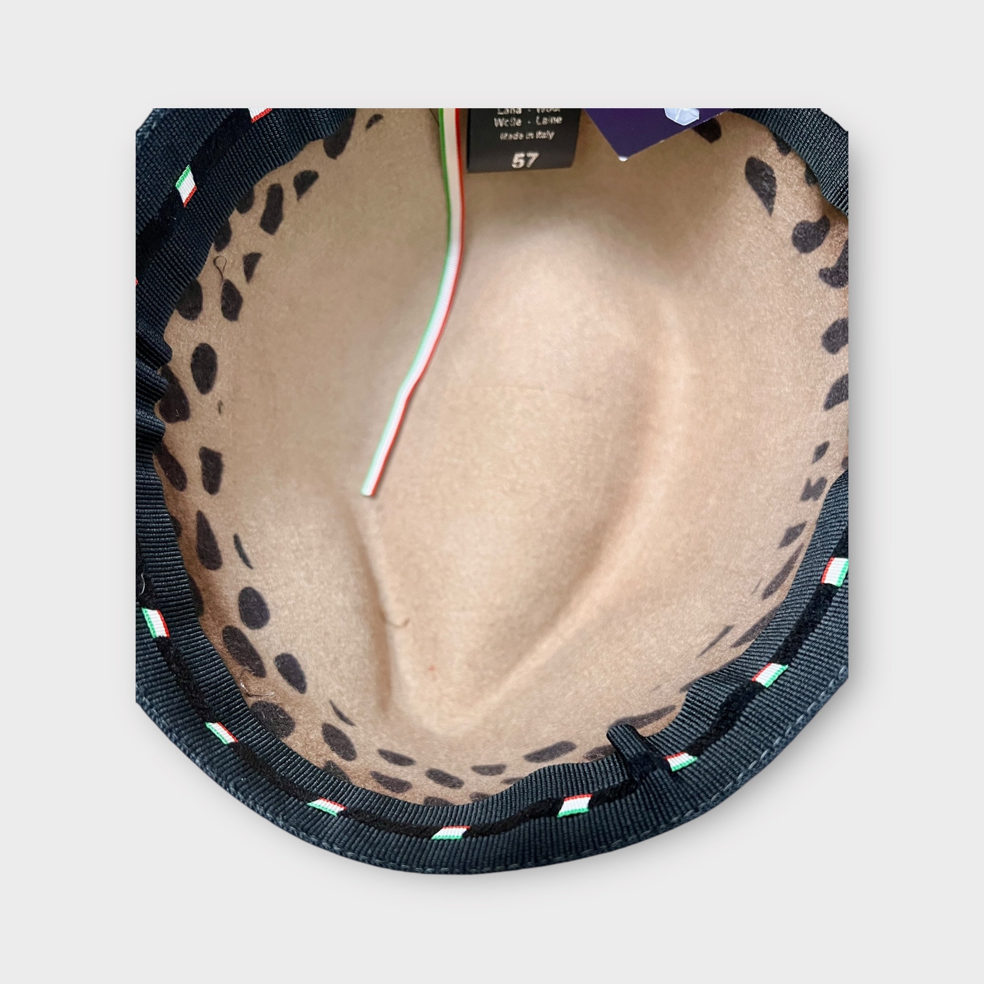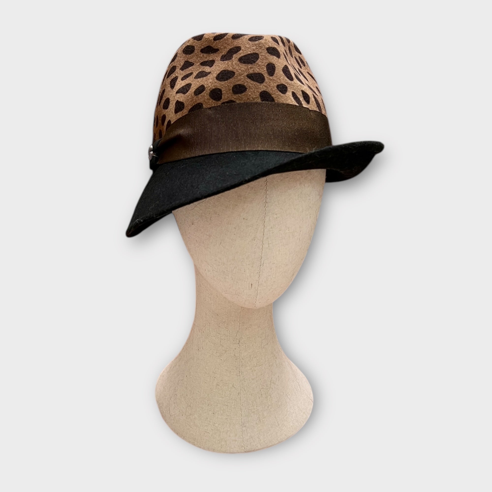 Cappello in feltro di lana con tesa asimmetrica, cupola animalier e fascia marrone scuro. Impermeabile e regolabile, Made in Italy, due varianti.
