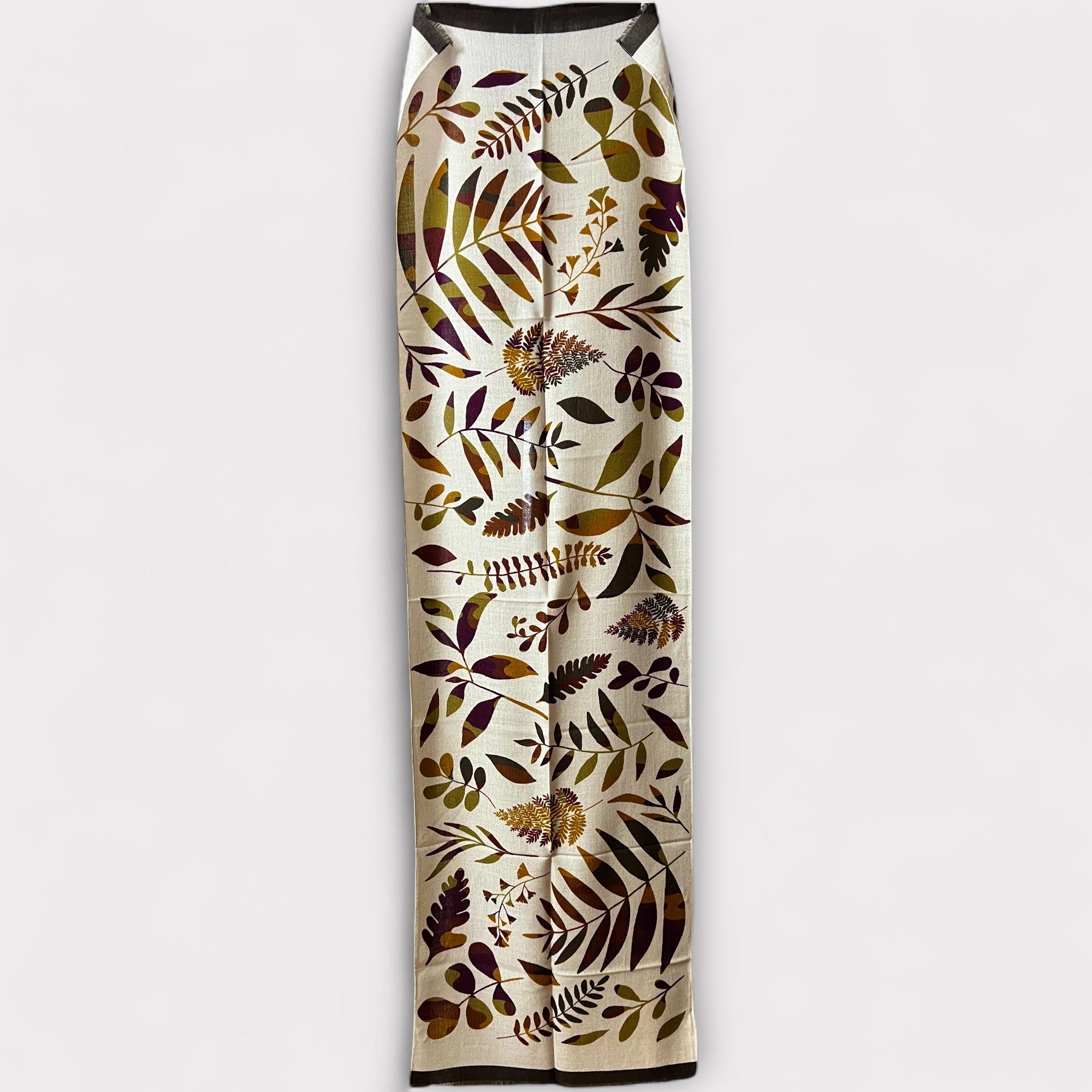 Sciarpa in twill di pura lana, con grafica di rami e foglie stilizzate. Morbida e calda, misura 55 x 190 cm. Disponibile nei colori beige e carta da zucchero. Made in Italy – Barbieri.