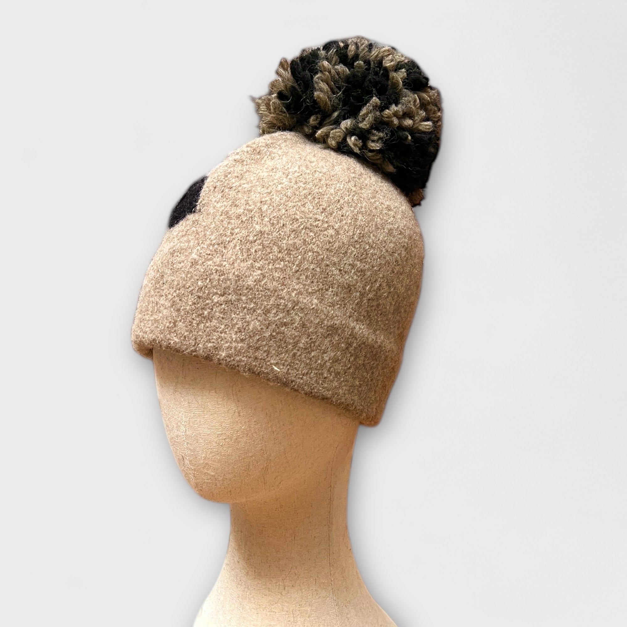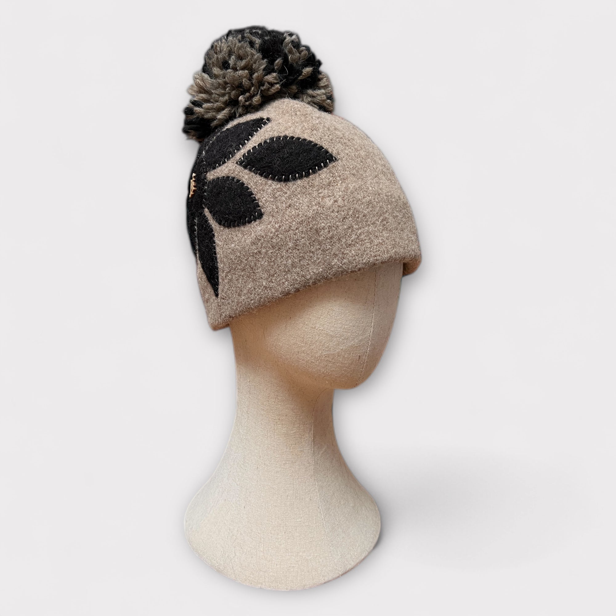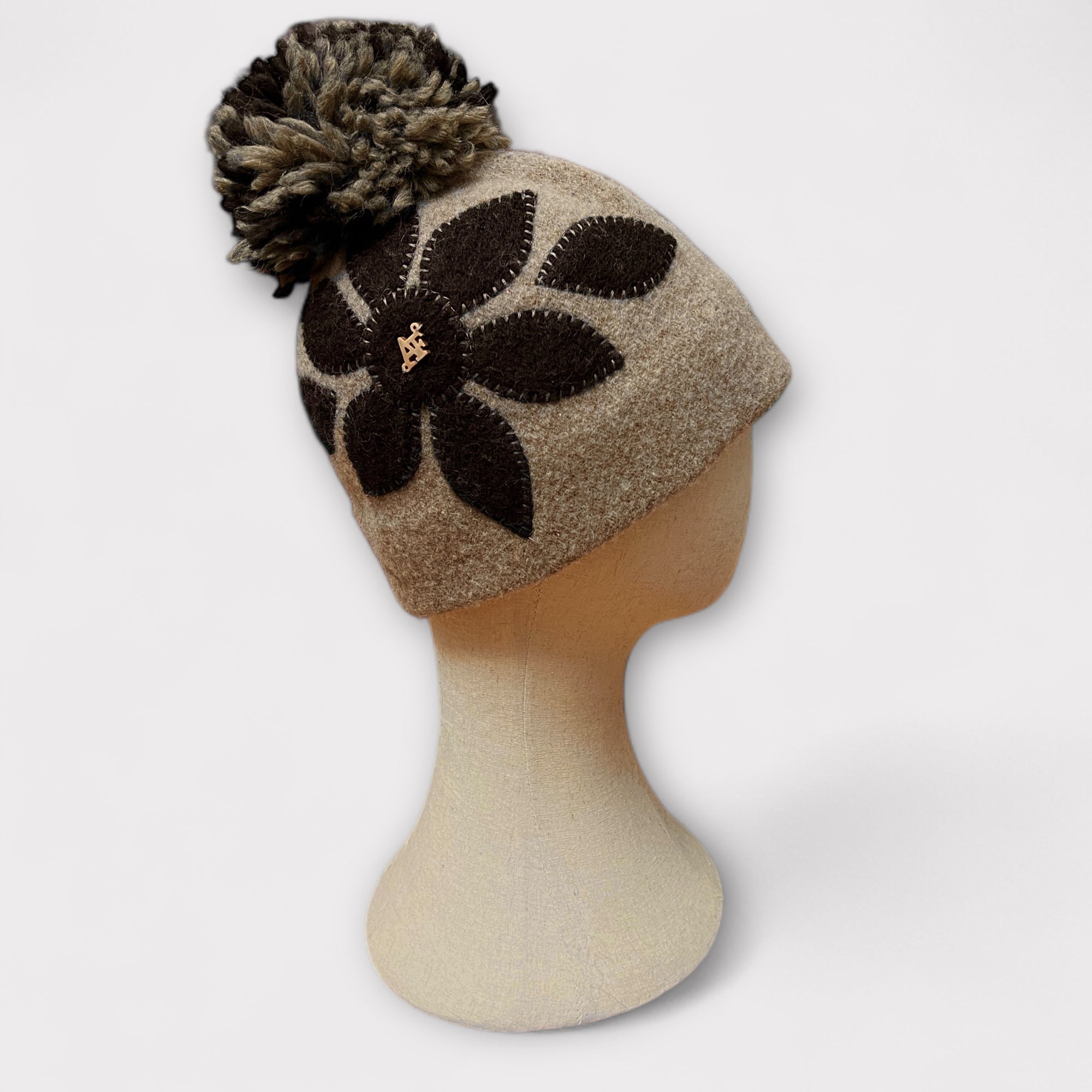 Berretto in lana cotta beige con fiore ricamato e pompon in pura lana. Morbido, caldo e pieghevole, copre fronte e orecchie. Realizzato artigianalmente in Italia.