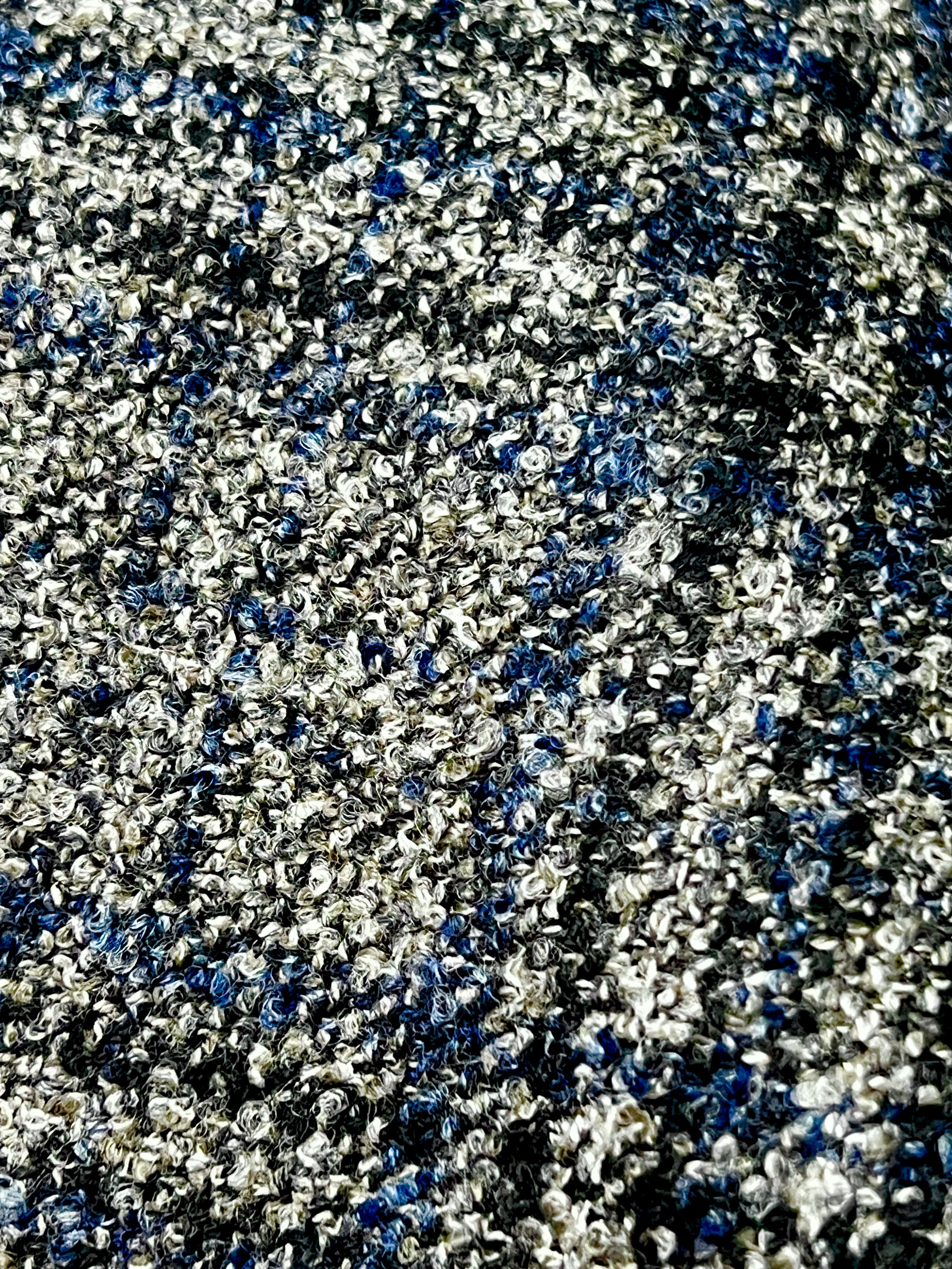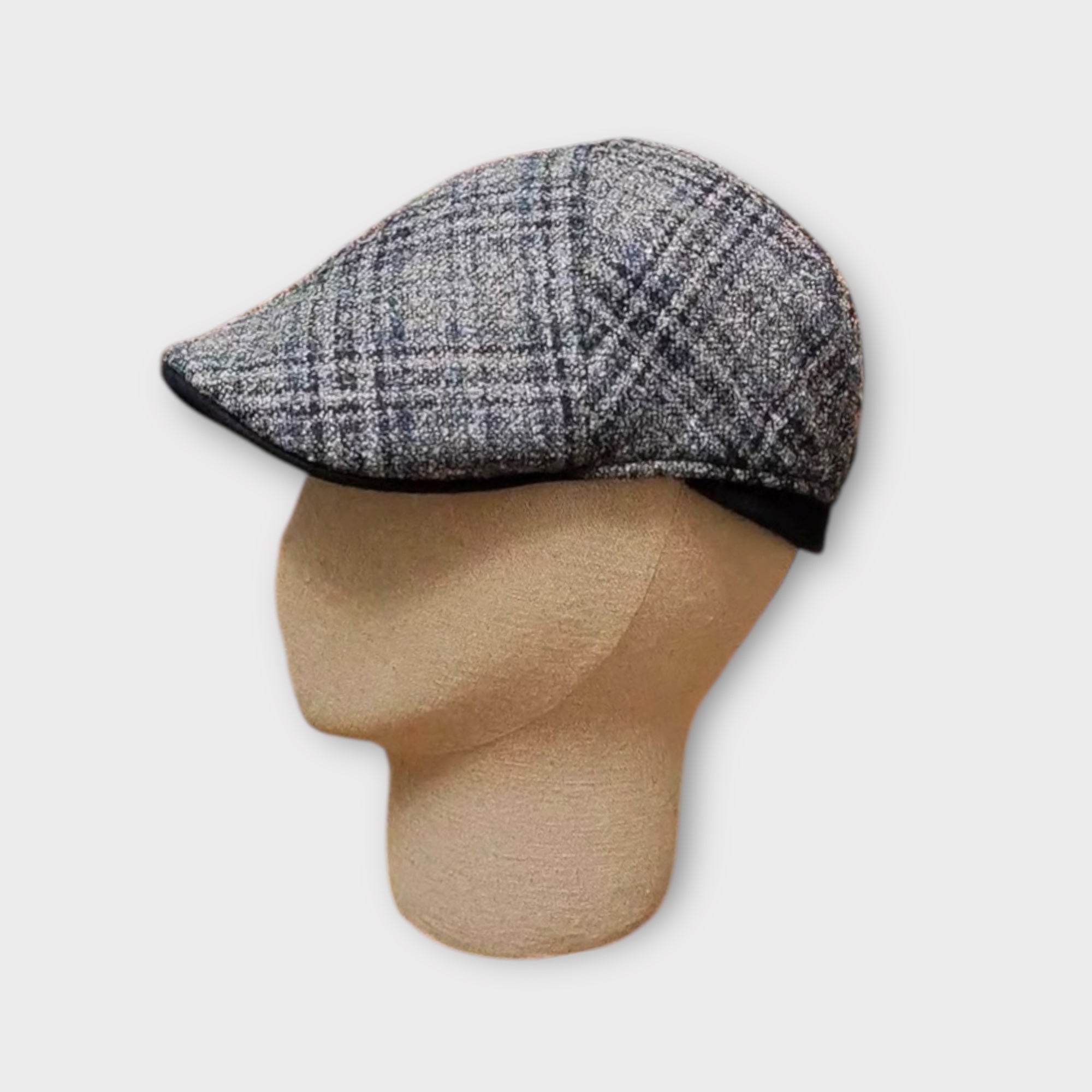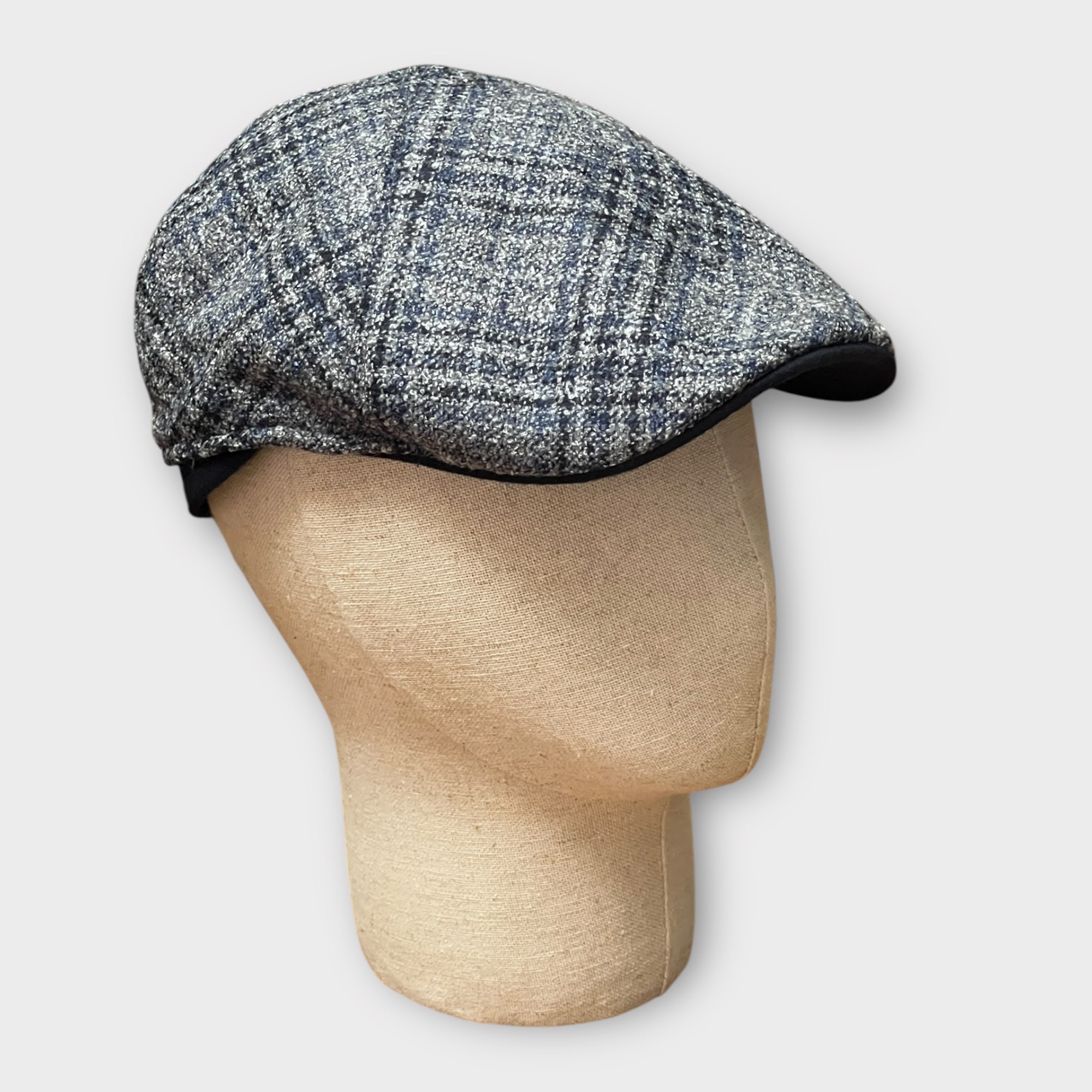 Coppola a 6 spicchi in lana e cashmere, motivo scozzese grigio con dettagli blu e nero. Visiera e bordino blu scuro. Made in Italy.
