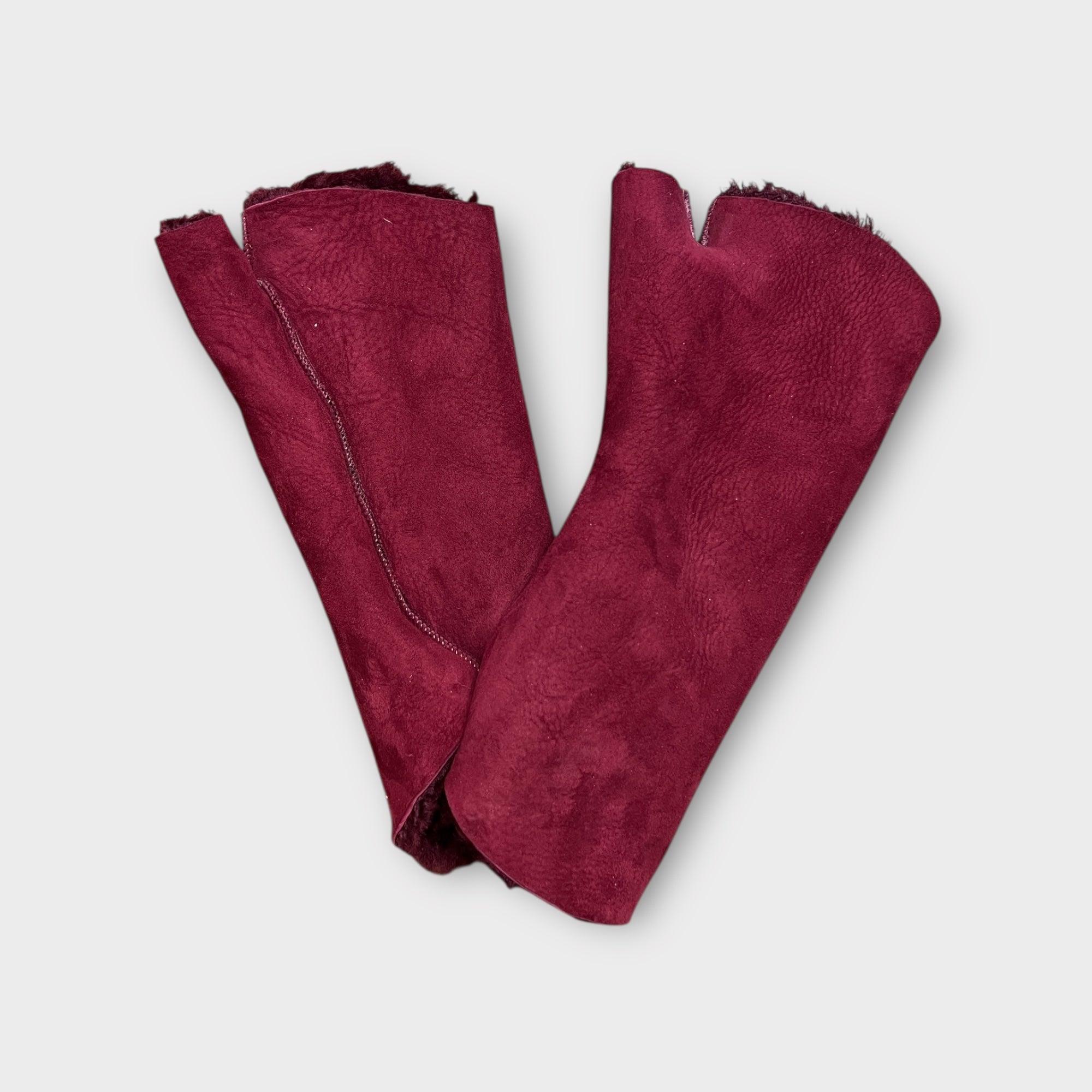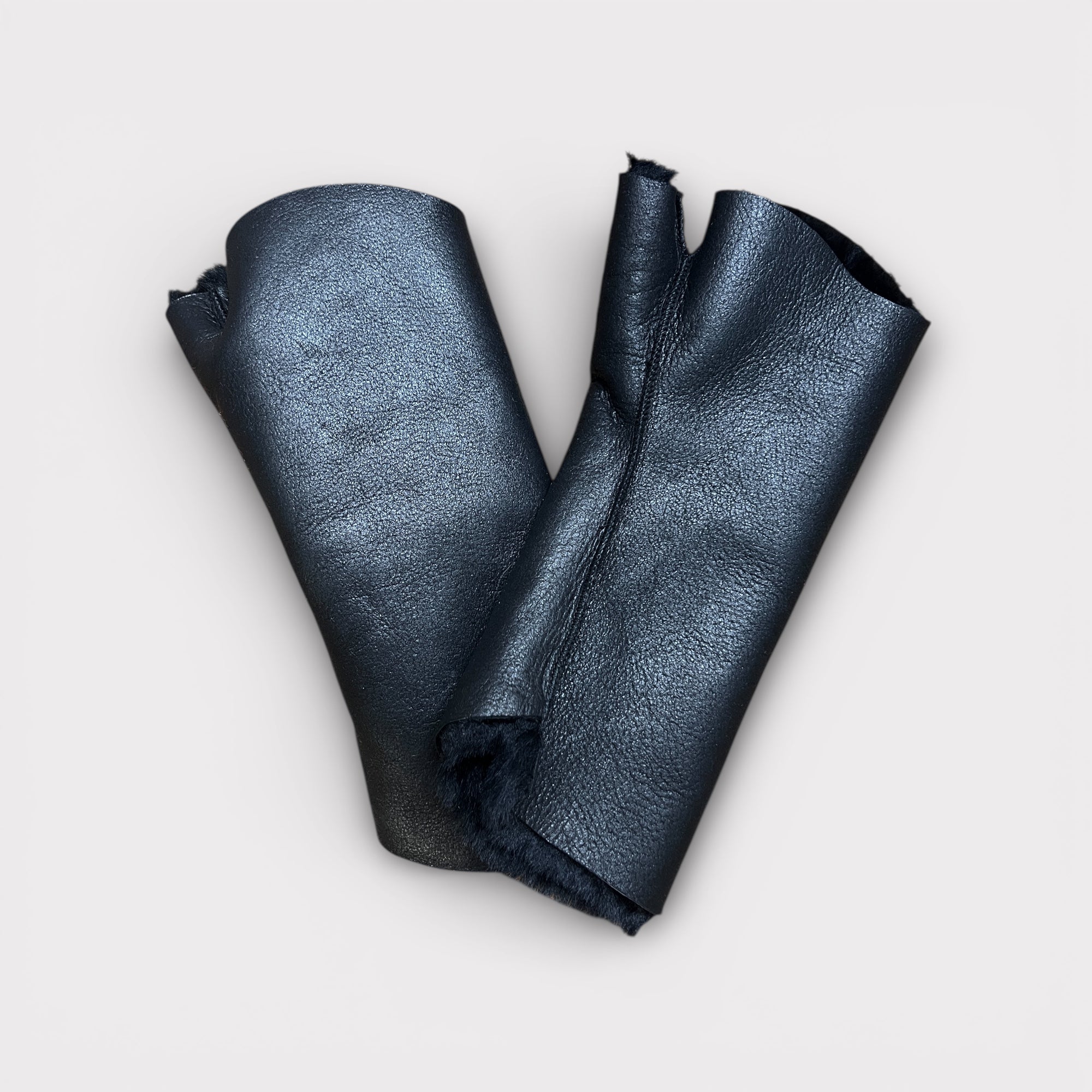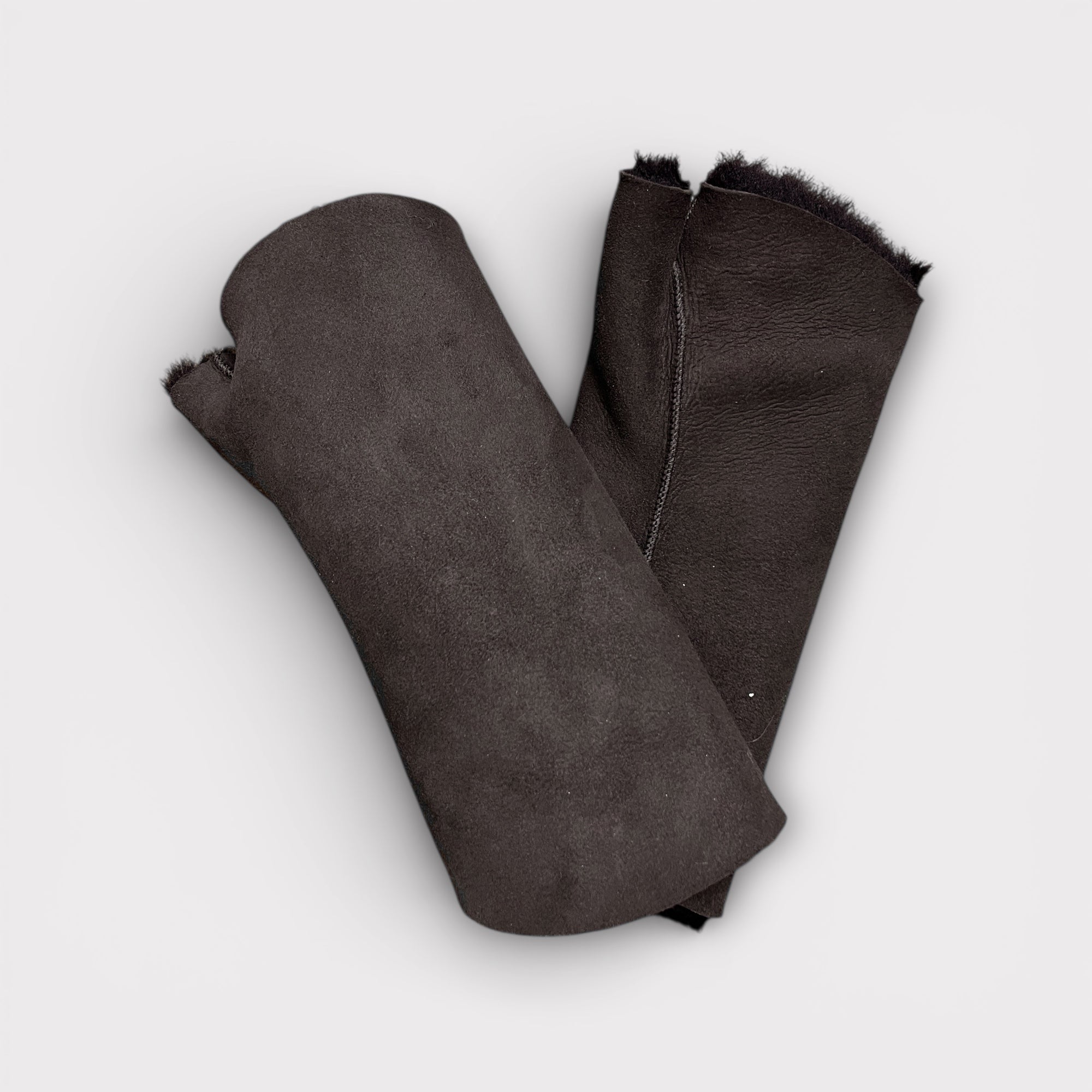 Manicotti in vero montone senza dita con pollice semi coperto e polso lungo risvoltato, caldi, morbidi e ideali per proteggere le mani senza perdere sensibilità.