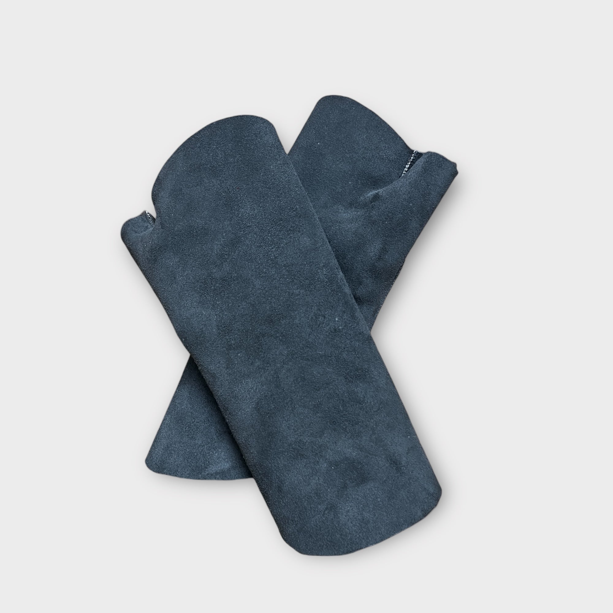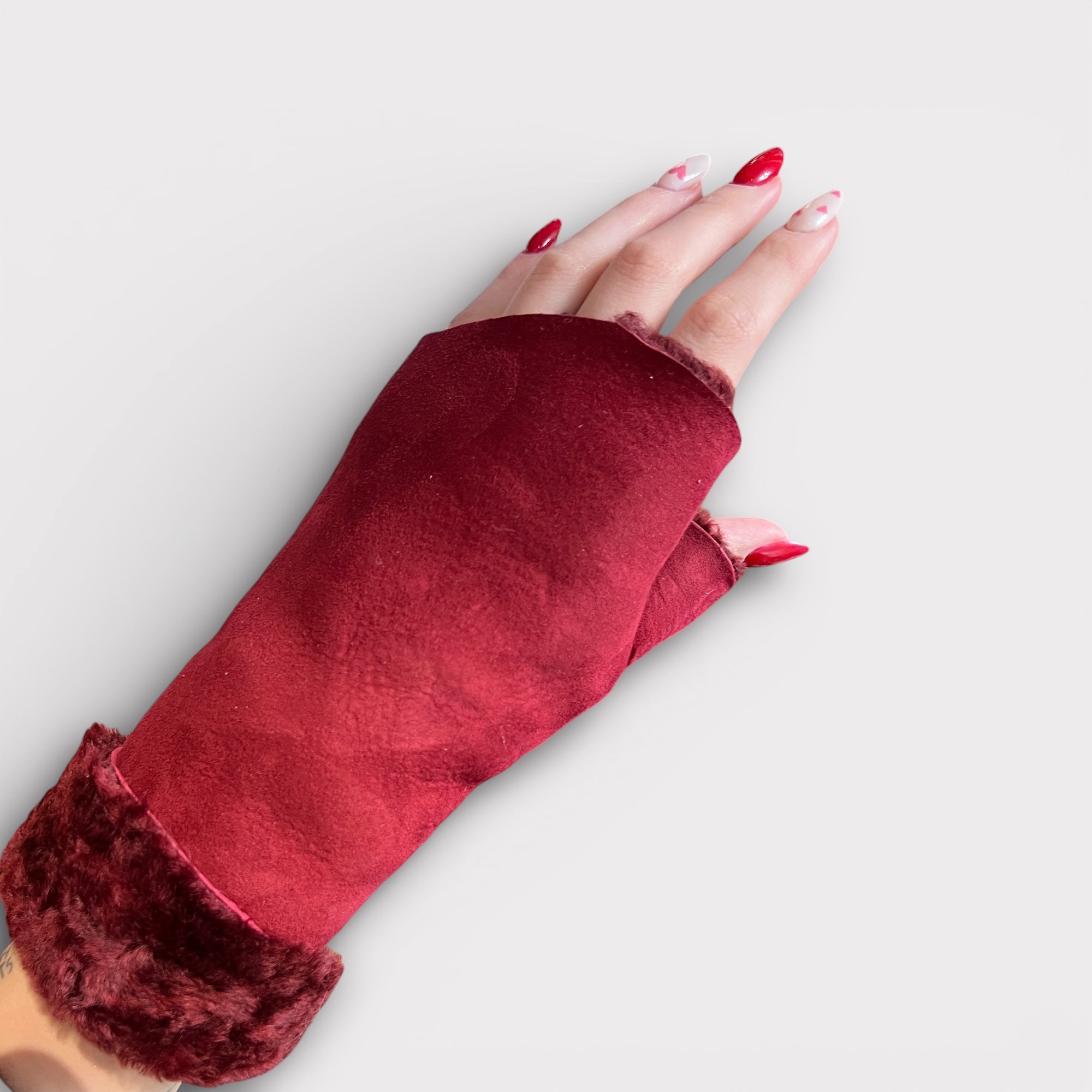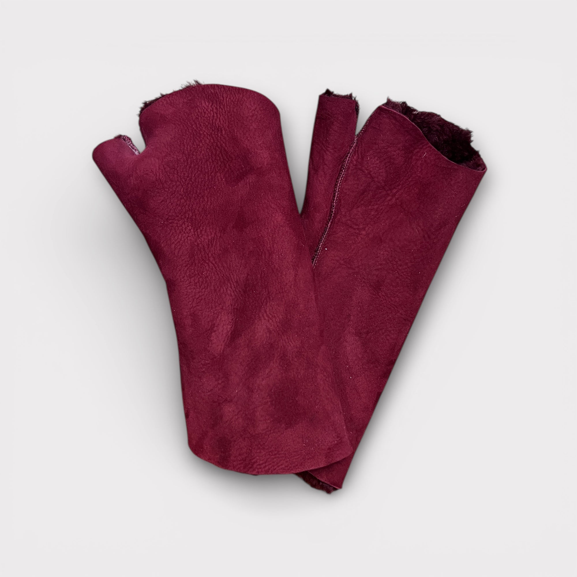Manicotti in vero montone senza dita con pollice semi coperto e polso lungo risvoltato, caldi, morbidi e ideali per proteggere le mani senza perdere sensibilità.