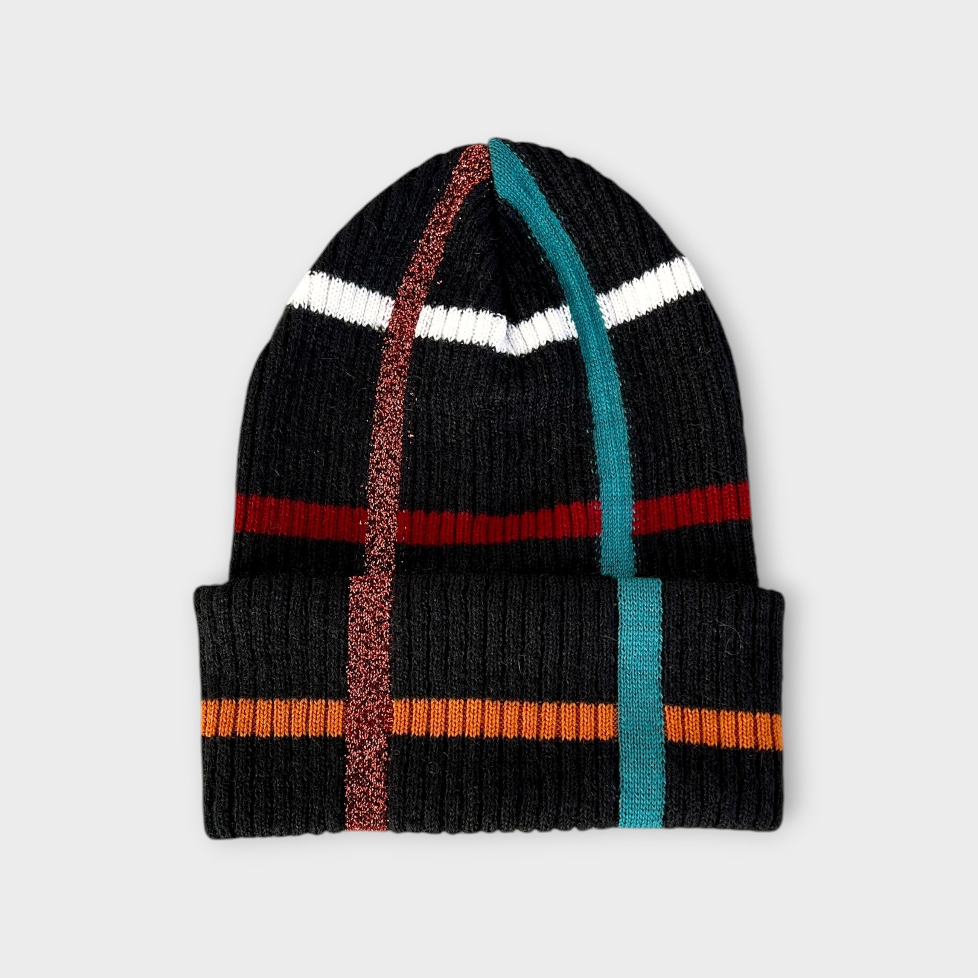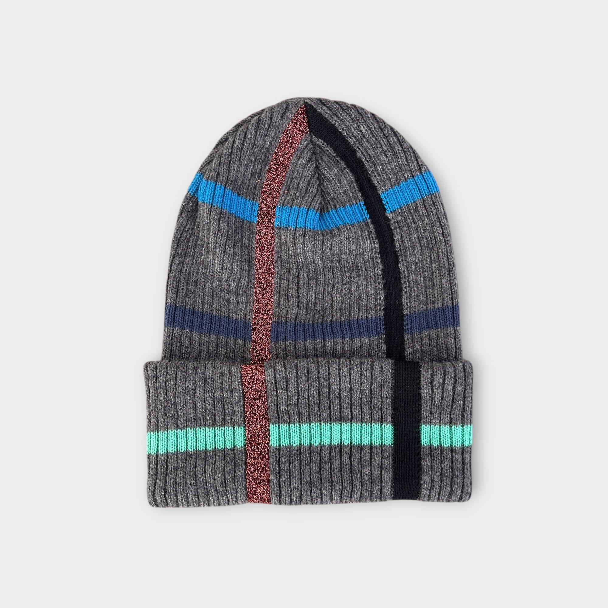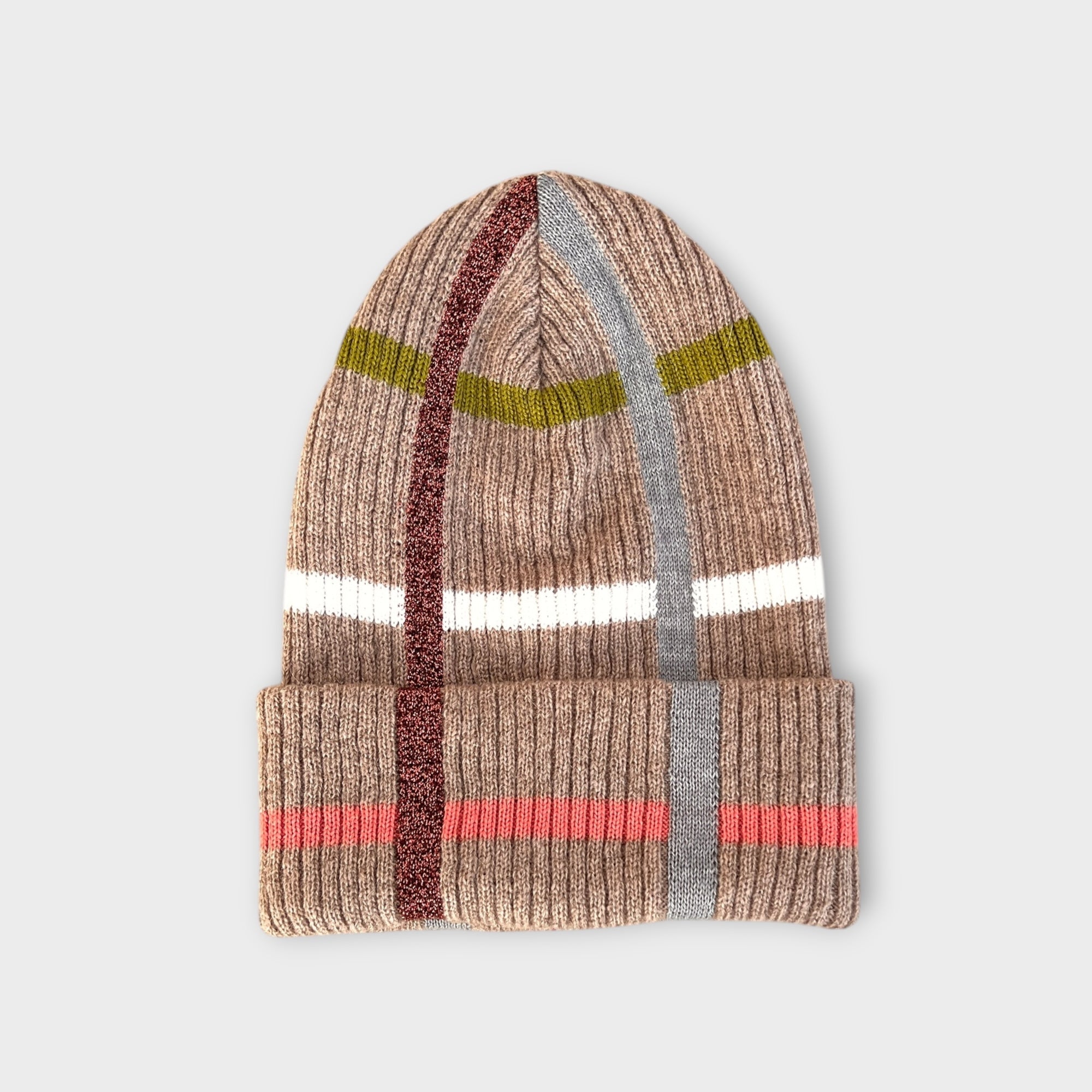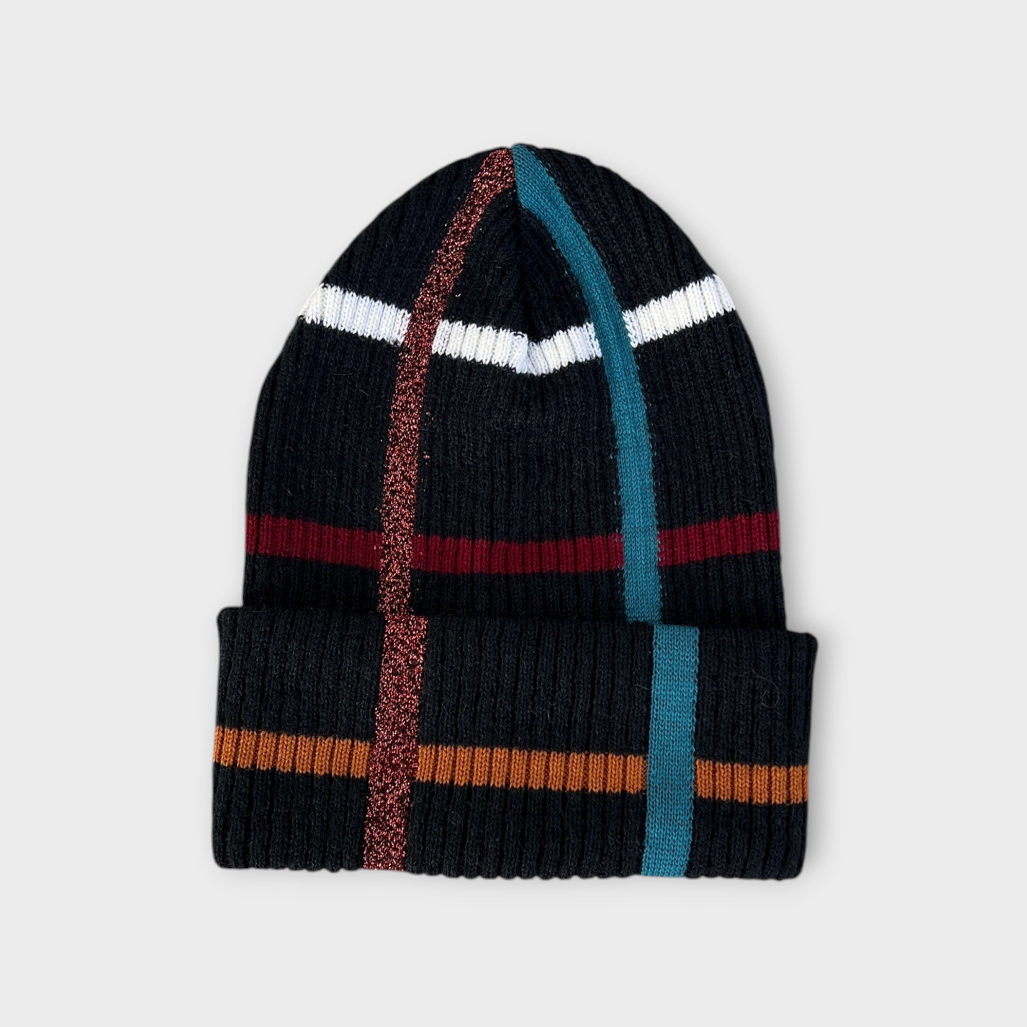 Berretto in maglia di lana con motivo tartan e riga lurex. Morbido, caldo e moderno, con risvolto ampio da 10 cm. Disponibile in 3 colori.