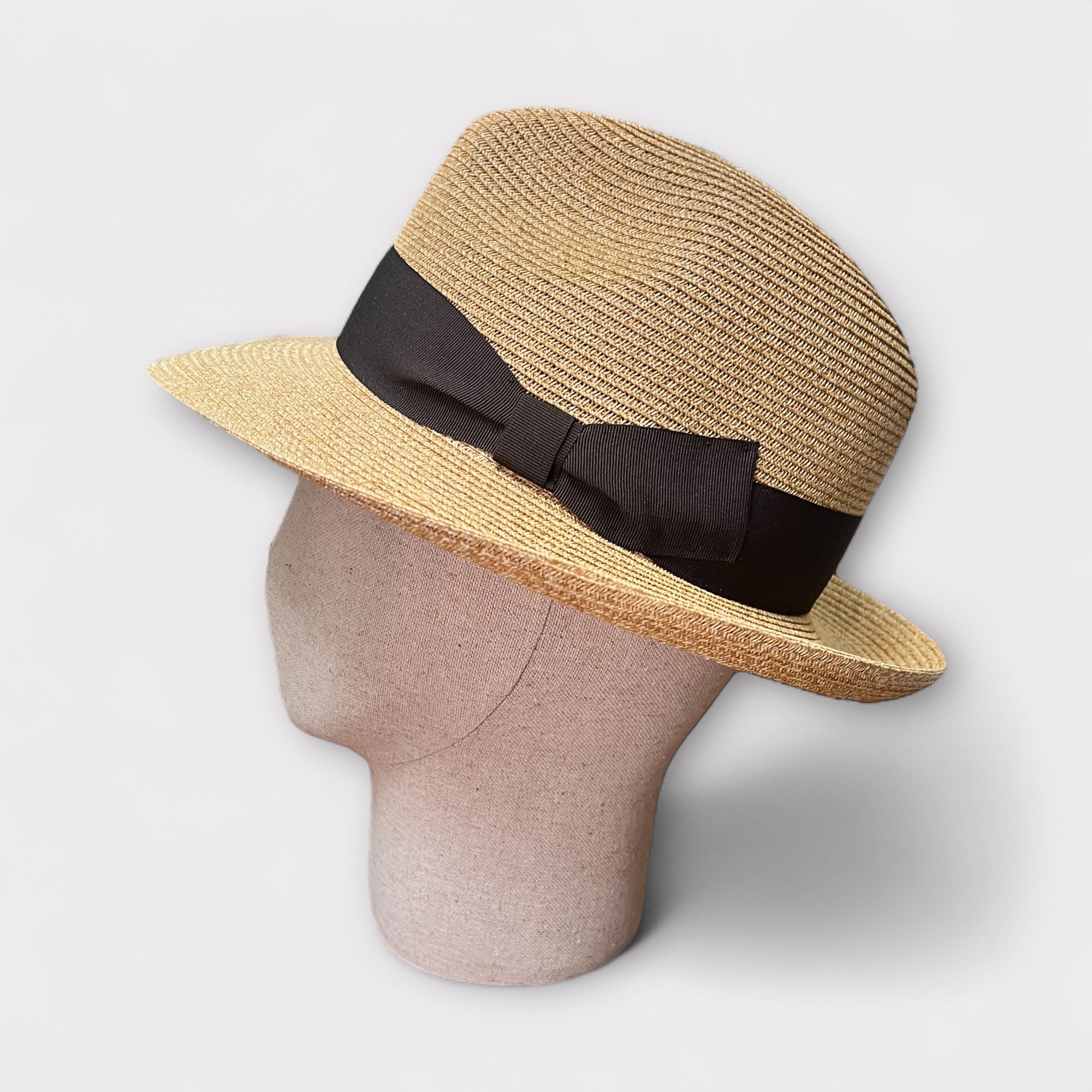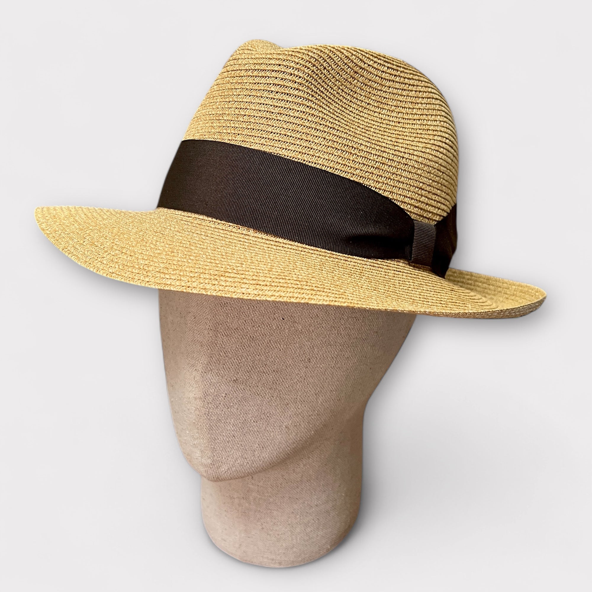 Cappello Fedora unisex in paglia naturale con nastro marrone scuro. Ala 6,5 cm ideale per ripararsi dal sole con stile.