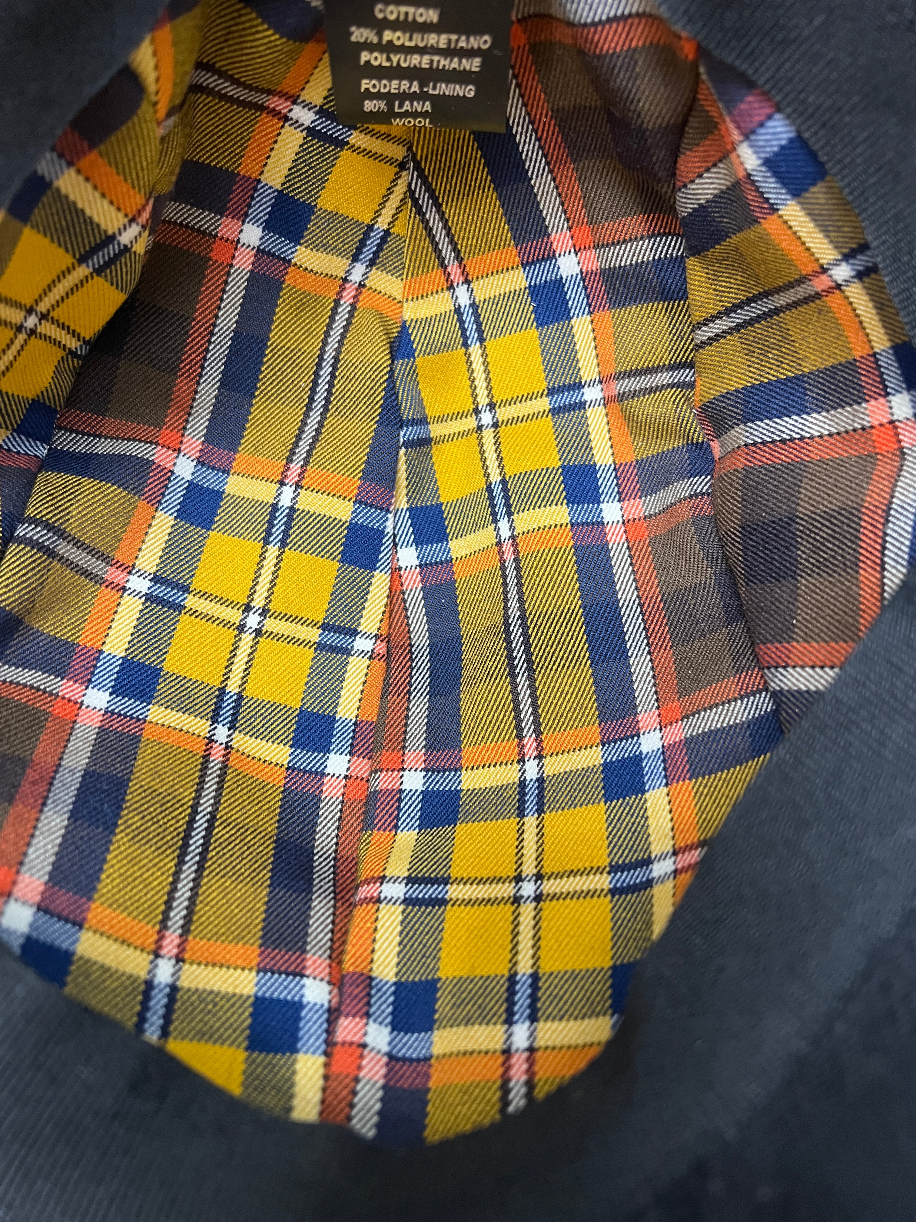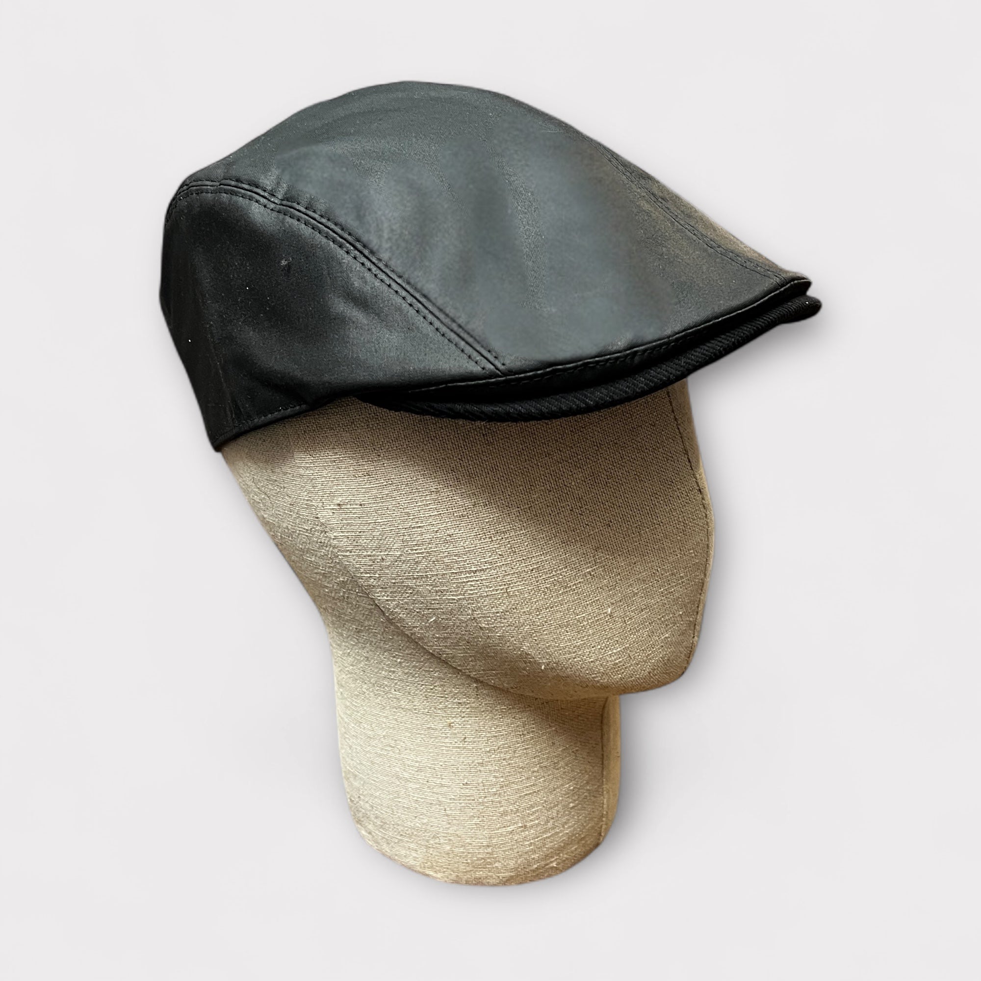 Coppola stretta in cotone cerato colore nero, impermeabile, con fodera in lana a motivo tartan. Linea slim, leggera e resistente. Made in Italy.