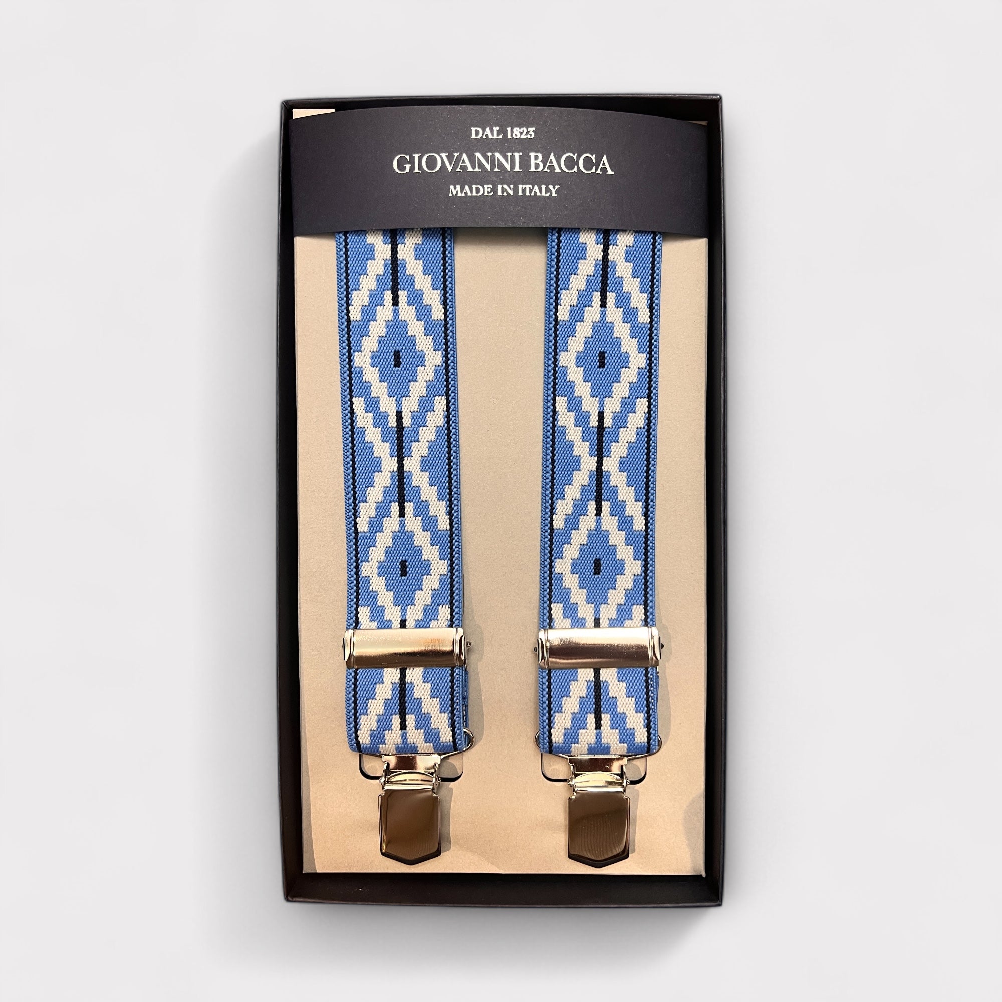 Bretelle elastiche azzurre con disegno Navajo. Clip resistenti, dettagli in vera pelle, taglia regolabile. Stile ricercato. Made in Italy.