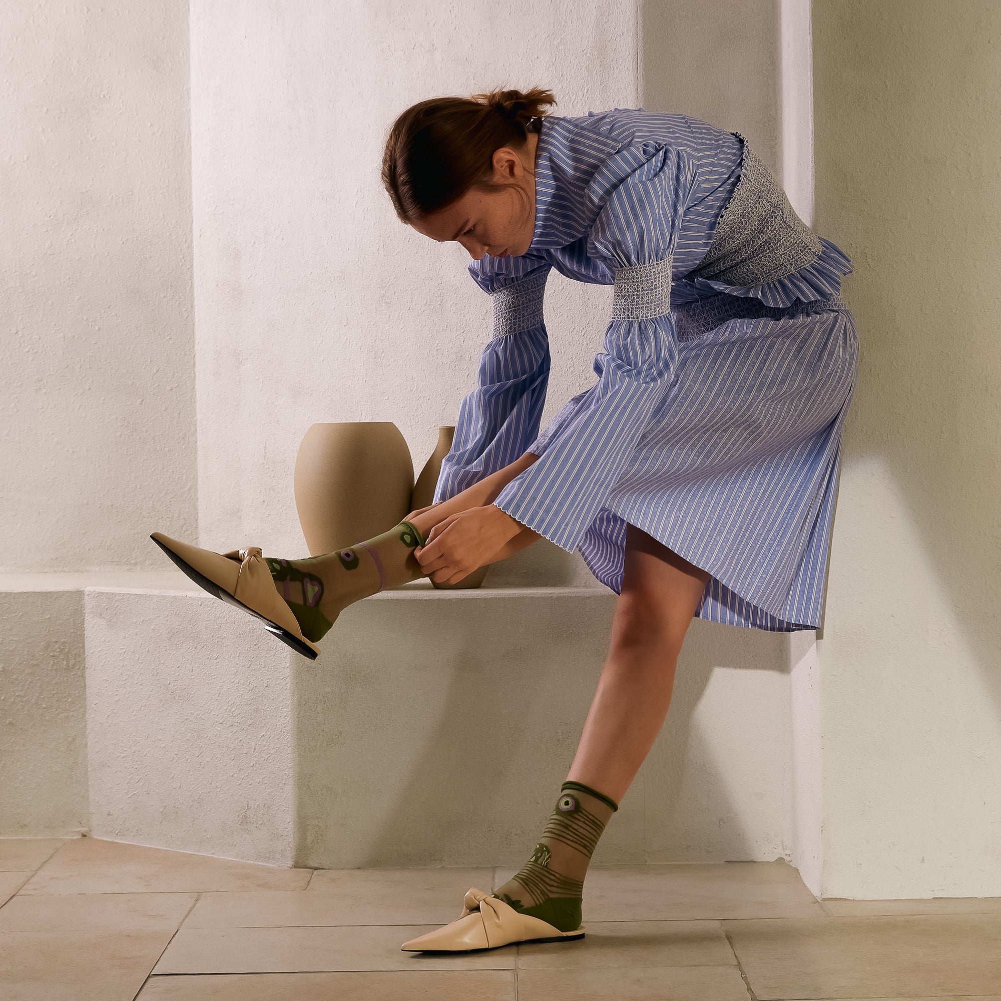 Calzino mezza gamba in cotone e tulle, spaiato (grafica diversa sui due piedi) con motivo foxtail astratto su verde; leggero, traspirante e super trendy. Made in Japan.