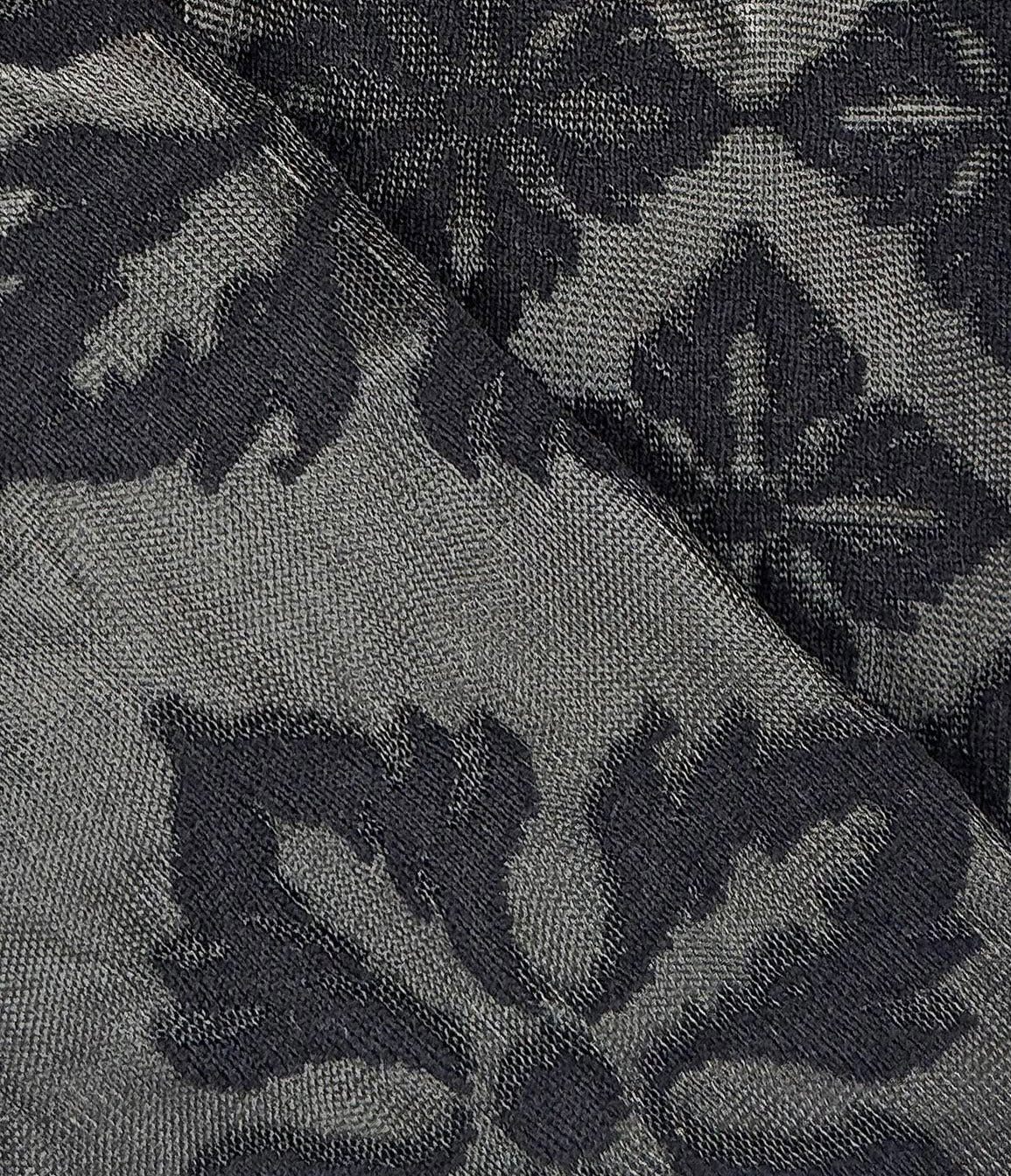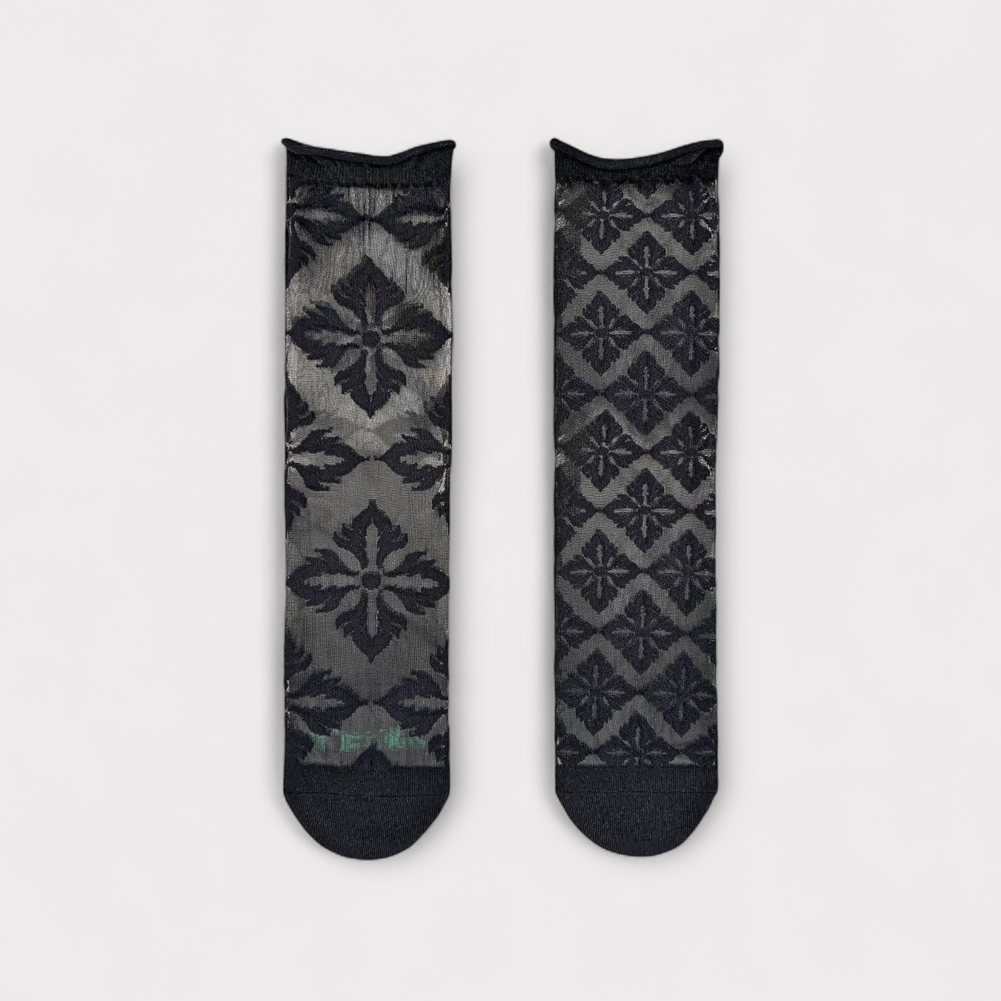 Calzino mezza gamba con base in tulle leggero e pannelli in cotone che disegnano un raffinato pattern déco in scala di grigi.