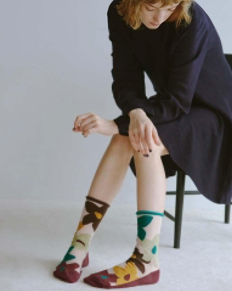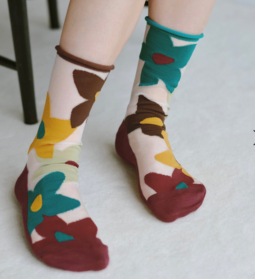 Calzino mezza gamba con base in tulle leggero e pannelli in cotone che disegnano fiori “soffiati dal vento”.