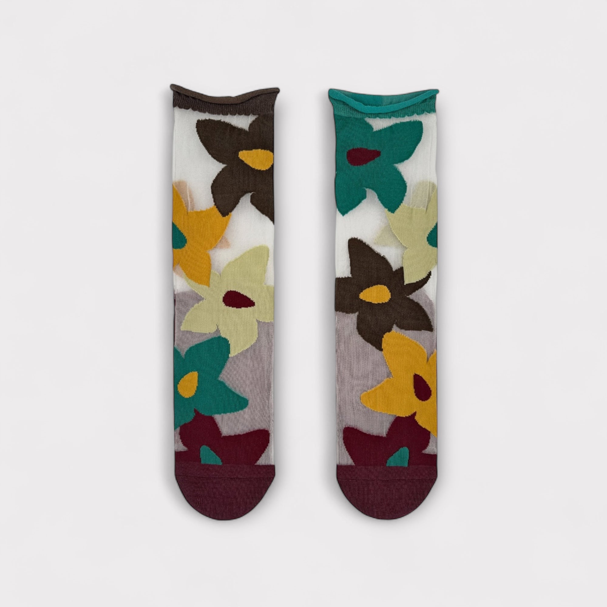 Design spaiato: ogni piede ha una composizione floreale diversa, per un paio unico, giocoso e subito riconoscibile.