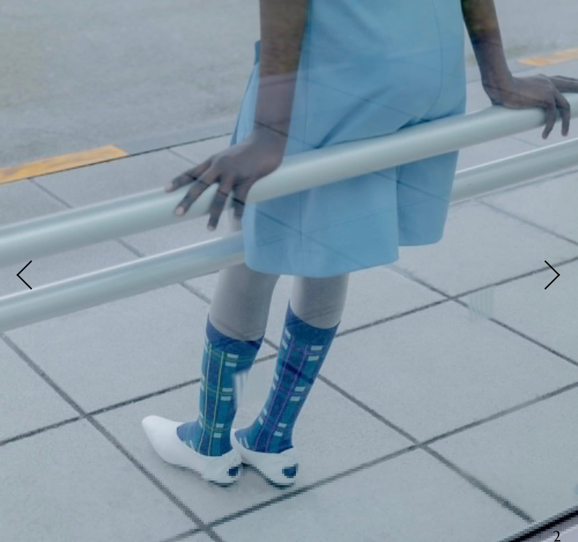 Calzino lungo al ginocchio in cotone, design spaiato (tartan diverso sui due piedi); fine, traspirante e trendy. Base blu navy e verde petrolio con dettagli viola e giallo lime. Made in Japan.