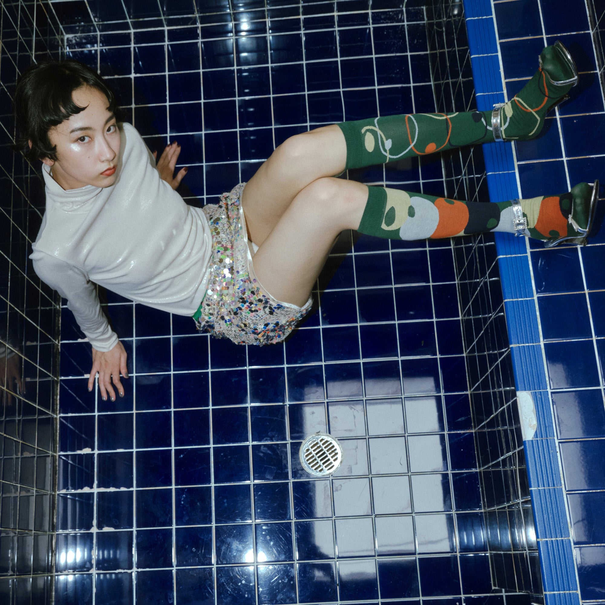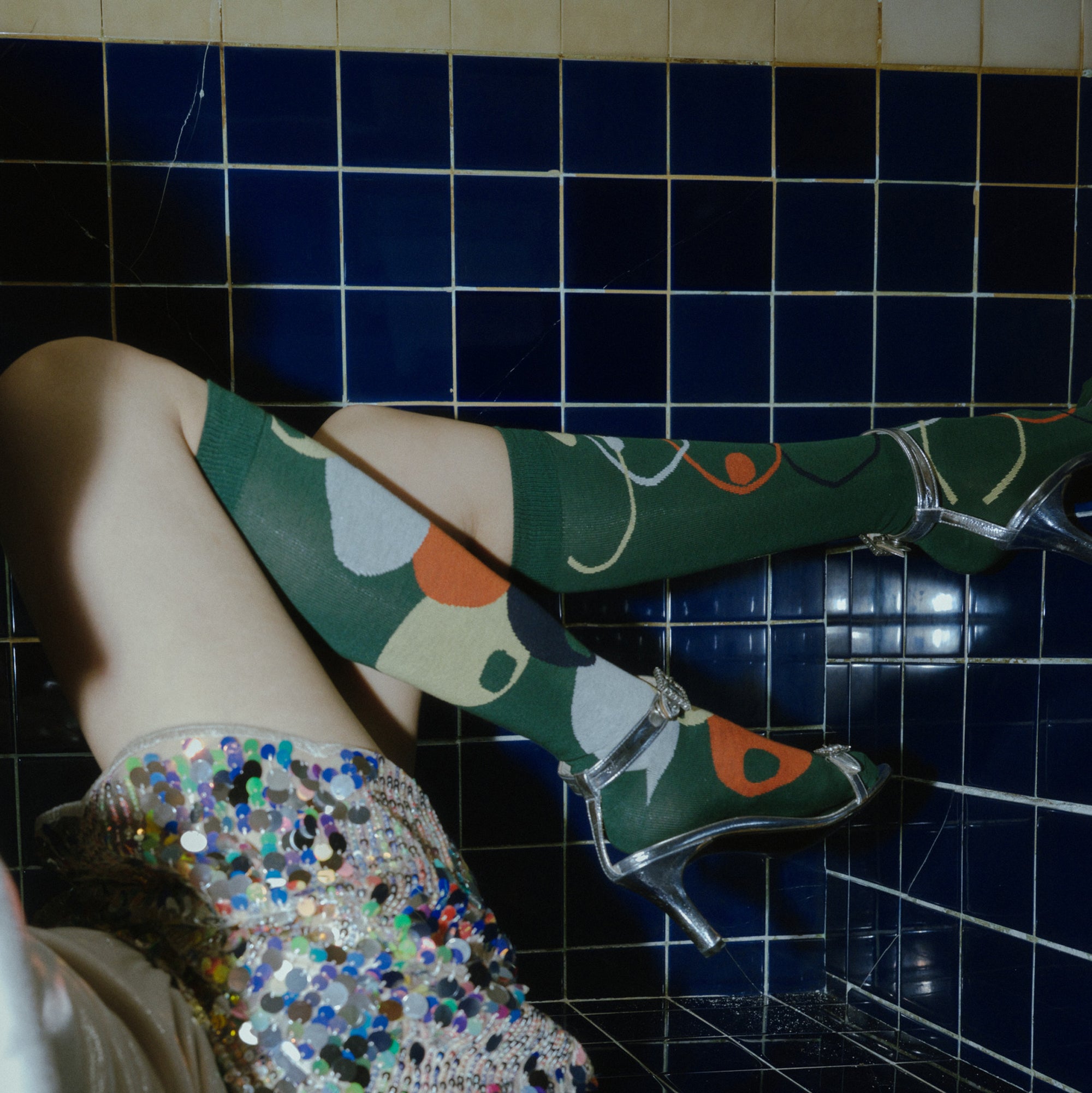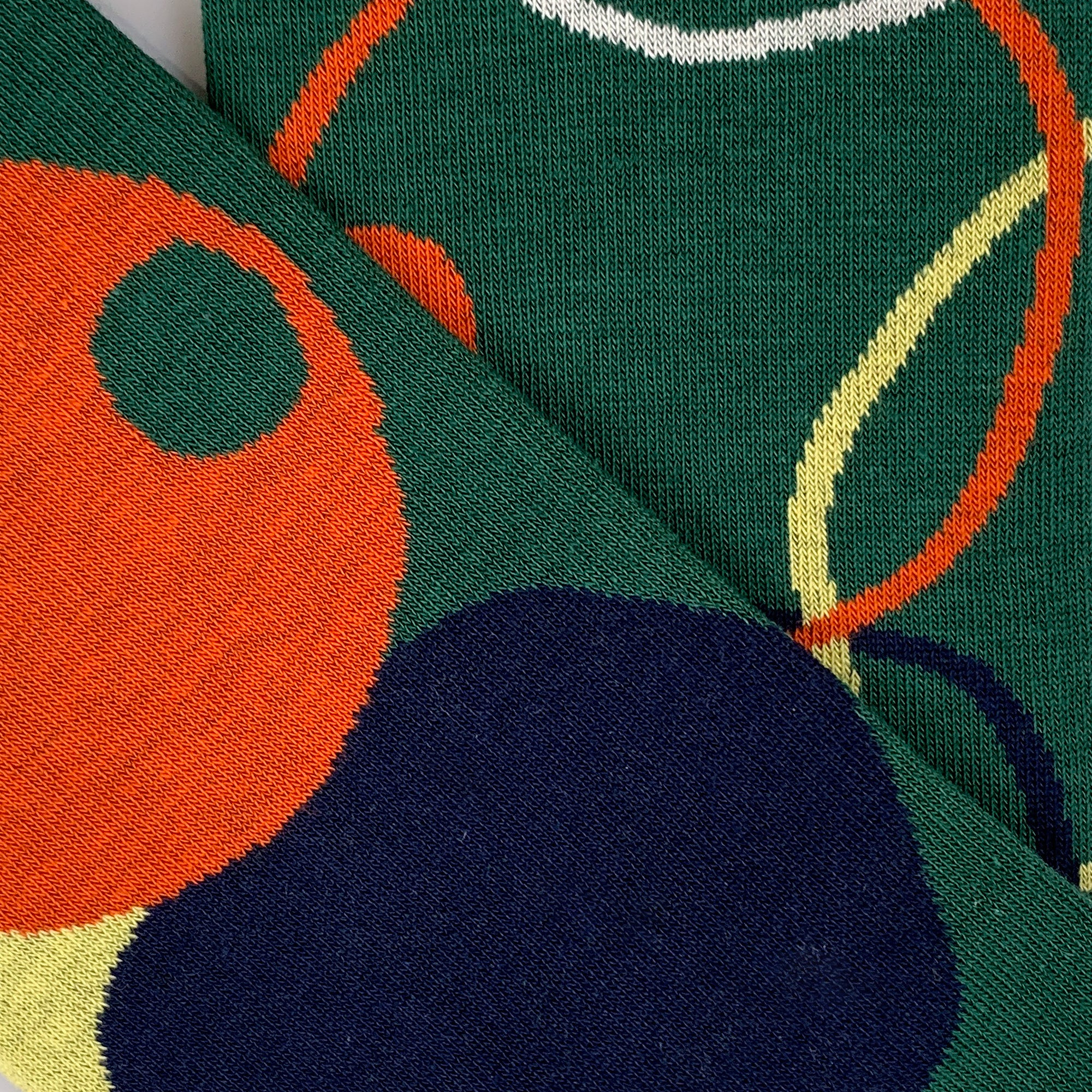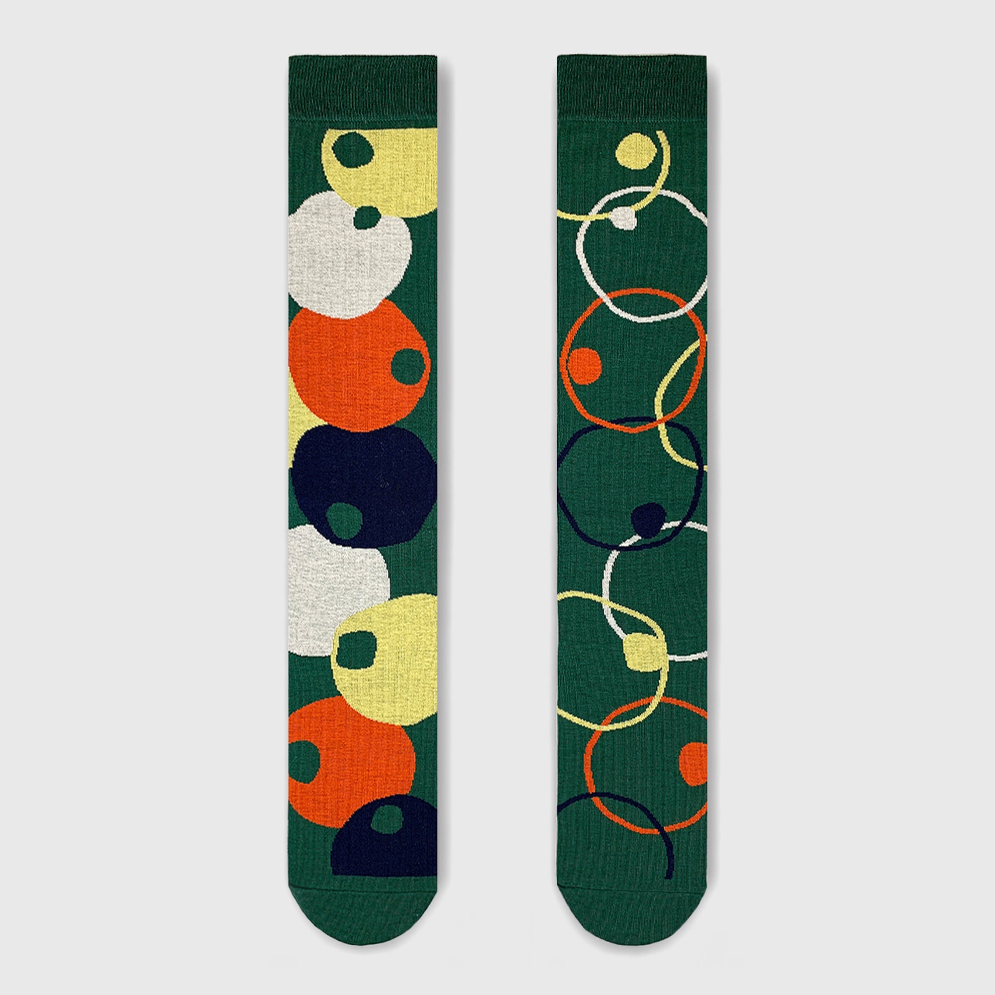Calzino lungo al ginocchio in cotone con pattern rotondo su base verde; fine, traspirante, perfetto sotto stivali e mocassini. Made in Japan.