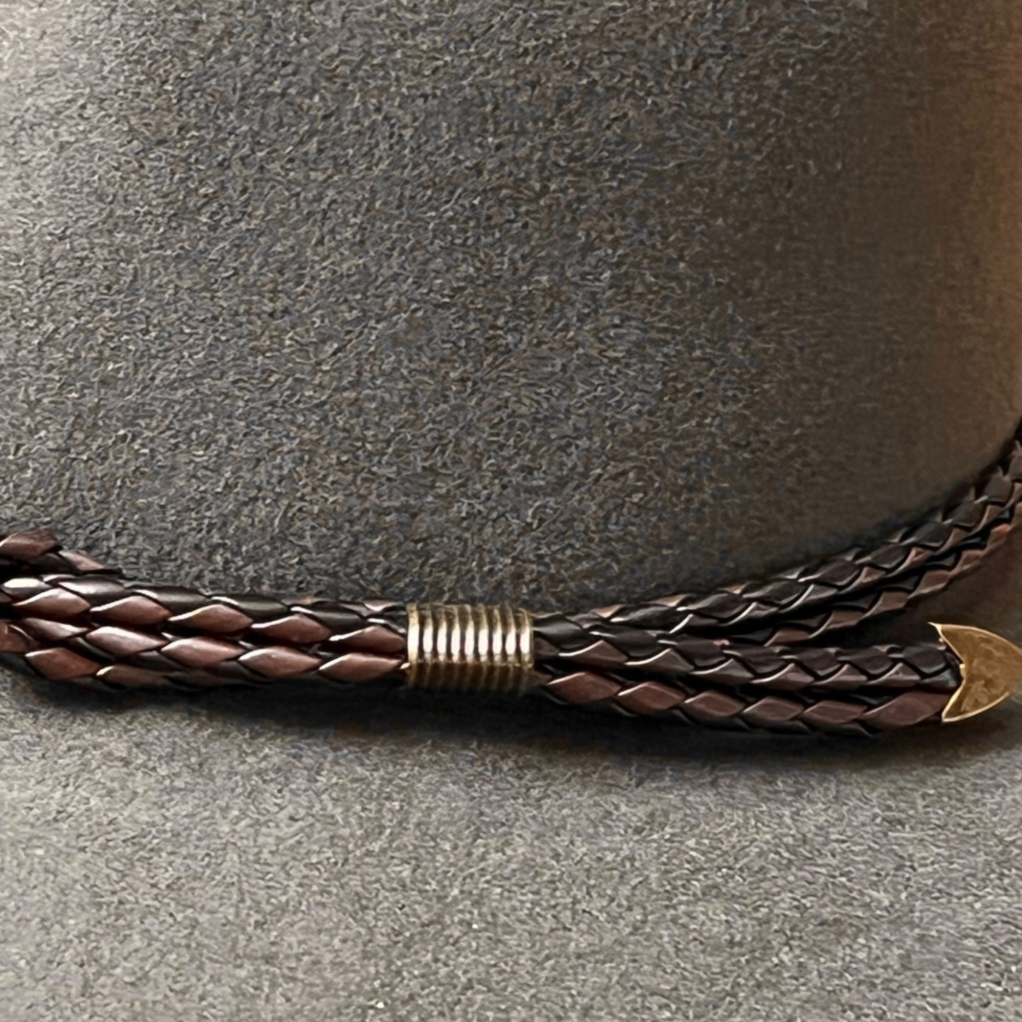 Cappello country in feltro di lana extra merinos color fango, con nastro in pelle intrecciata. Morbido, impermeabile e artigianale. Made in Italy.