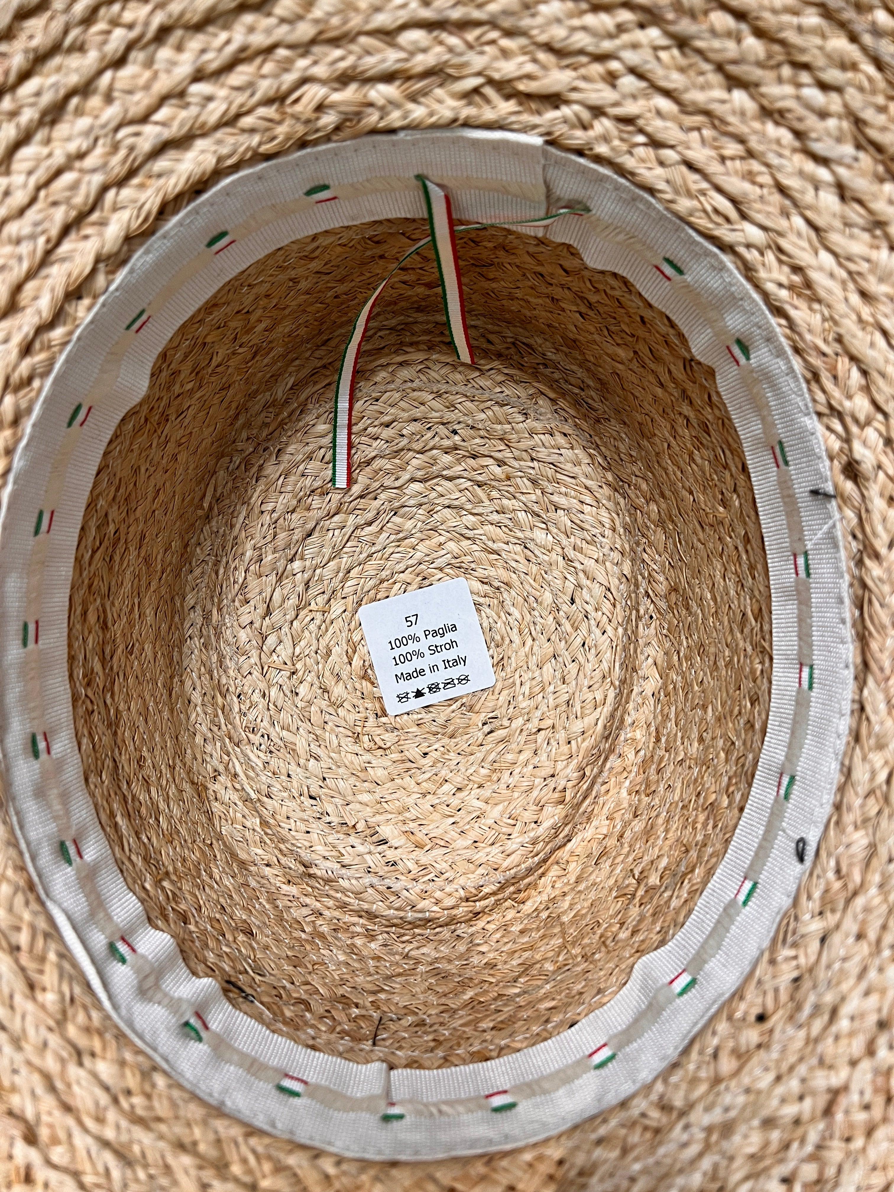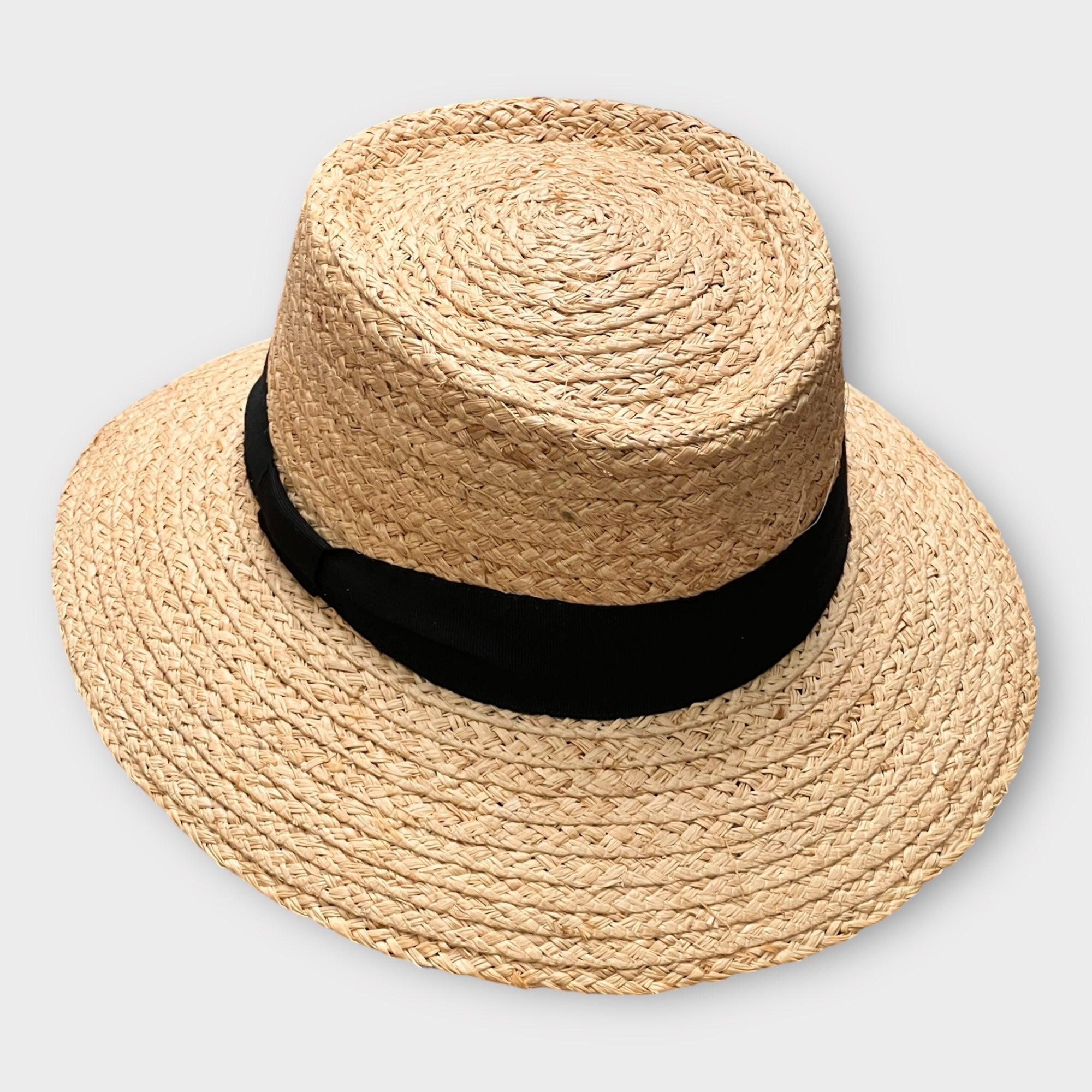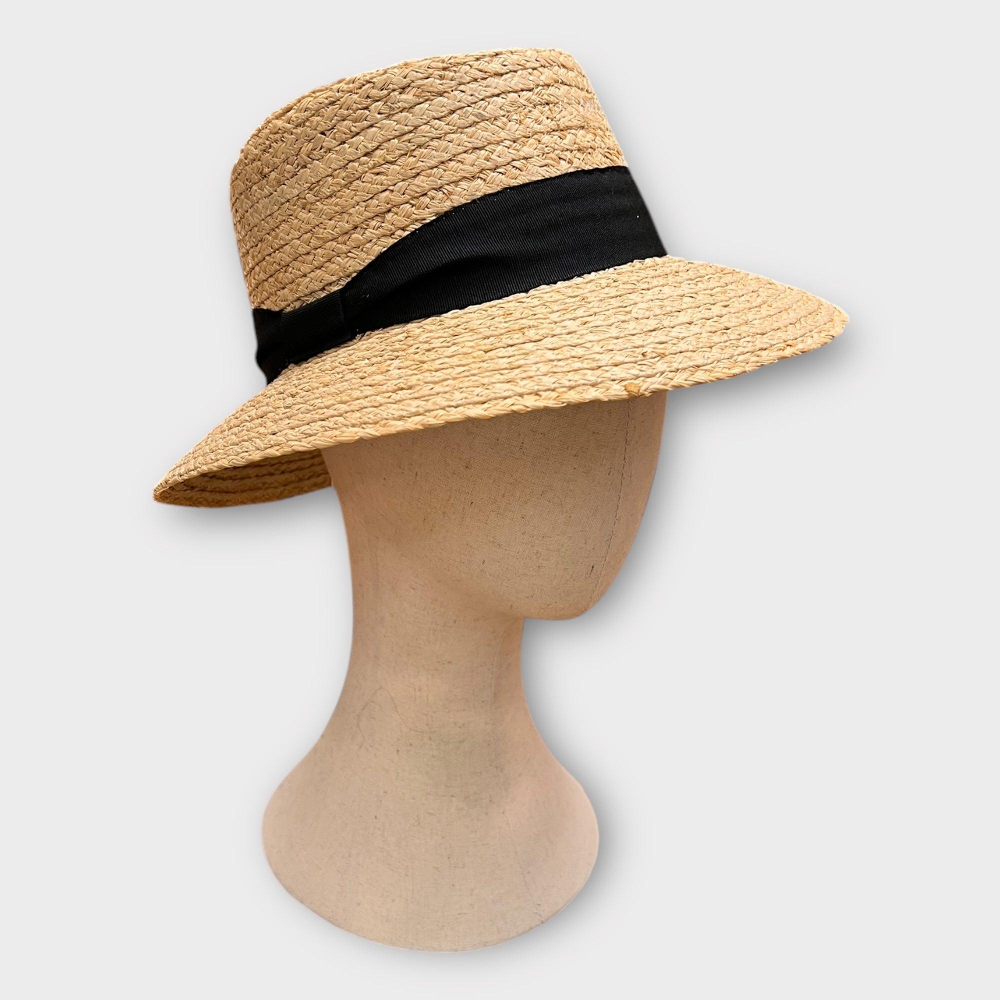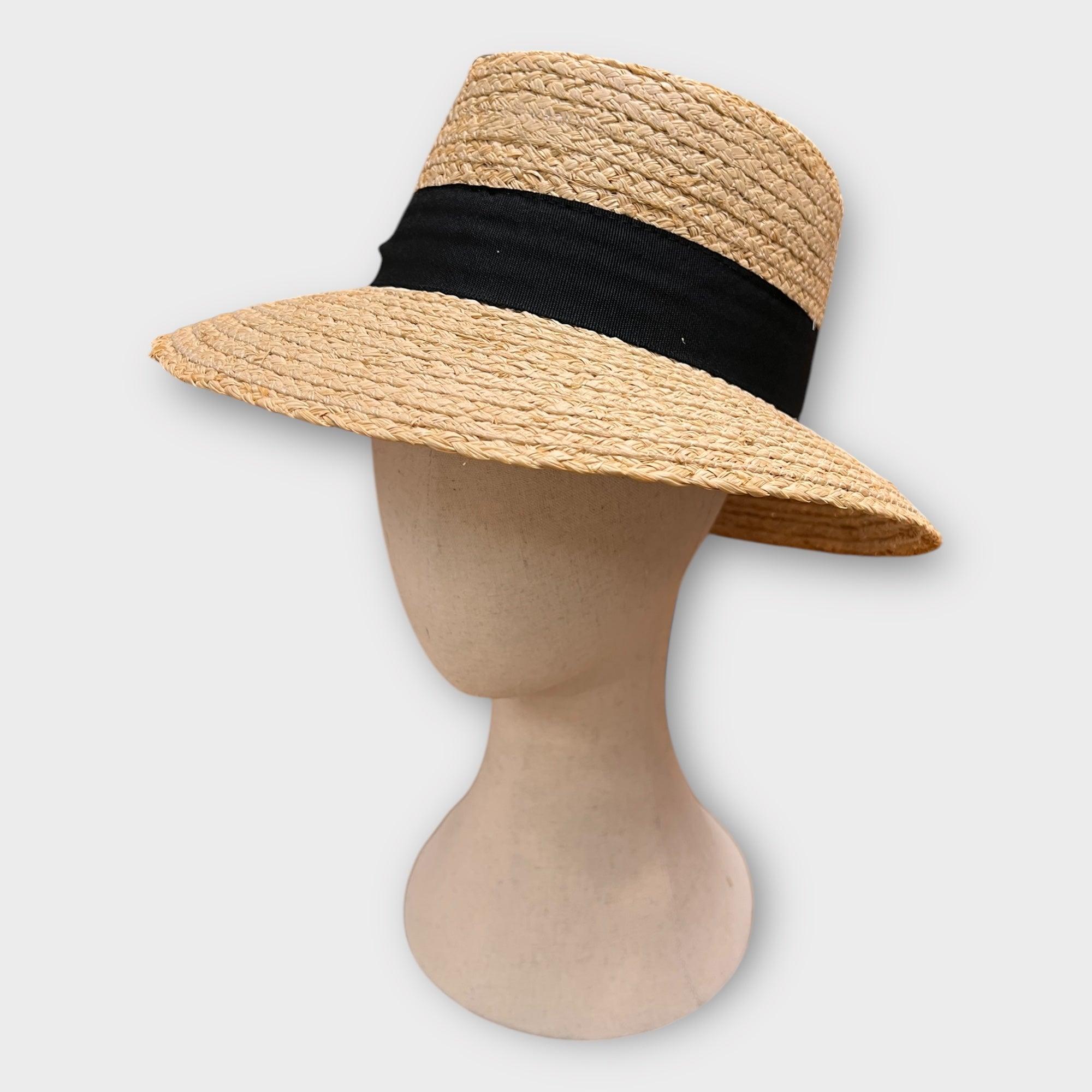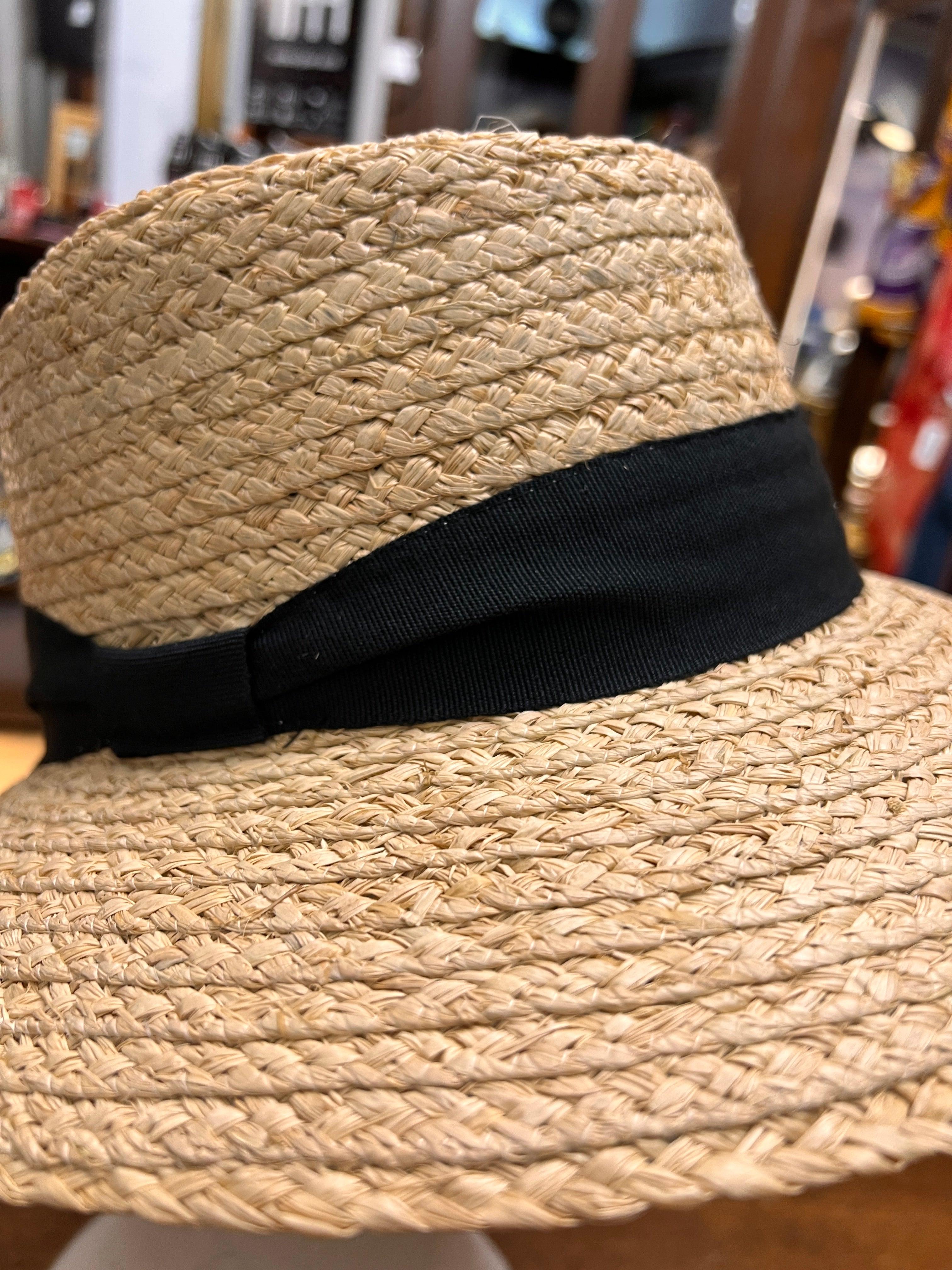 Cappello da donna estivo in raffia con fascia nera. Taglia unica regolabile tramite cordino interno, ideale per l'estate.