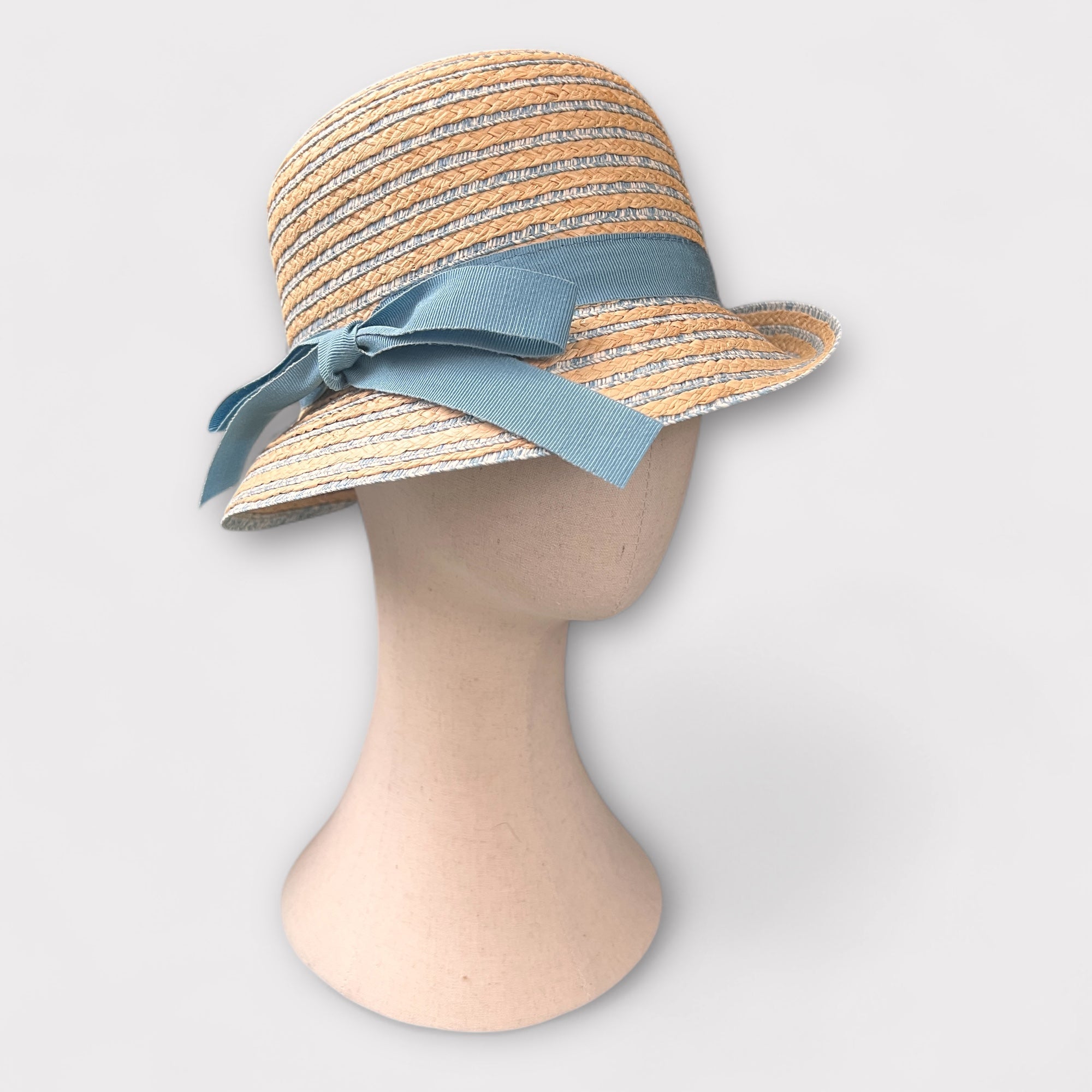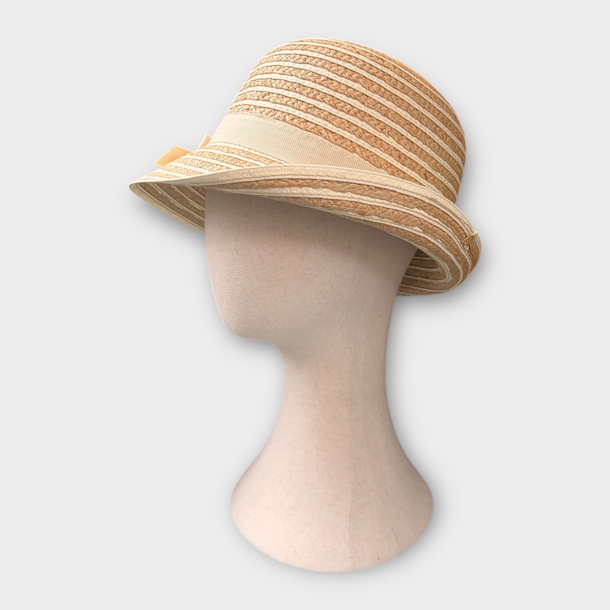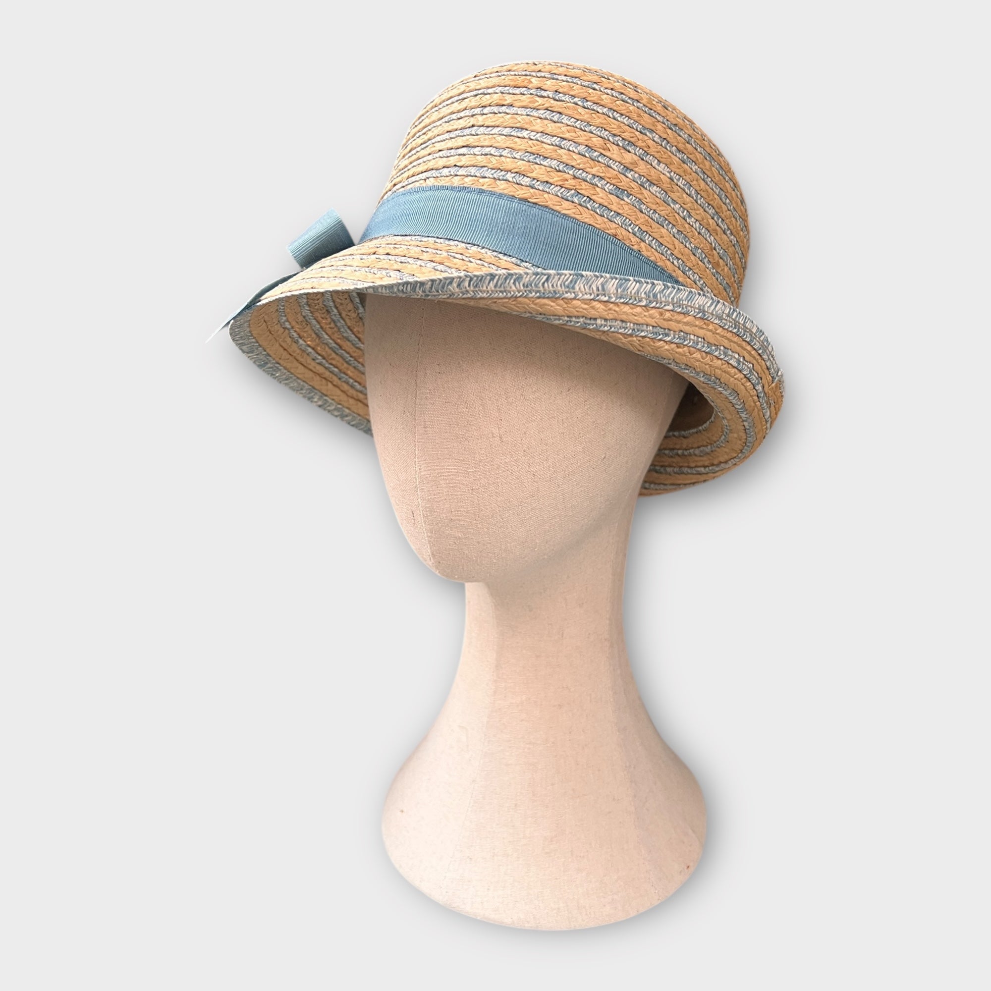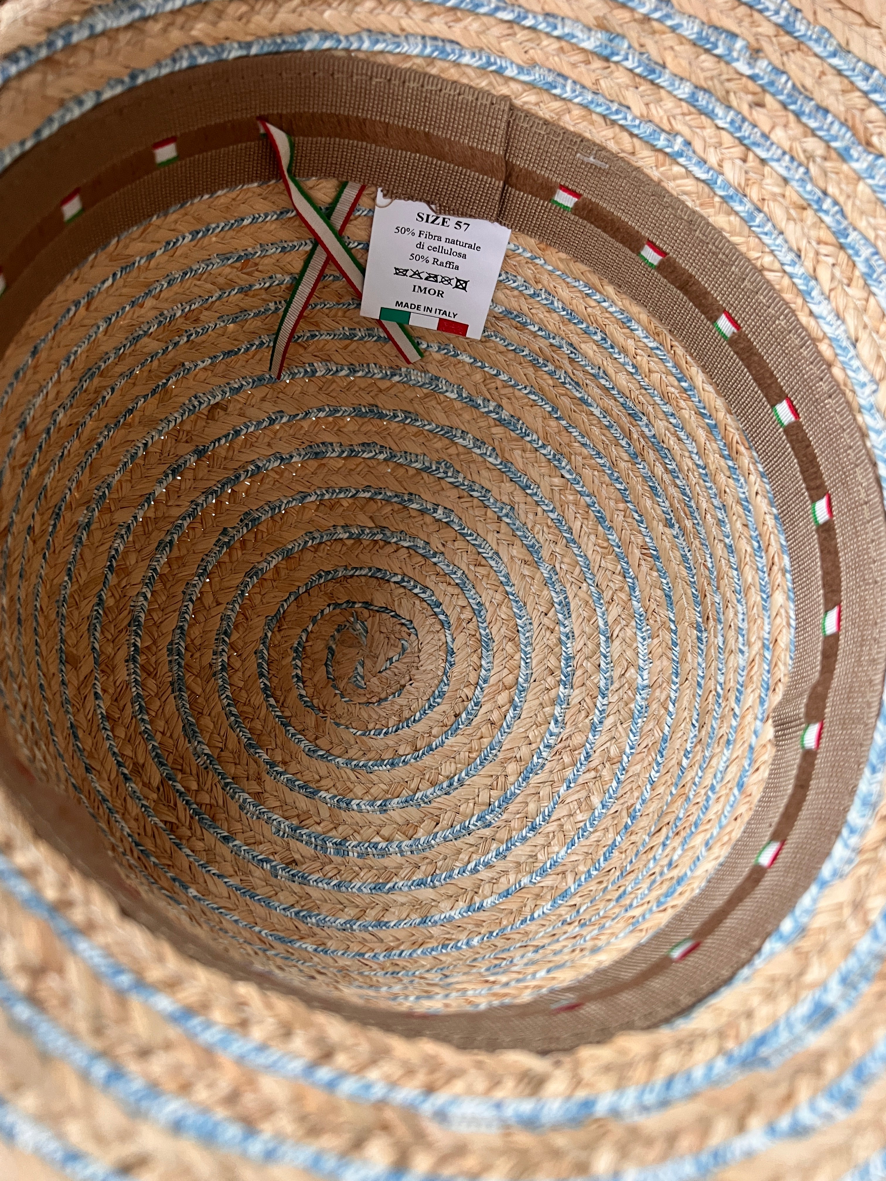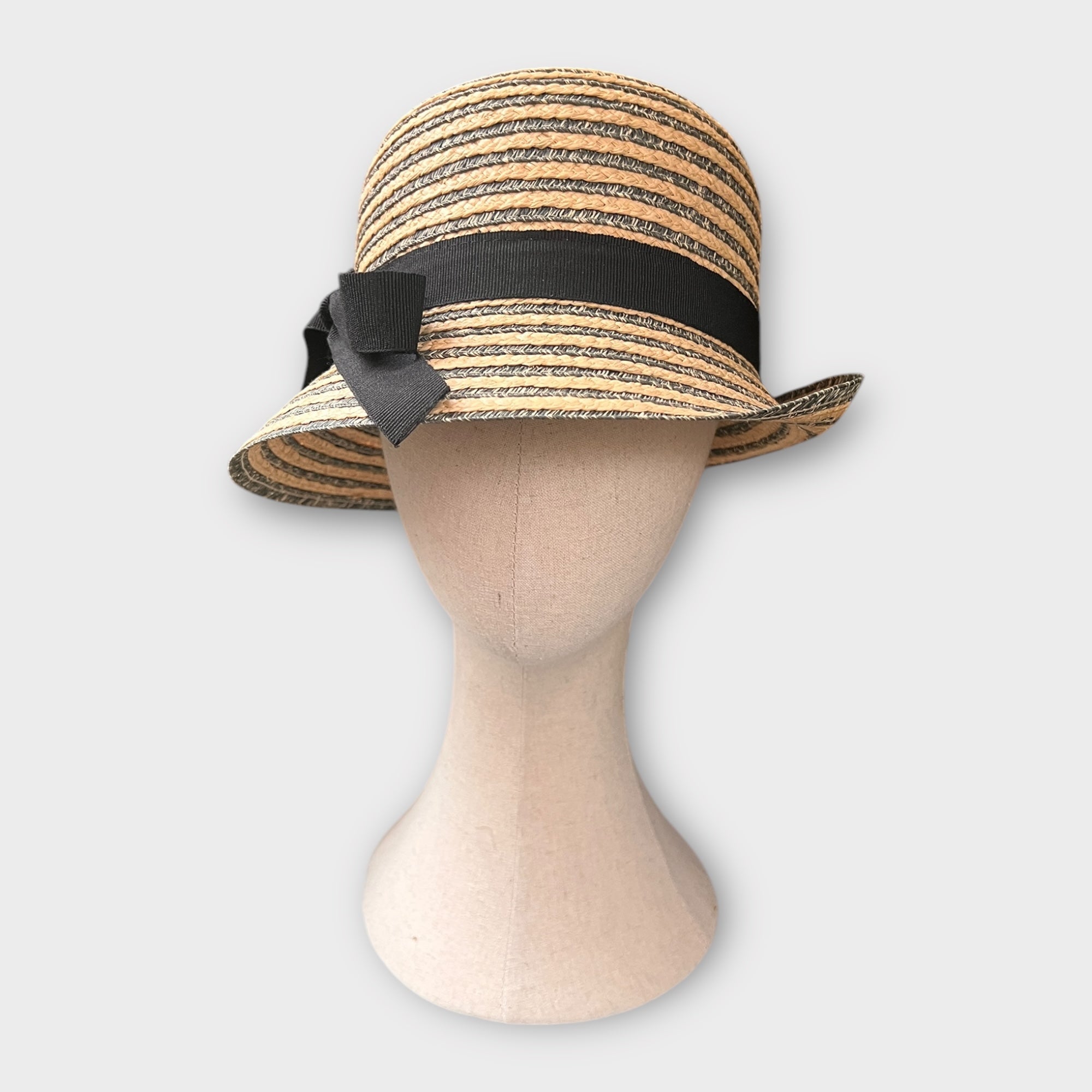 Cloche asimmetrica in rafia bicolor, sfoderata e regolabile. Elegante, leggera e ideale per l’estate. Made in Italy.
