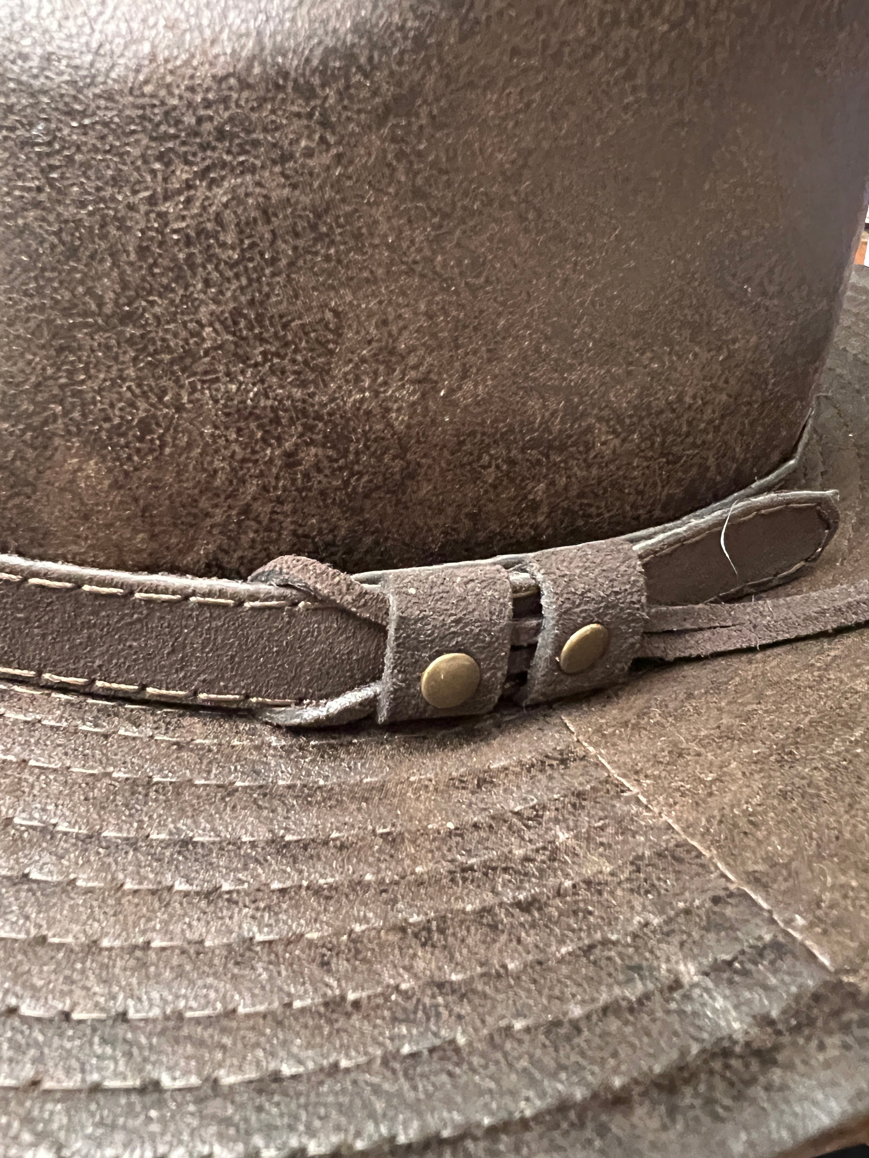 Cappello in eco pelle marrone effetto invecchiato, stile Indiana Jones. Ala 6 cm, fodera in cotone e cinturino tono su tono. Made in Italy.