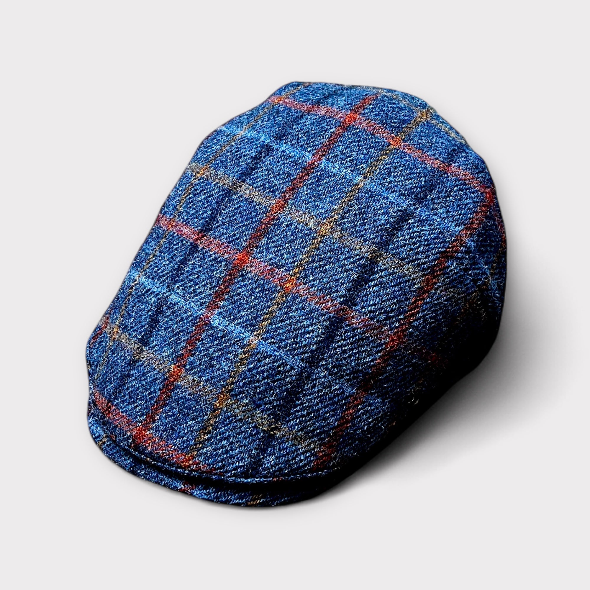 Coppola invernale in pura lana con motivo tartan blu, visiera cucita e fodera in cotone. Calda, traspirante e rifinita artigianalmente. Made in Italy.