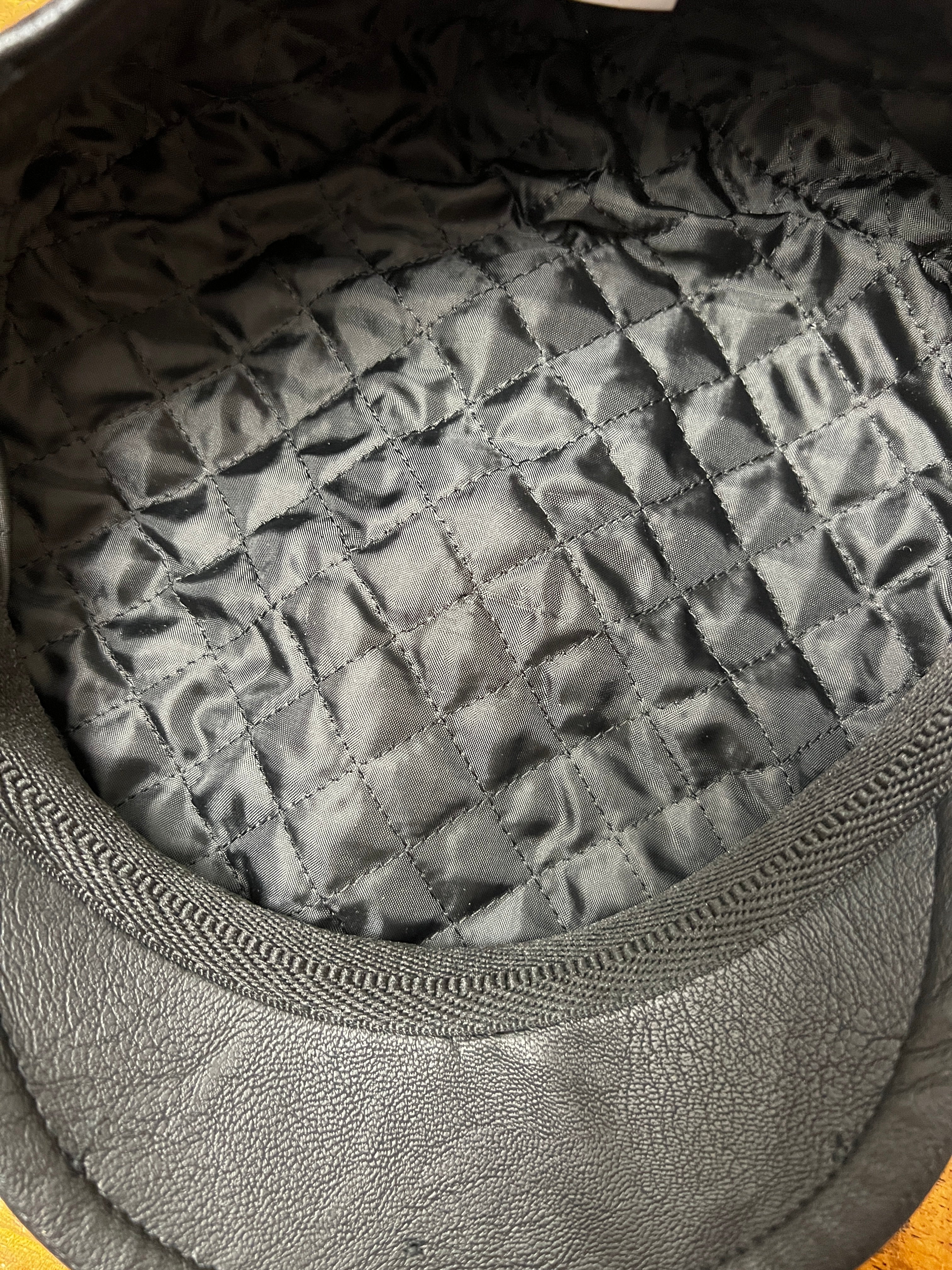 Coppola 8 spicchi in eco-pelle nera impermeabile, morbidissima e confortevole, con fodera trapuntata in viscosa. Profilo pieno ma equilibrato. Made in Italy.