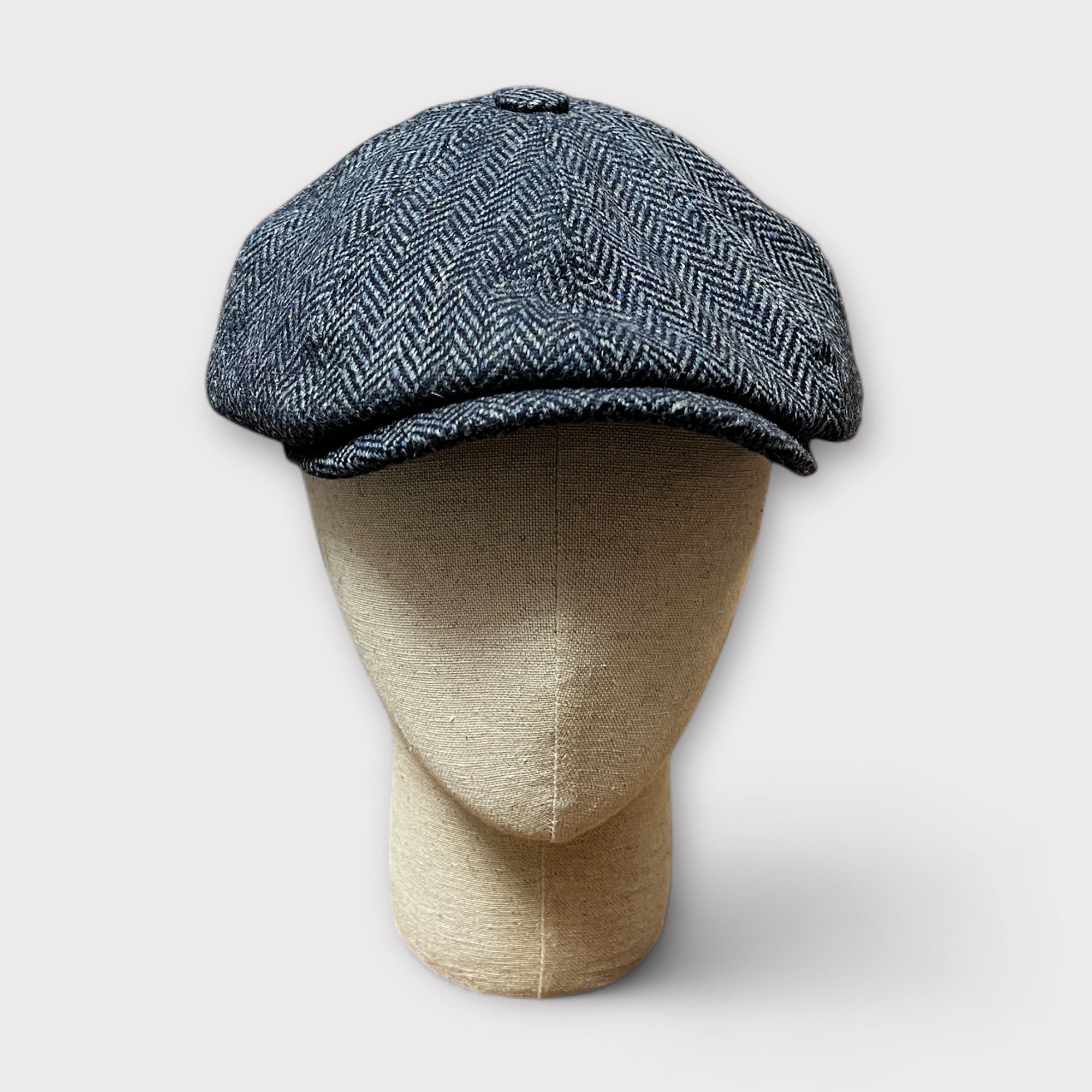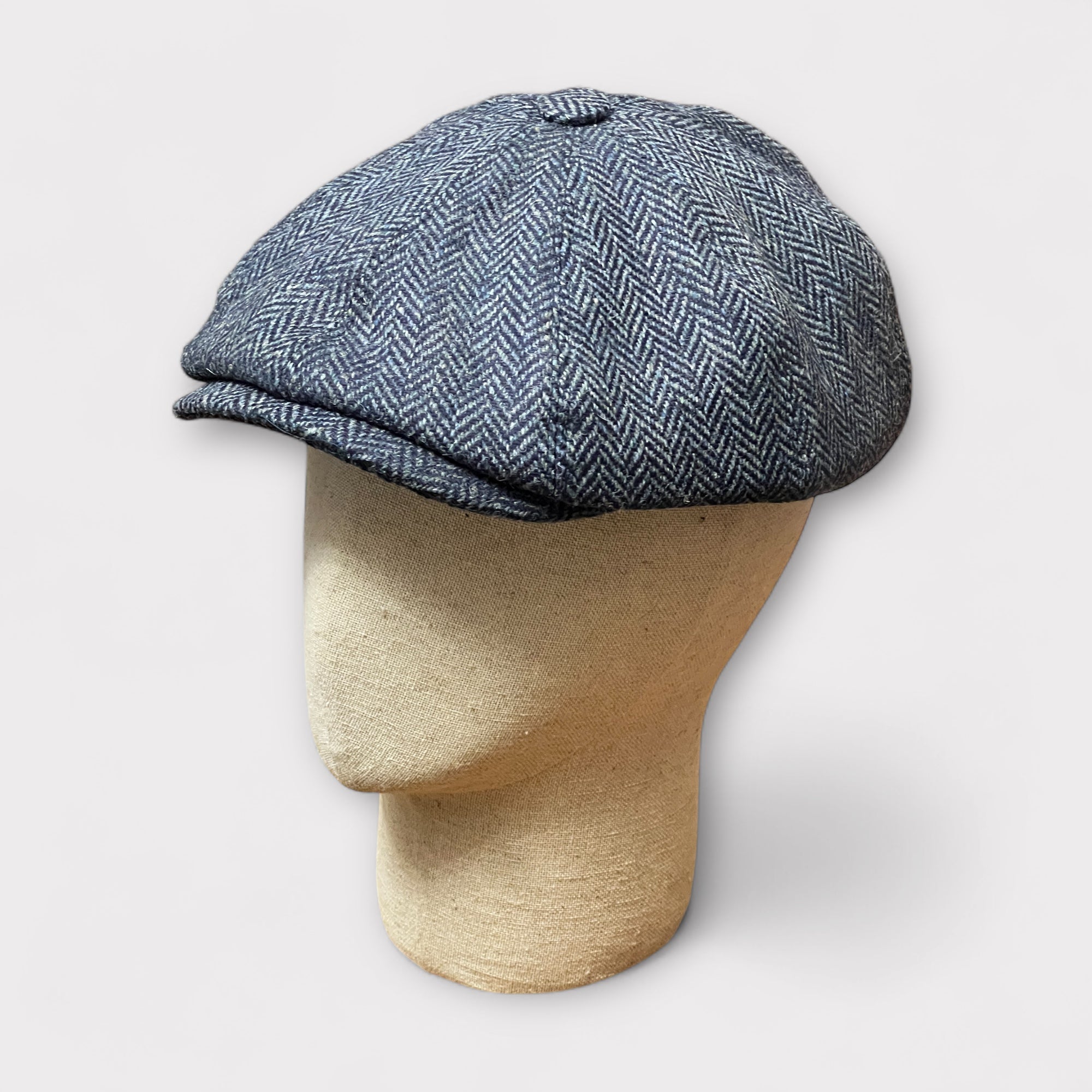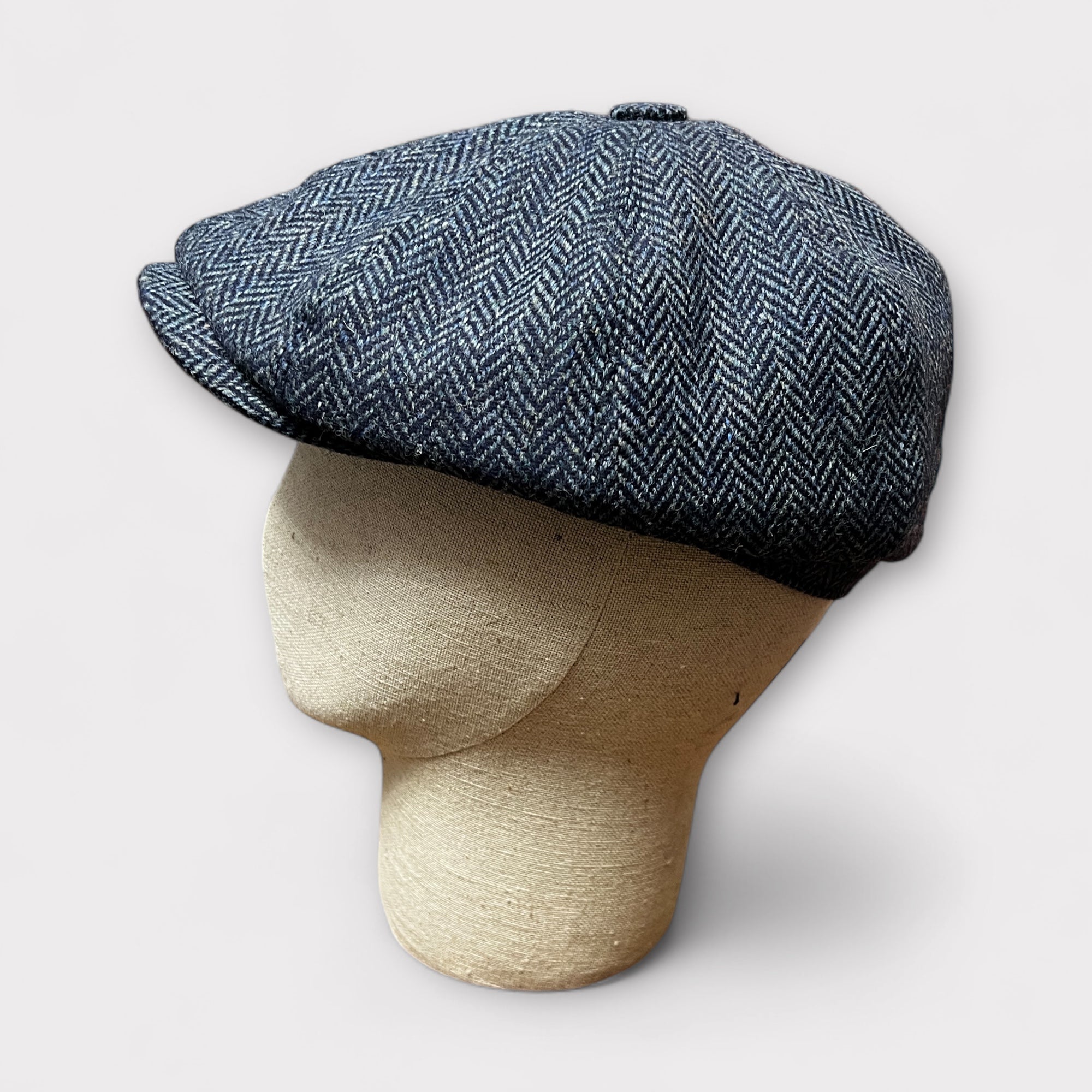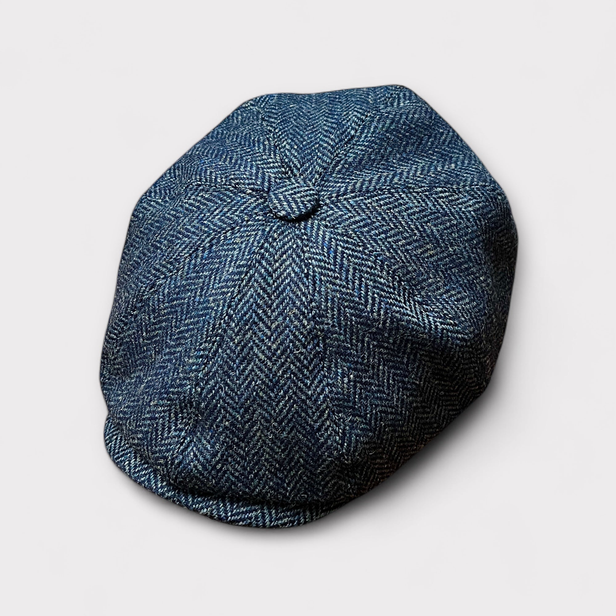Coppola tradizionale 8 spicchi con cupola a bottoncino e visiera cucita, ispirata ai modelli irlandesi d’archivio.