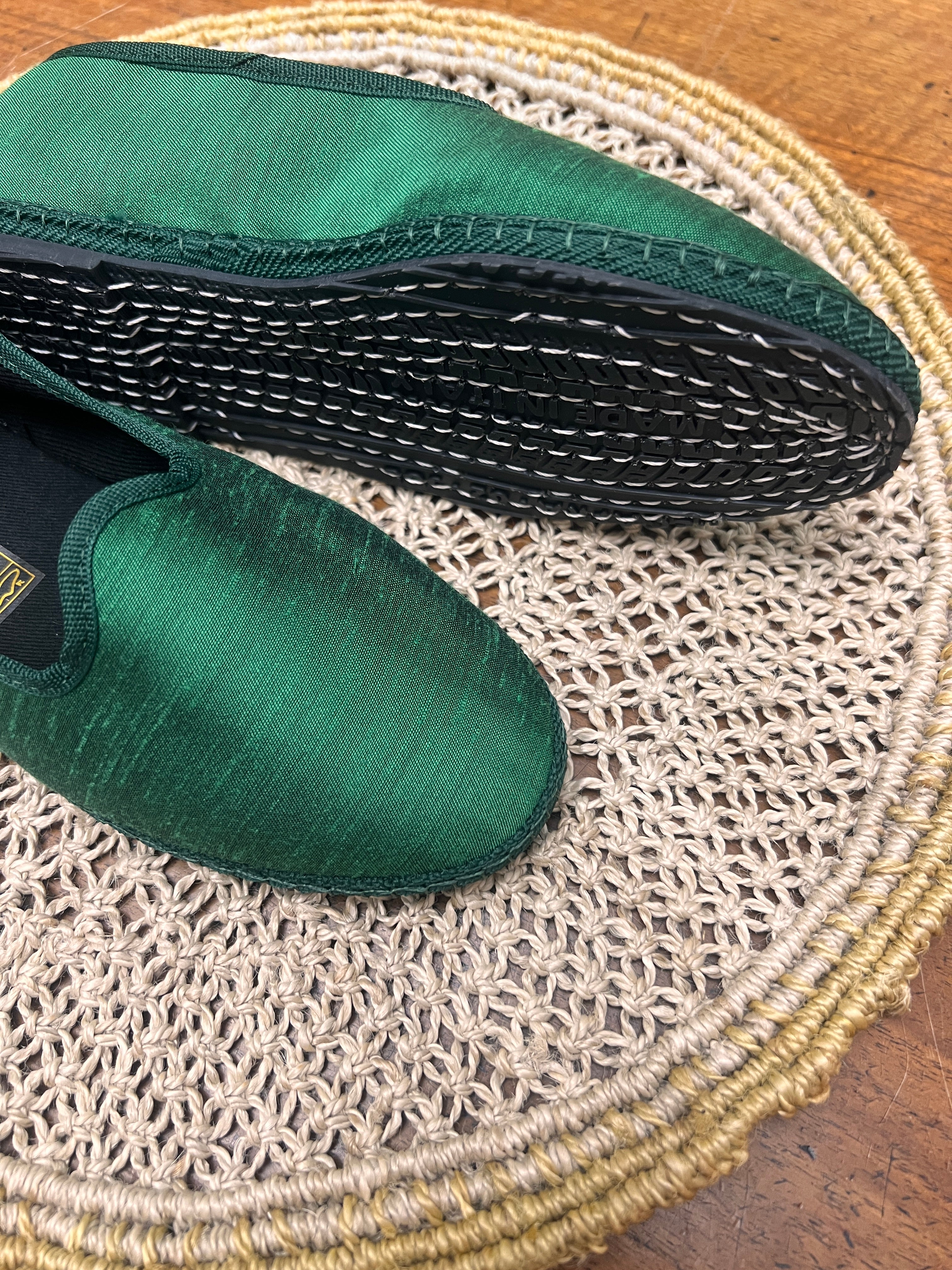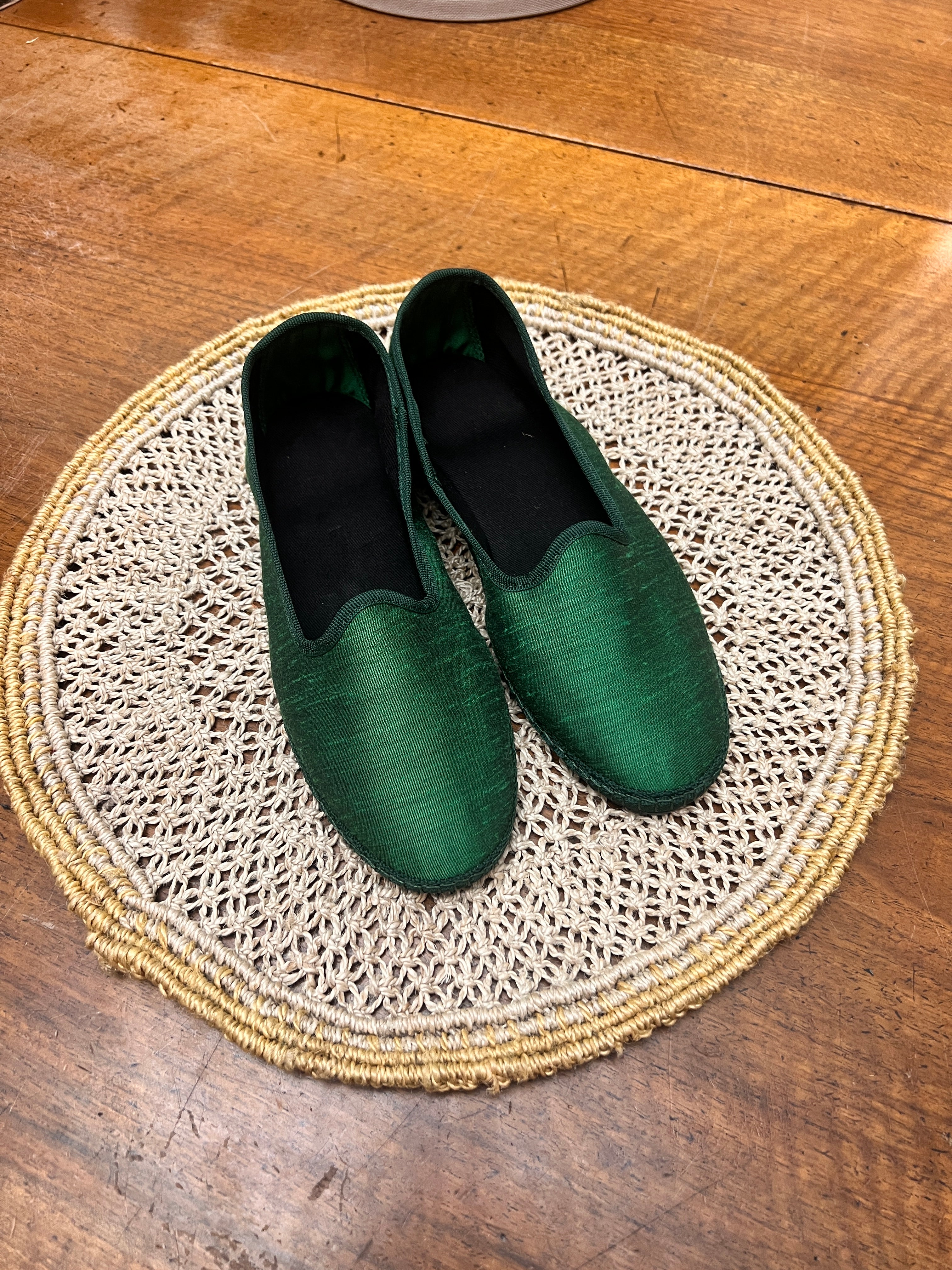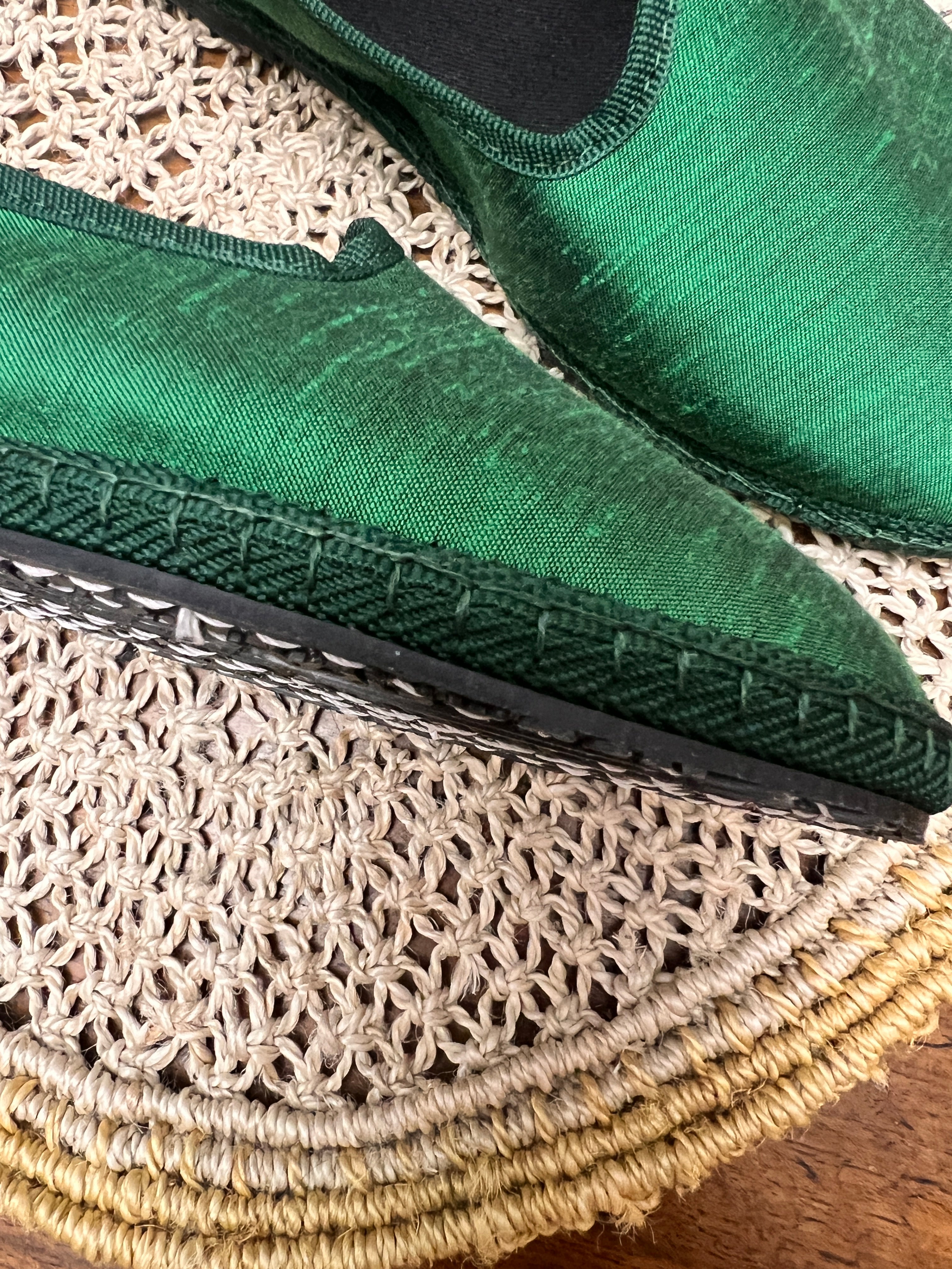 Friulane originali cucite a mano in seta shantung verde smeraldo. Eleganti, leggere e ideali per l’estate. Tradizione artigianale del Friuli.