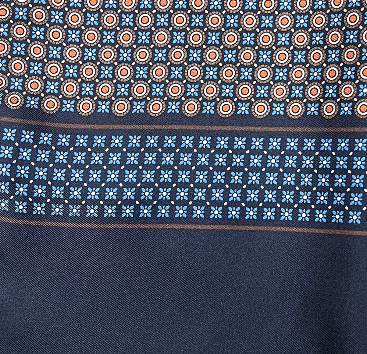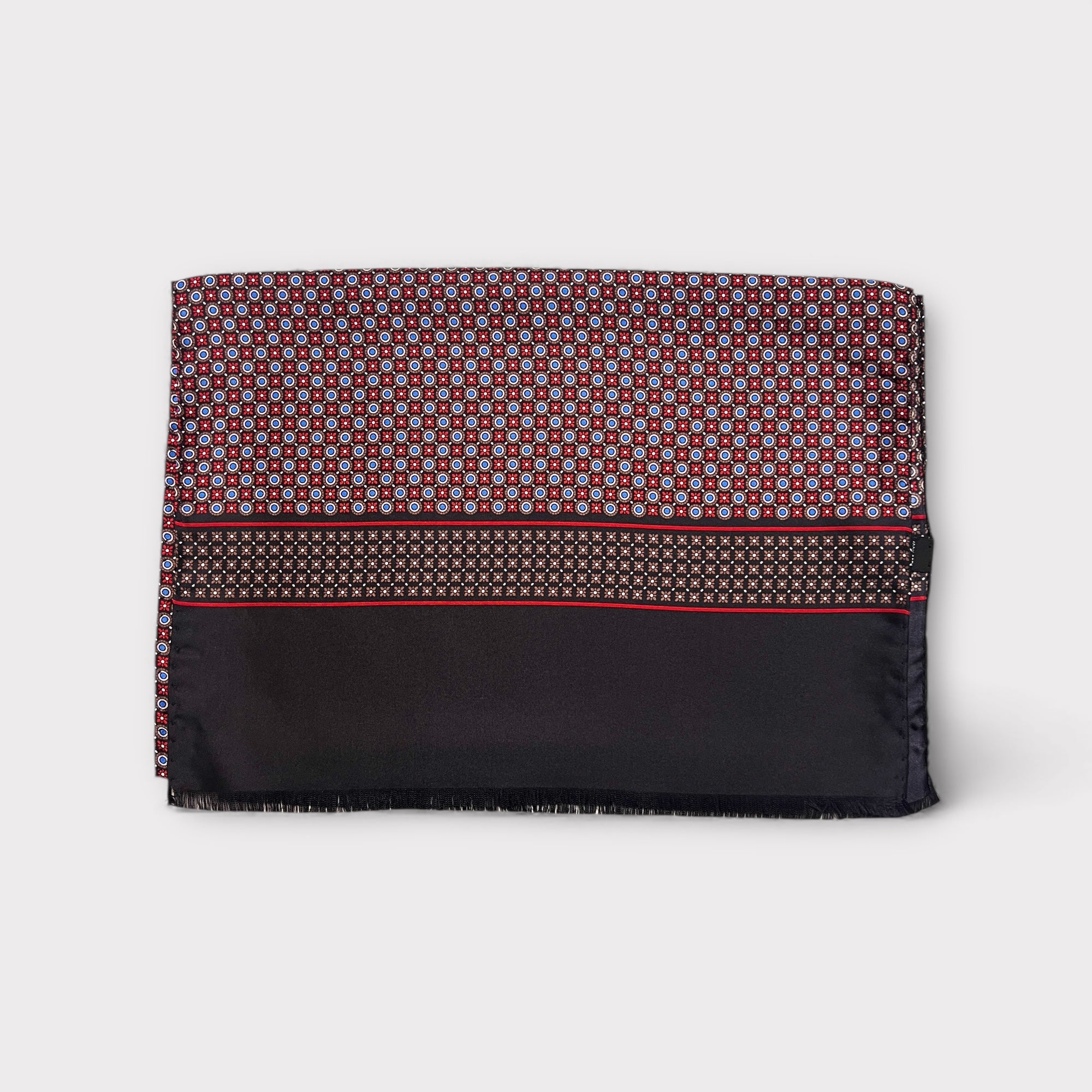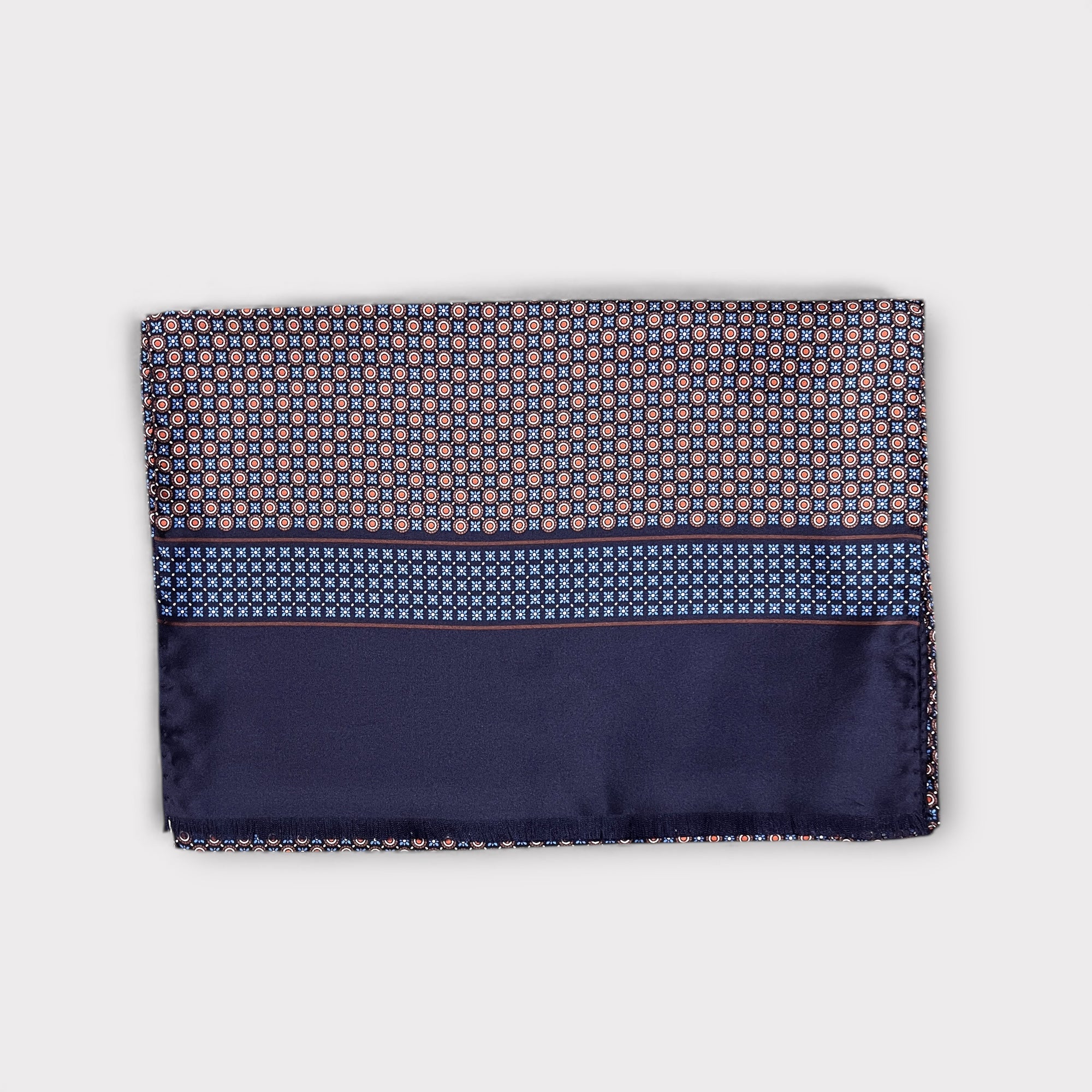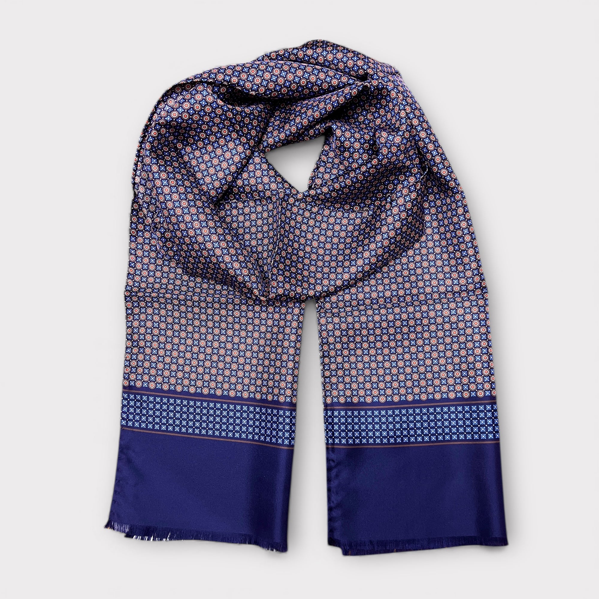 Sciarpa in pura seta Made in Italy con elegante motivo micro-cerchi. Morbida, luminosa e raffinata, ideale per completare cappotti, giacche e abiti. Misura 33×180 cm.