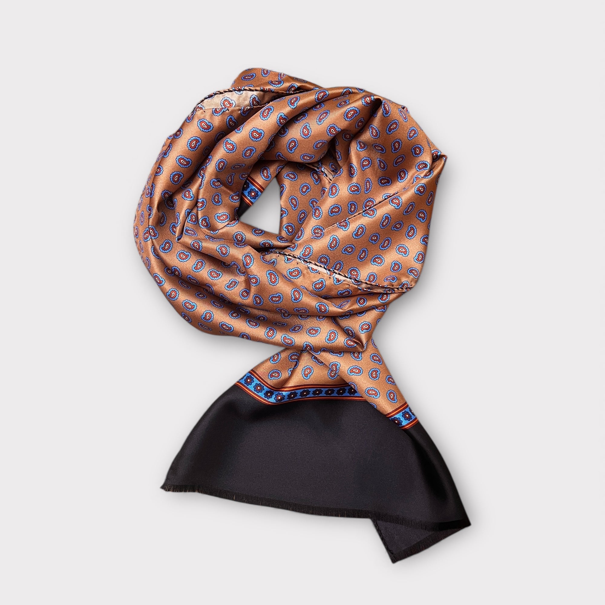 Sciarpa in twill di pura seta Made in Italy con elegante motivo cravatta. Morbida, luminosa e raffinata, ideale per look formali e sartoriali. Misura 33 x 180 cm.