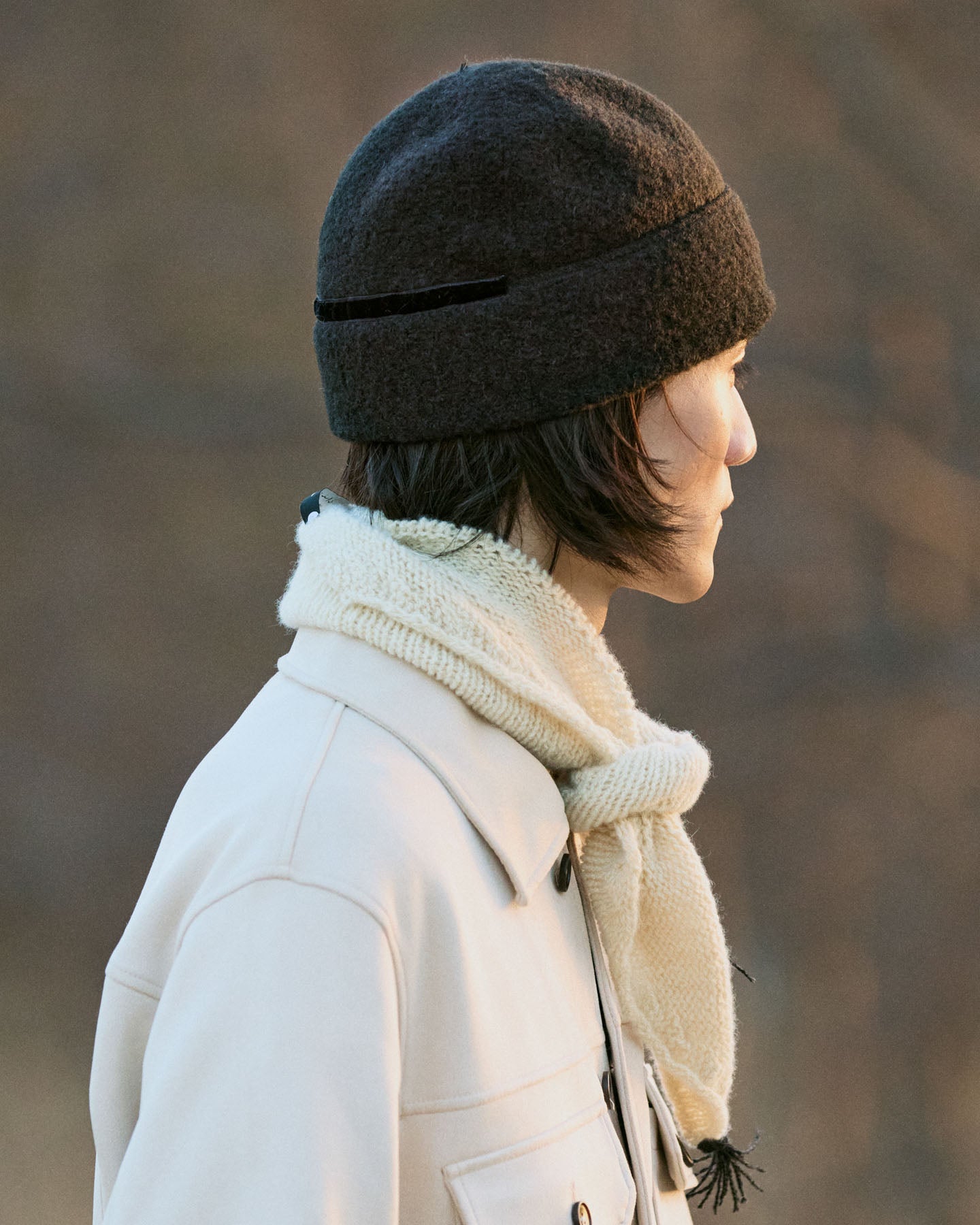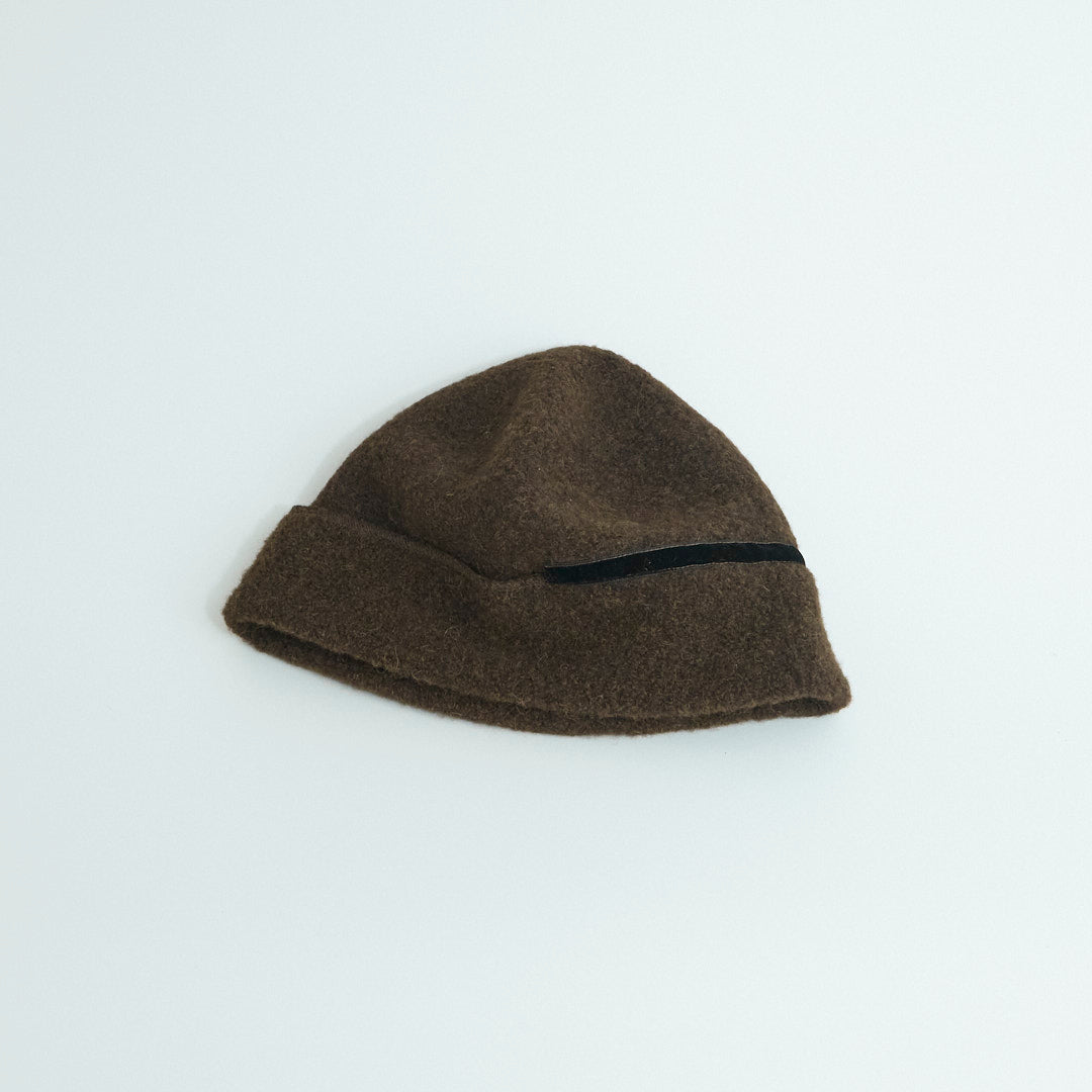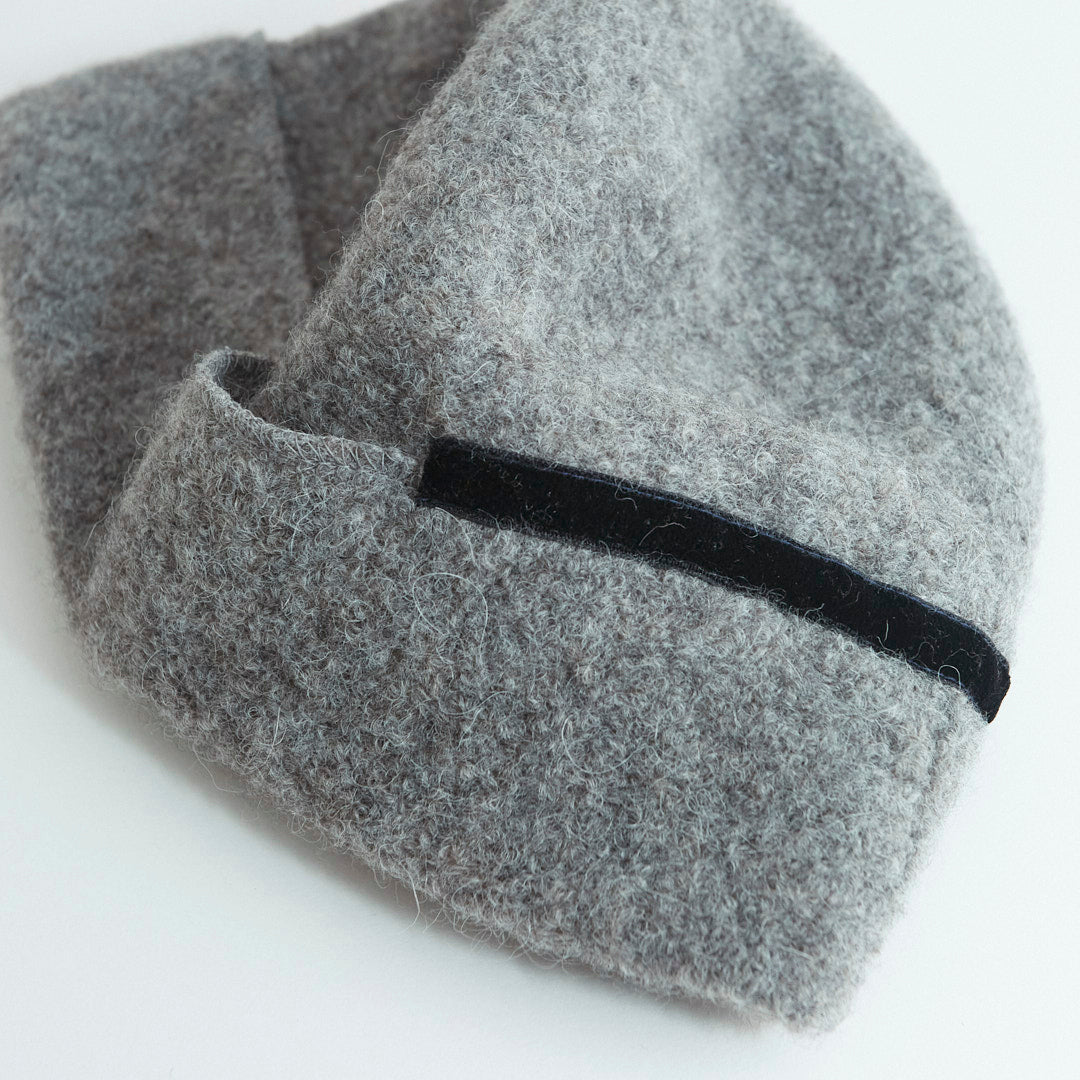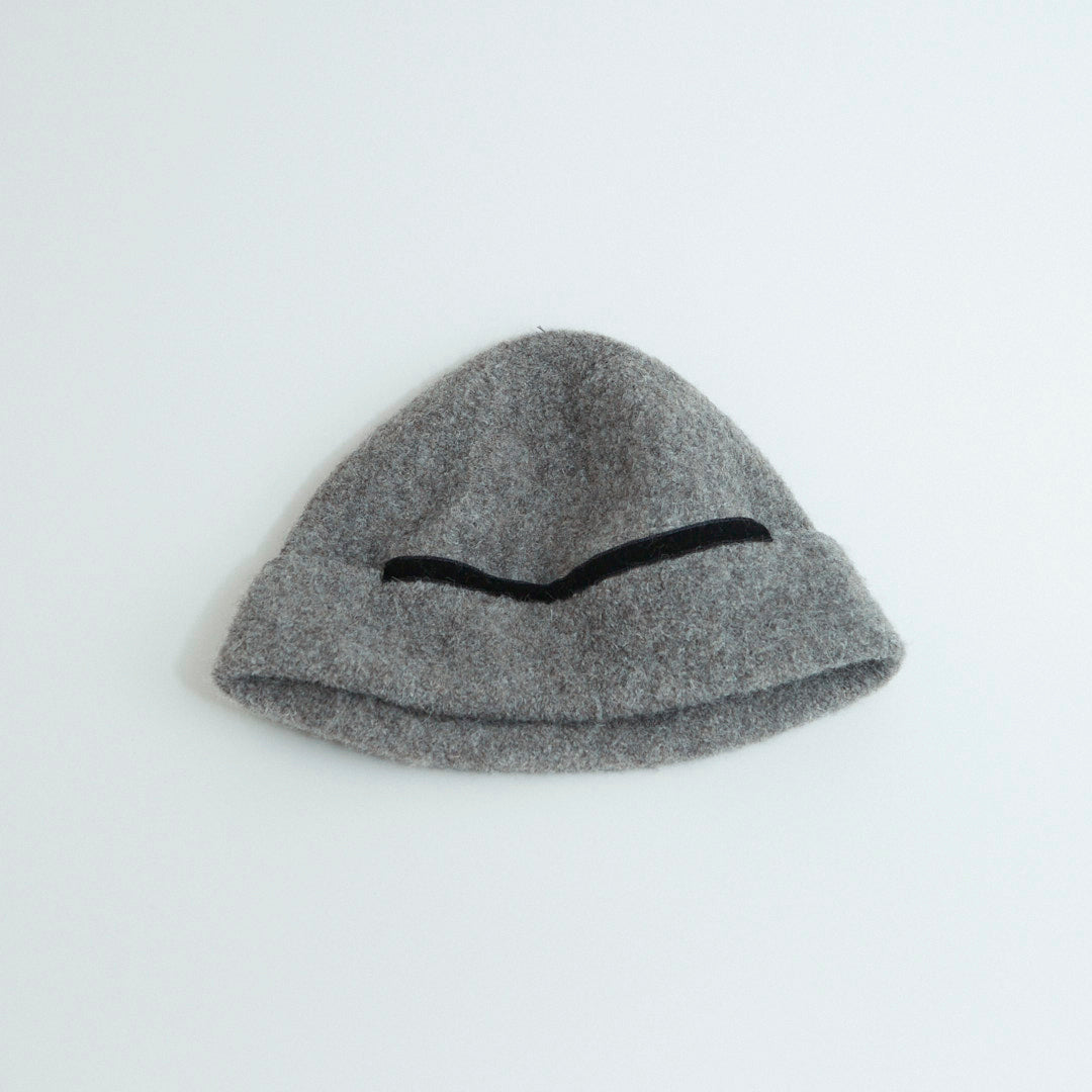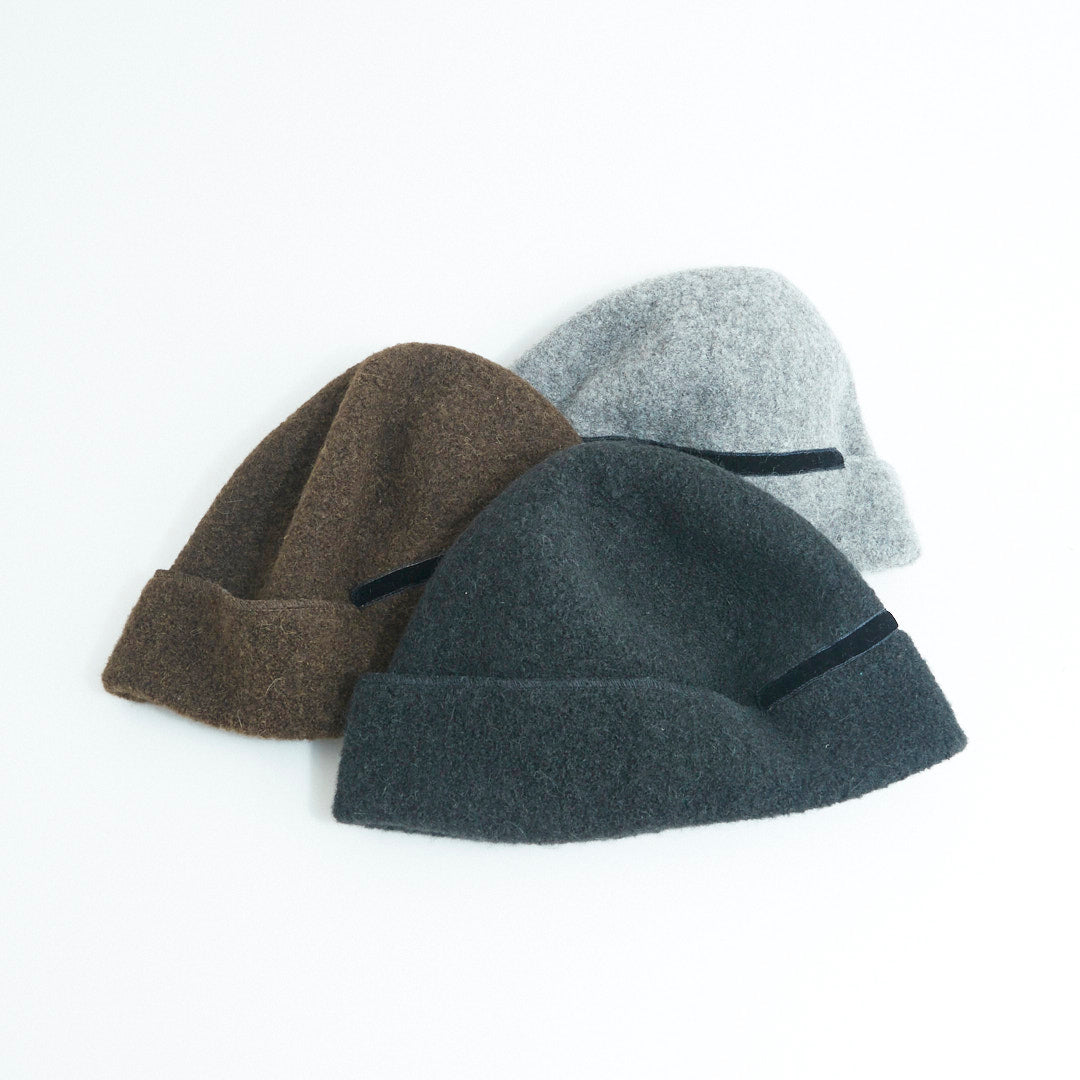 Berretto beanie in panno di alpaca e lana, morbido e modellabile. Si indossa con risvolto esterno o interno per creare diverse forme. Made in Japan.