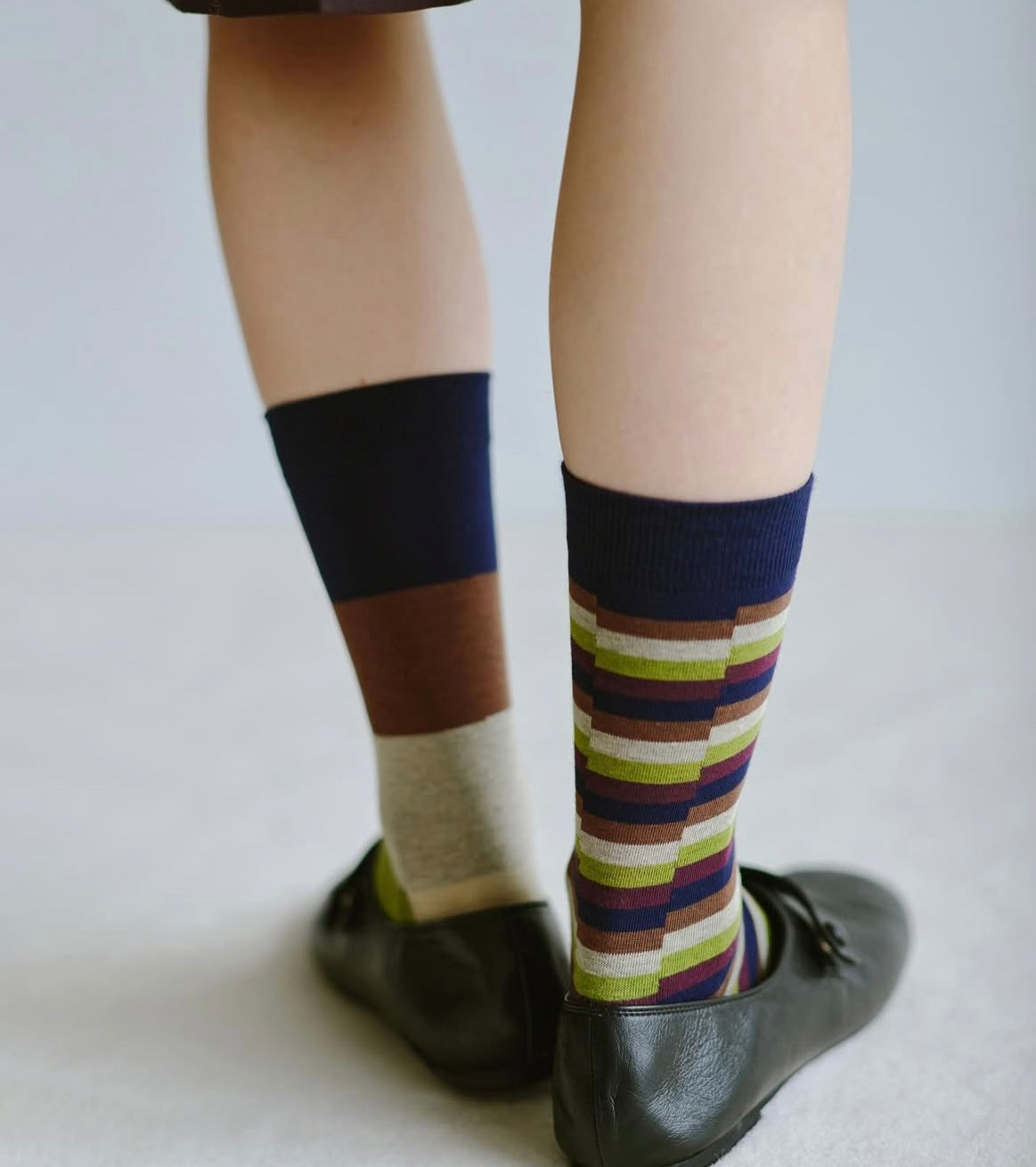 Calzino mezza gamba in cotone, spaiato (grafica diversa sui due piedi): righe sottili da un lato e blocchi a fasce dall’altro; fine, traspirante e super trendy. Made in Japan.