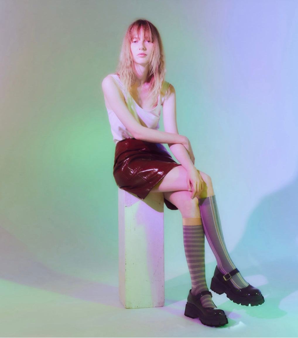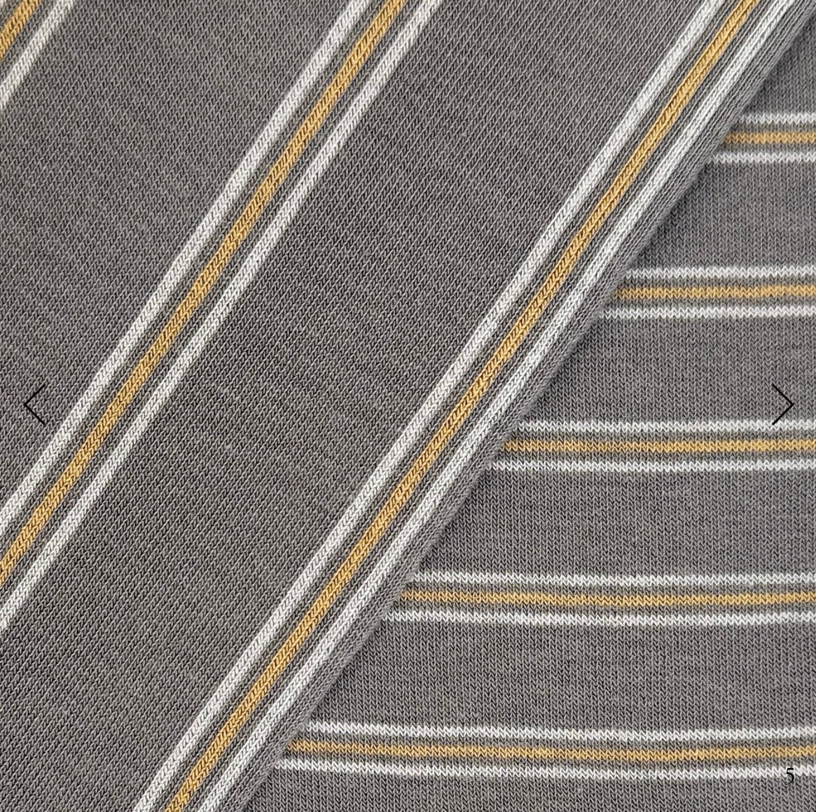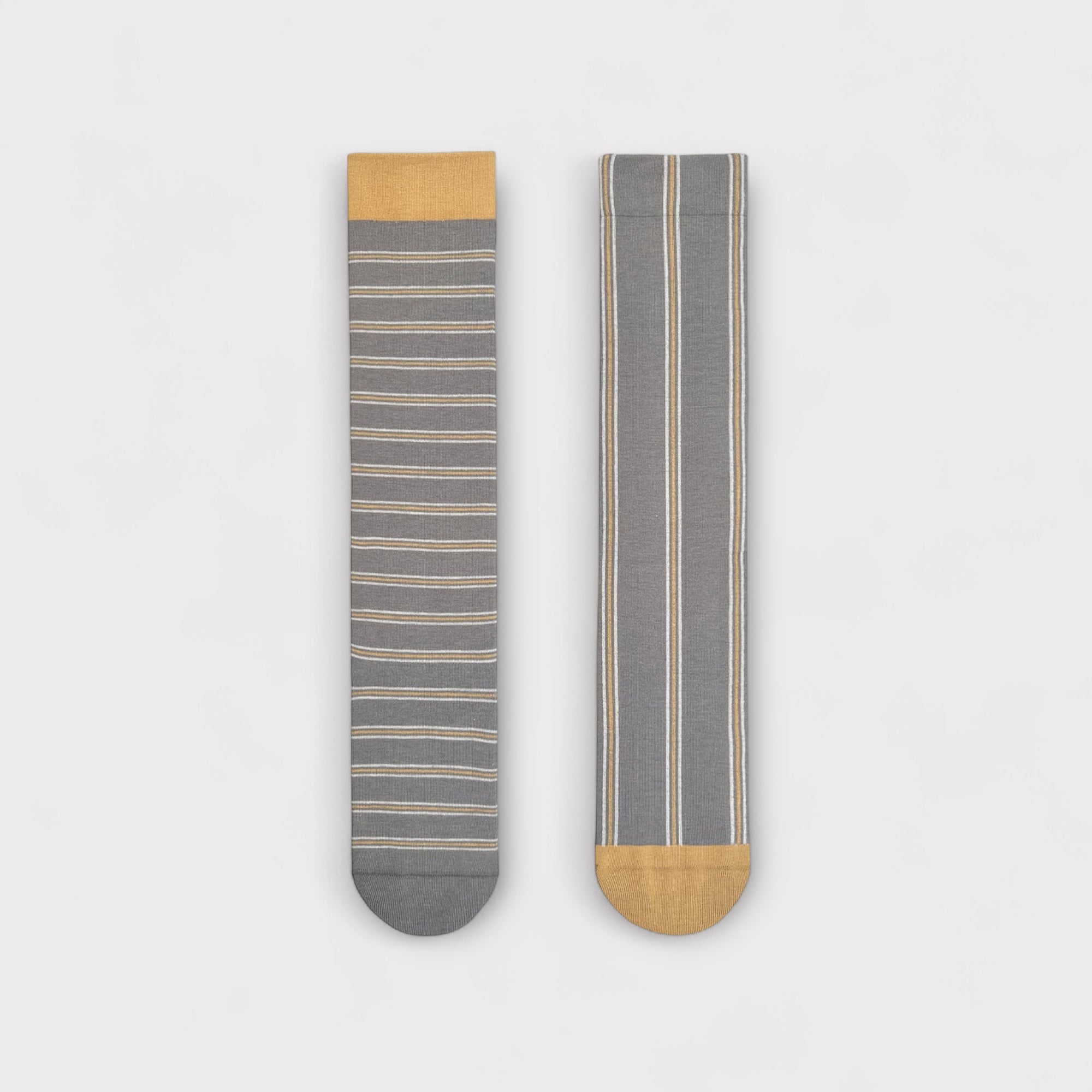 Calzino lungo al ginocchio in cotone e modal, design spaiato (righe diverse sui due piedi); fine, traspirante e super trendy. Base grigio fumo con punte/polsino camel. Made in Japan.