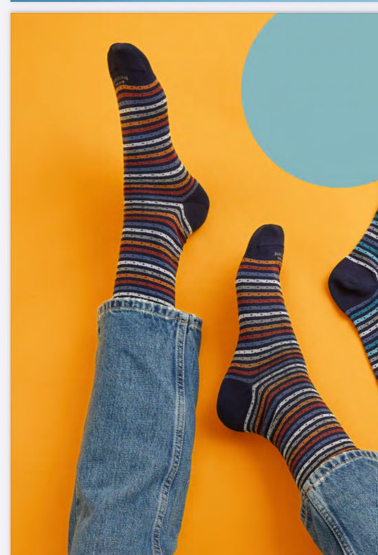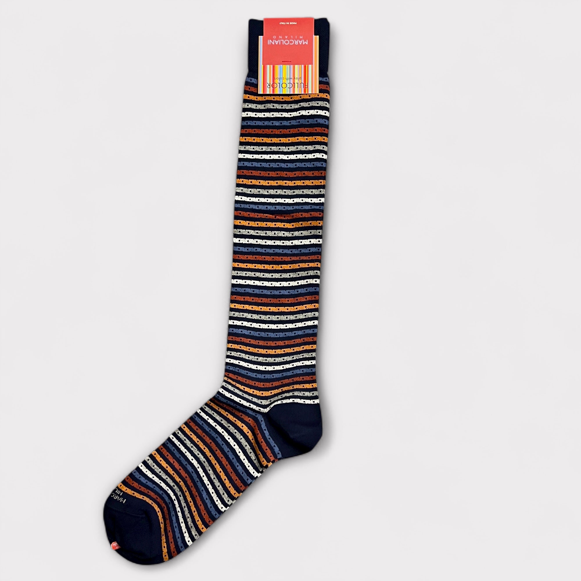 Calzini lunghi uomo in cotone a righe blu-coccio. Eleganti, resistenti e confortevoli, Made in Italy. Taglia unica 41/45.