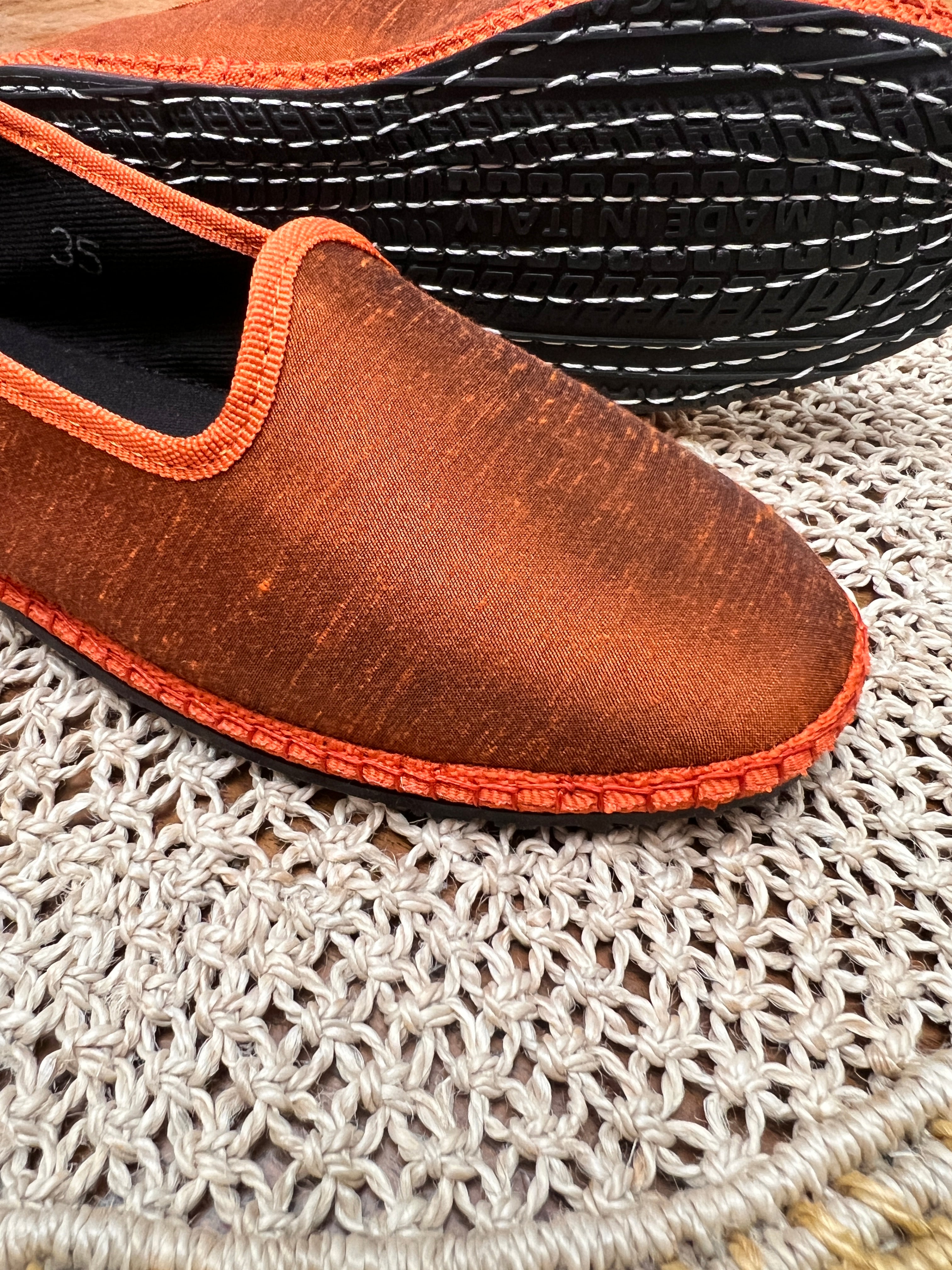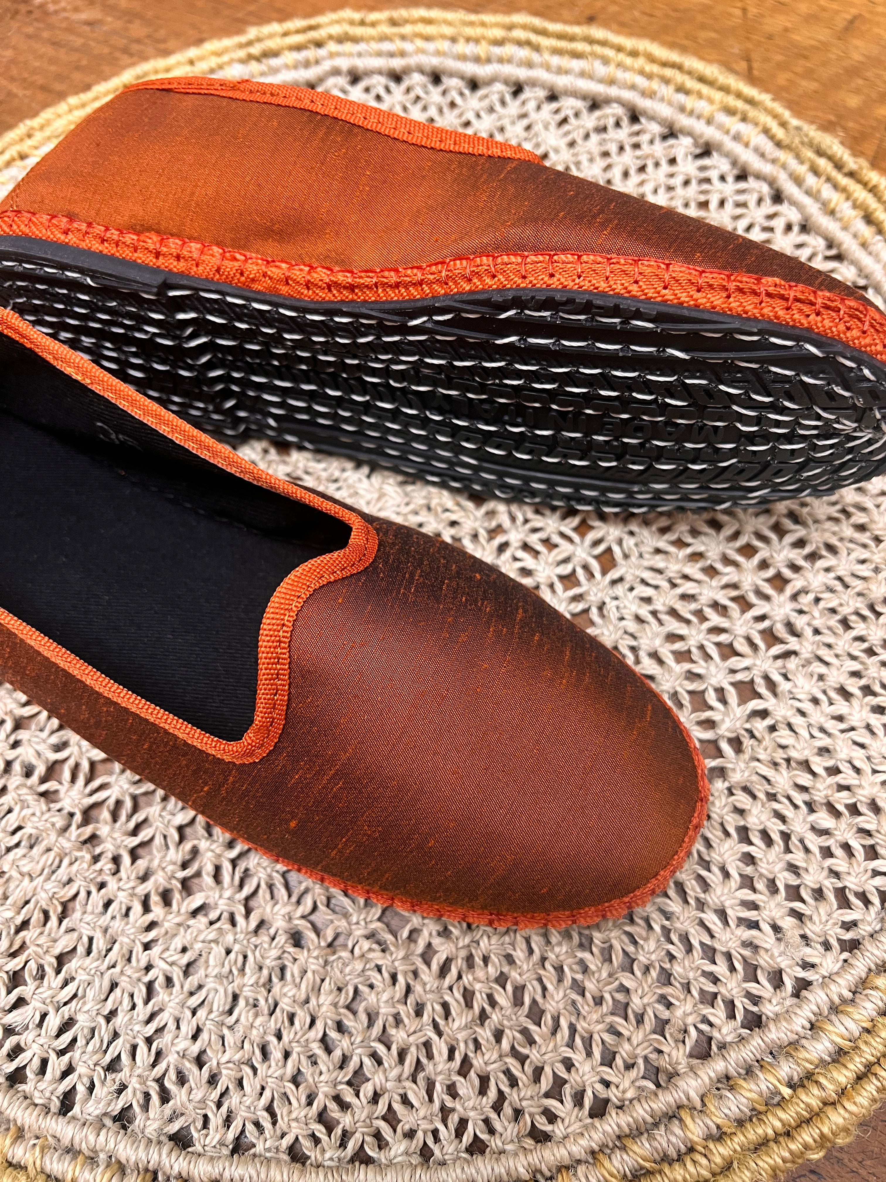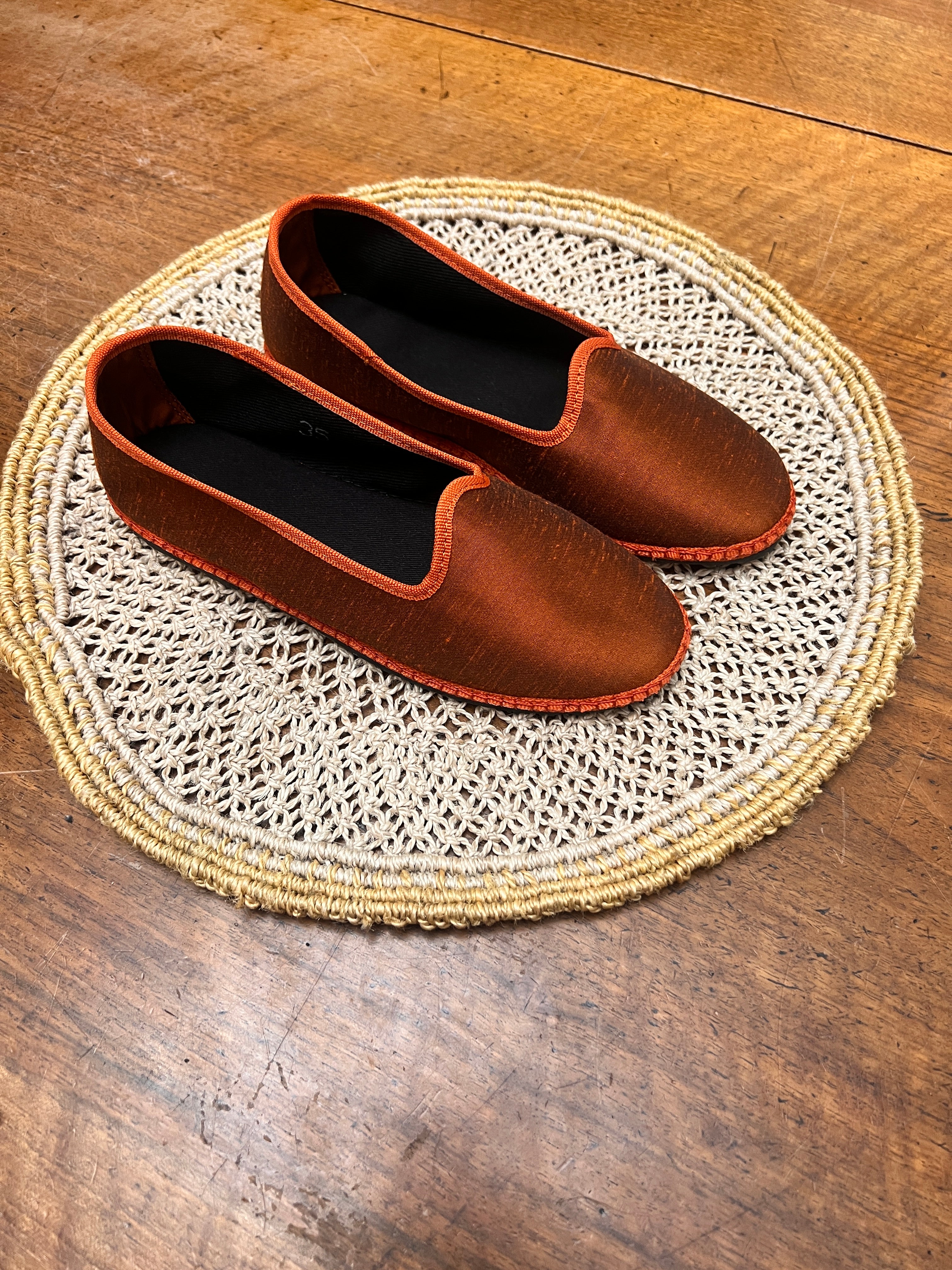 Friulane artigianali in seta shantung color bruciato, cucite a mano in Friuli. Suola in gomma. Eleganti, sostenibili, 100% Made in Italy.